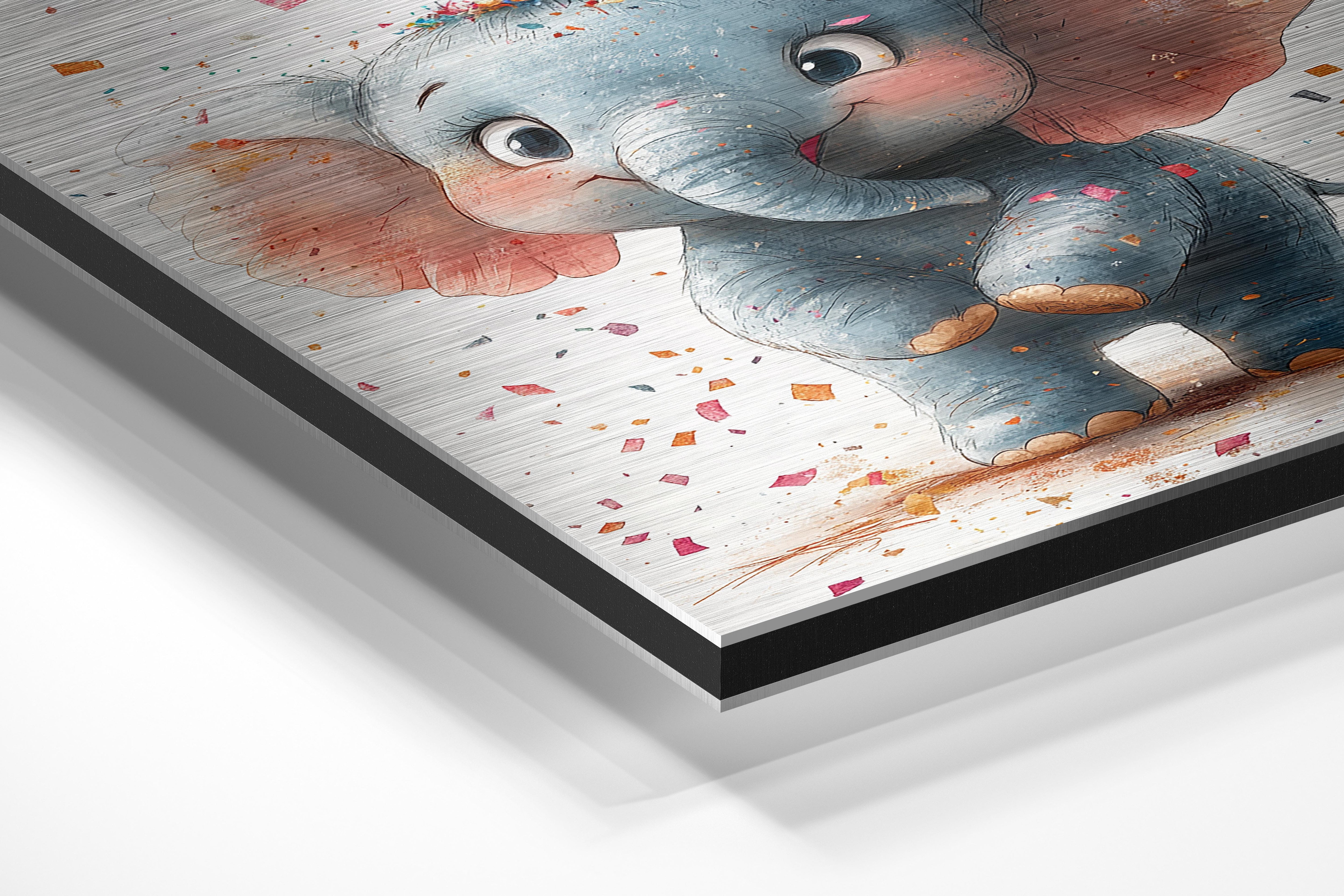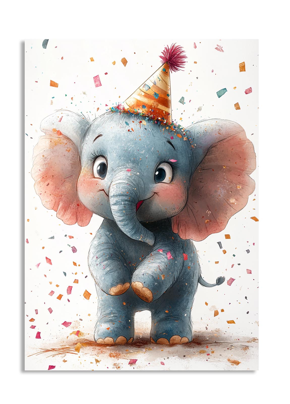 A cheerful elephant wearing a party hat is the centerpiece of this delightful artwork, surrounded by colorful confetti. The elephant’s expressive eyes and playful pose bring a sense of celebration and joy. Ideal for birthdays or party-themed spaces, this illustration adds an instant smile to anyone who sees it.