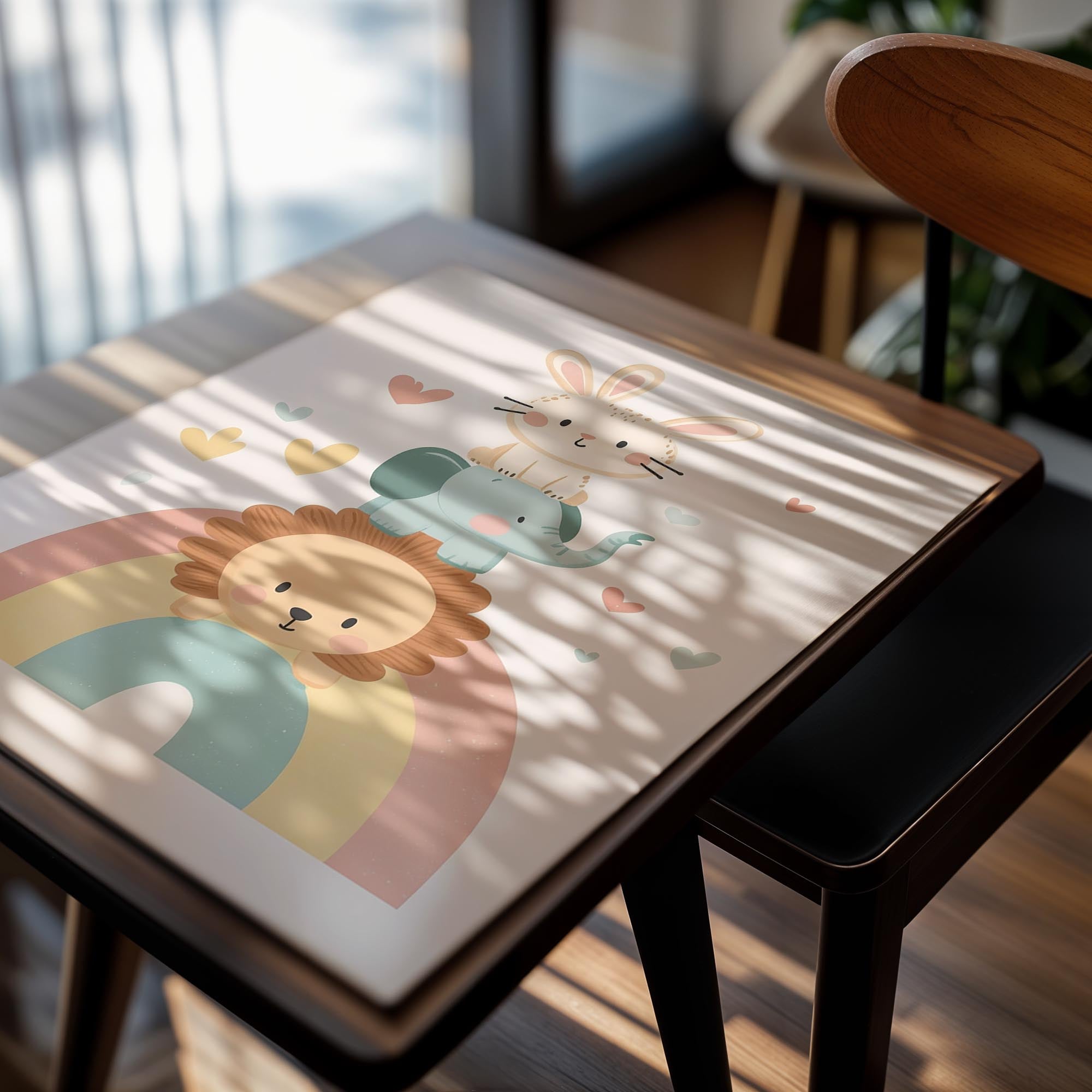 A delightful artwork showcasing a rabbit, elephant, and lion stacked in a playful manner atop a pastel rainbow. Surrounded by heart accents, this piece exudes warmth and love, making it ideal for nurseries or children’s spaces. The minimalist design and soft colors ensure a calming yet cheerful presence, perfect for creating a nurturing and happy environment. Its charming composition makes it suitable for young children while appealing to parents seeking soothing decor.