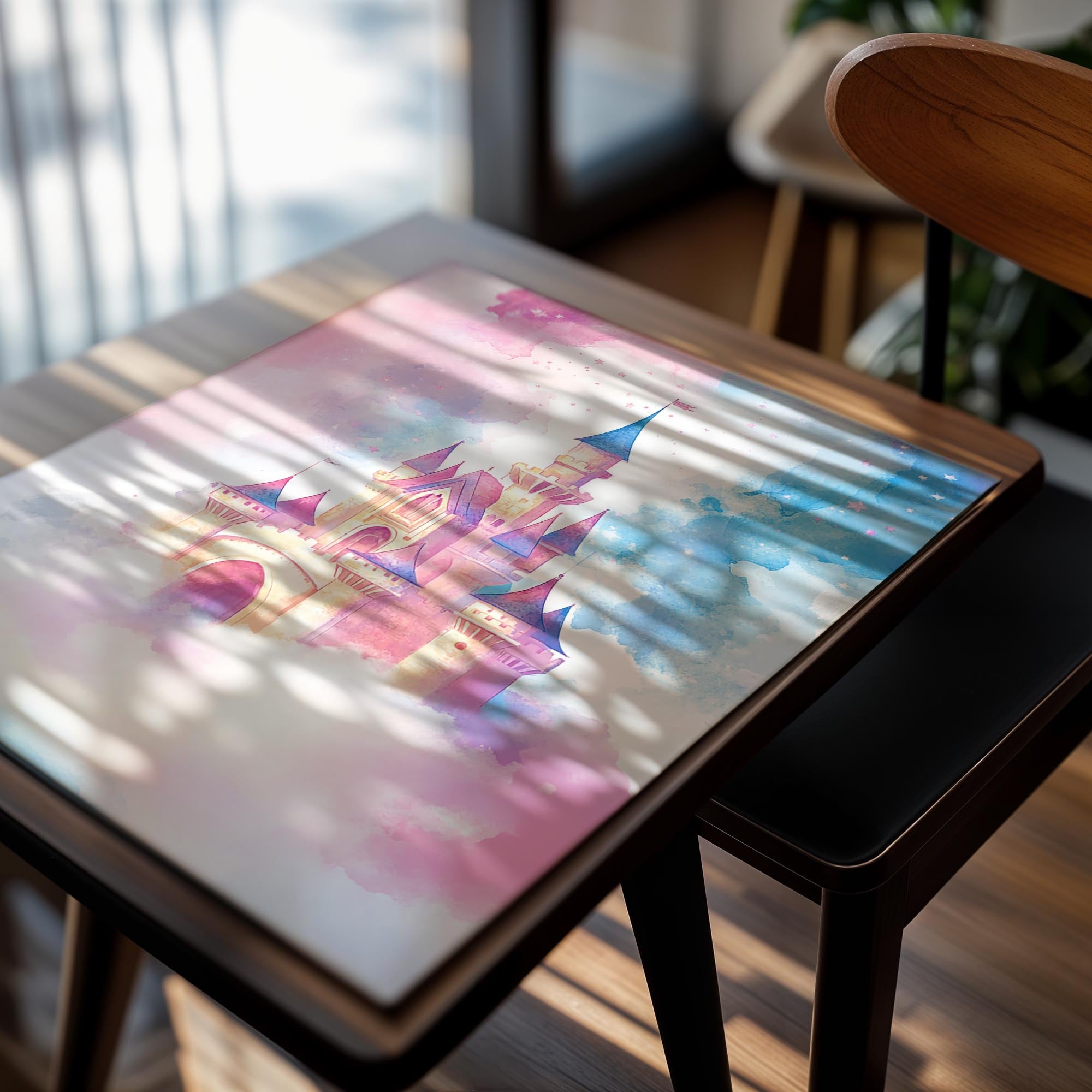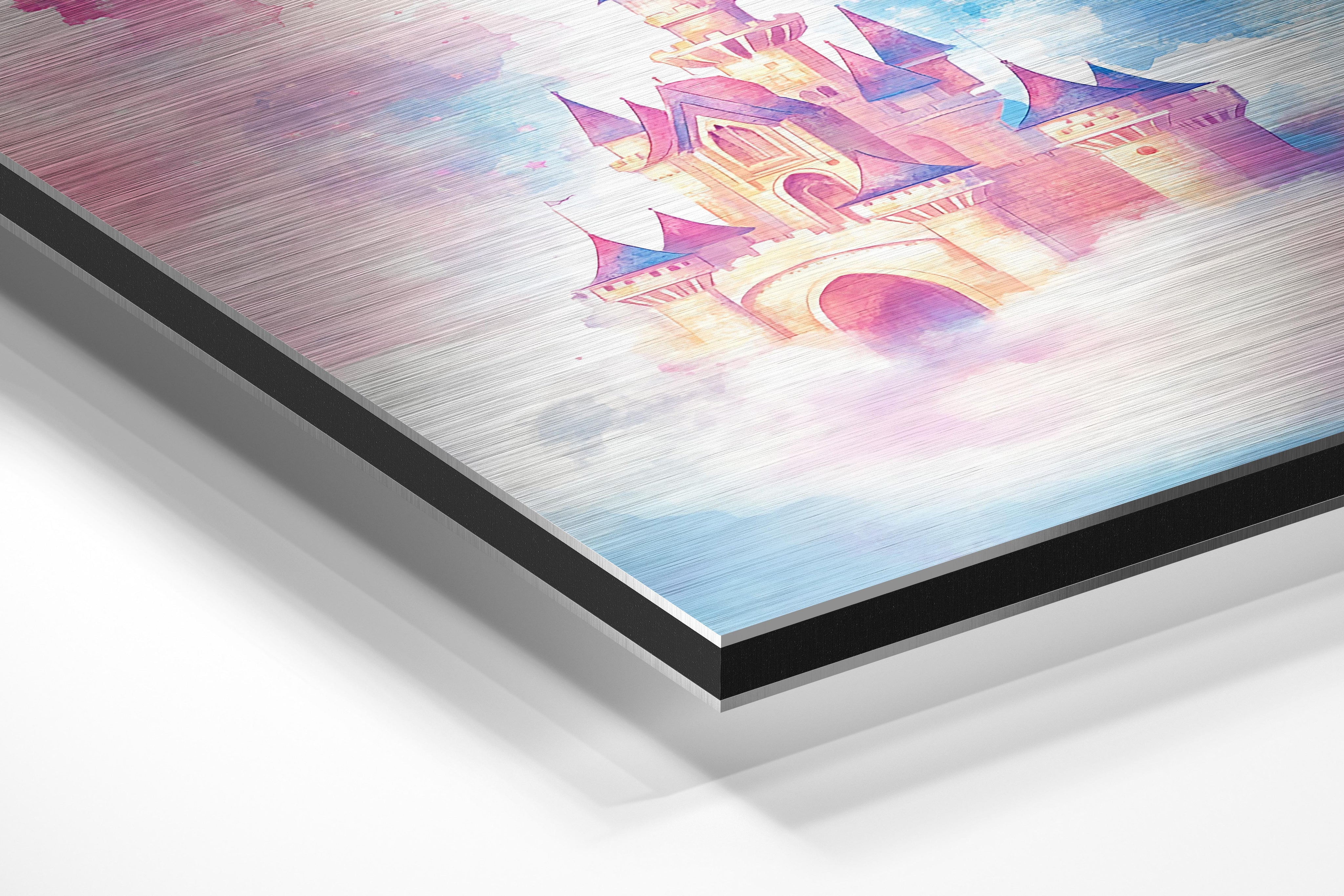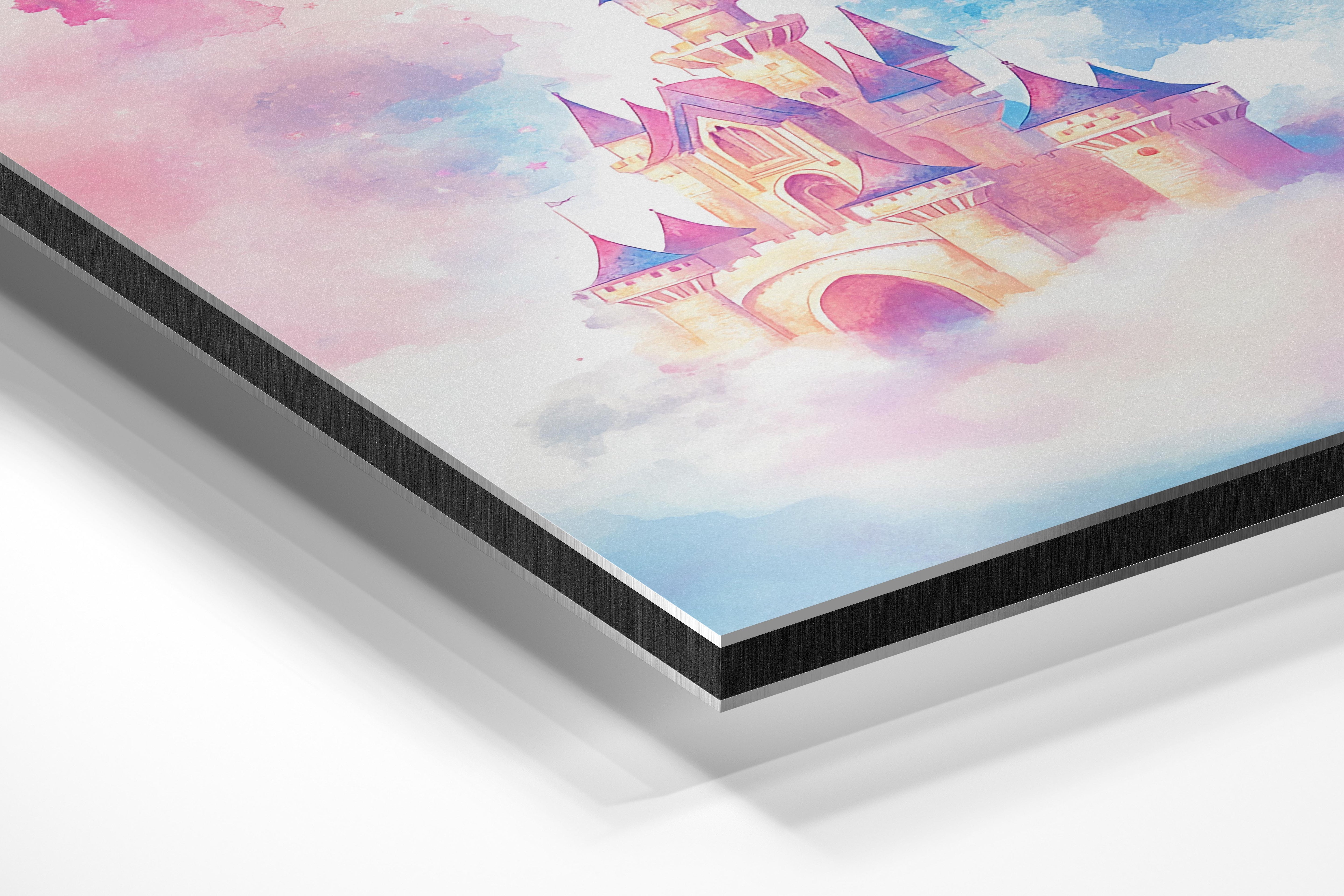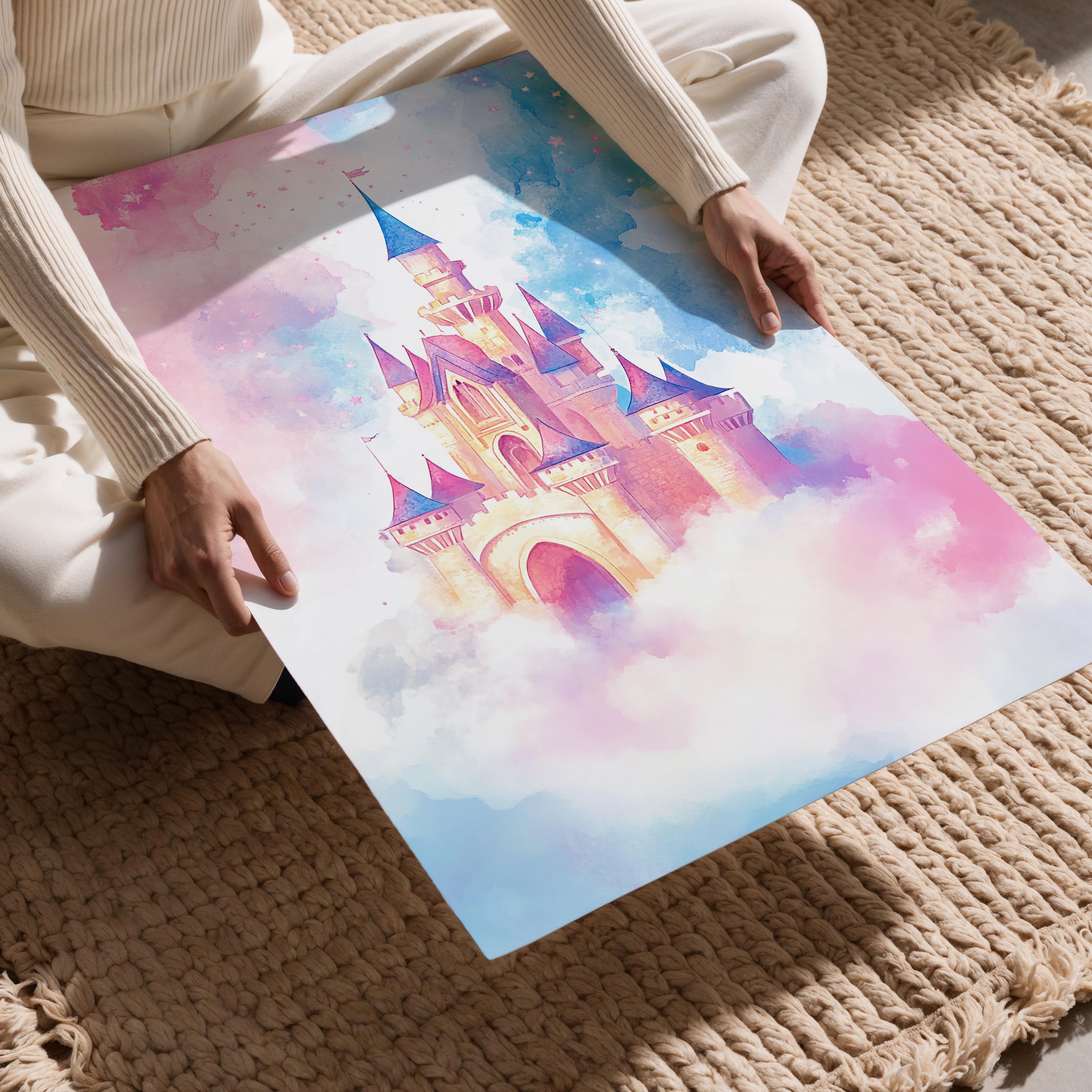 This enchanting image features a dreamy castle perched amidst fluffy pastel clouds in shades of pink and blue. The castle’s turrets and flags stretch toward a sparkling sky, evoking a magical fairytale atmosphere. The watercolor effect enhances its ethereal quality, making it a delightful addition to any princess-themed room or fairytale-inspired decor. This piece beautifully captures the essence of wonder and fantasy, transporting viewers to a serene, magical realm where dreams come to life. Ideal for children’s spaces or fantasy enthusiasts.