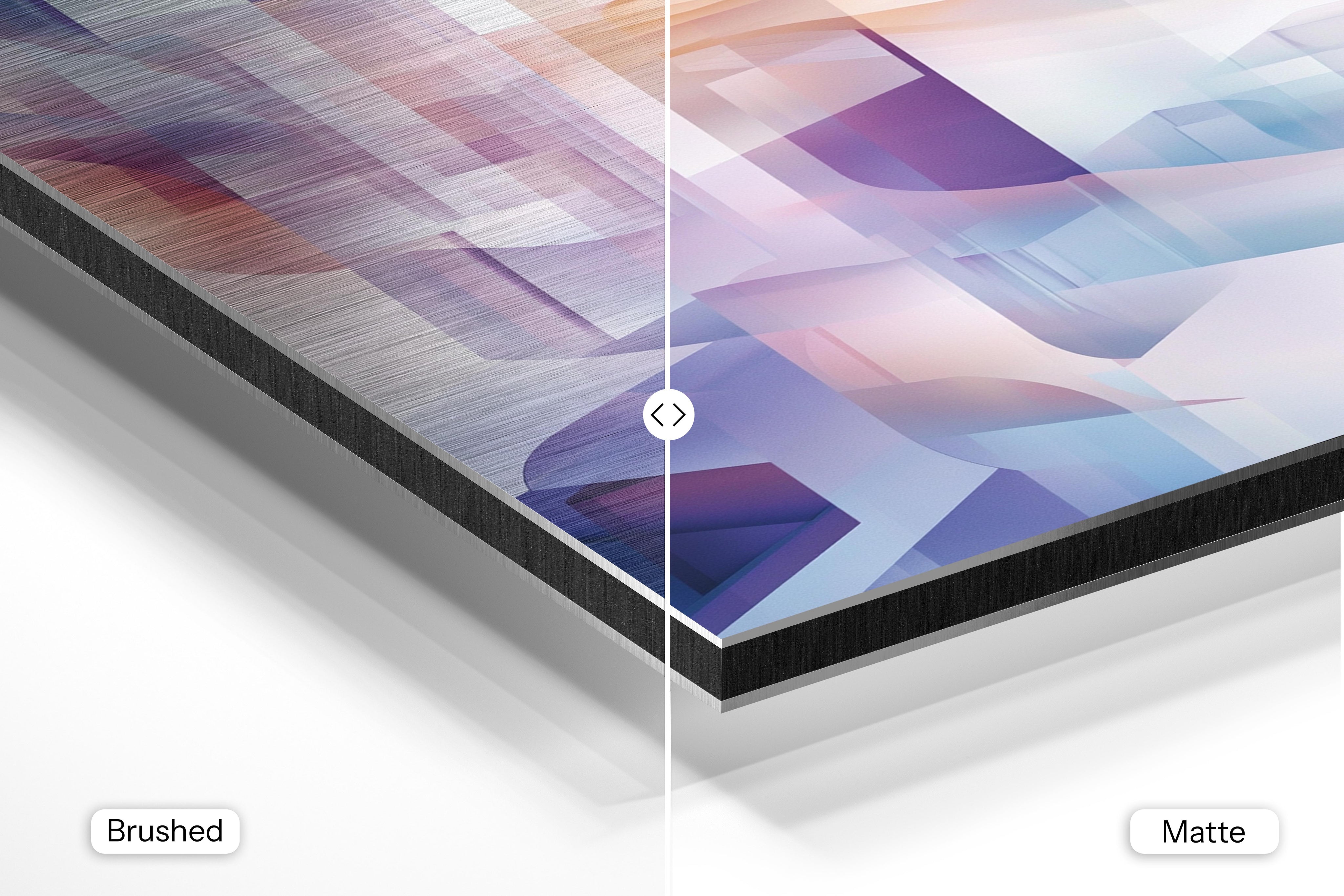 - Brushed Aluminum, on the other hand, features a raw metallic texture with visible brush strokes. Whites and highlights in your image let the silver surface show through, adding a dramatic, shimmering effect. Ideal for black-and-white images, minimalist designs, or abstract art, it creates a bold, industrial vibe with a modern edge.