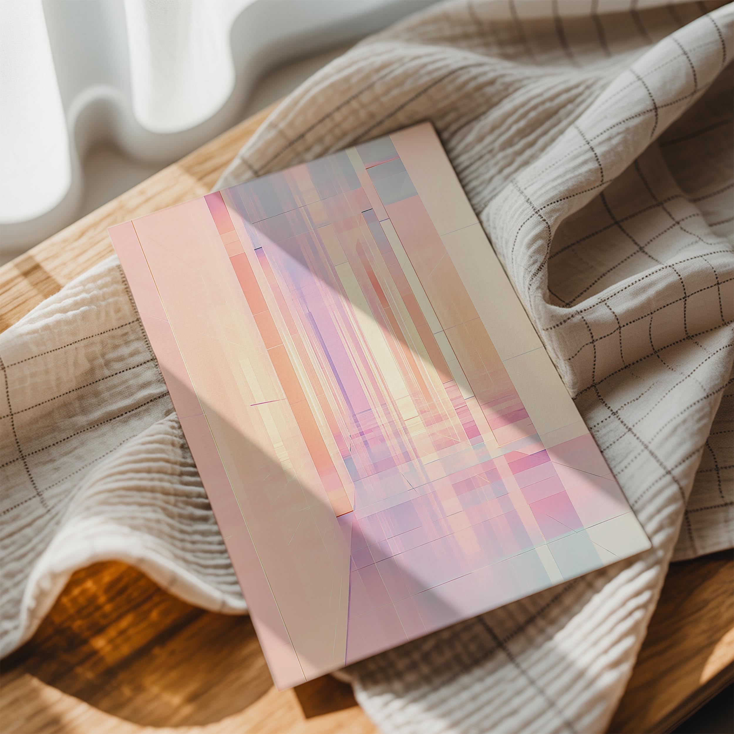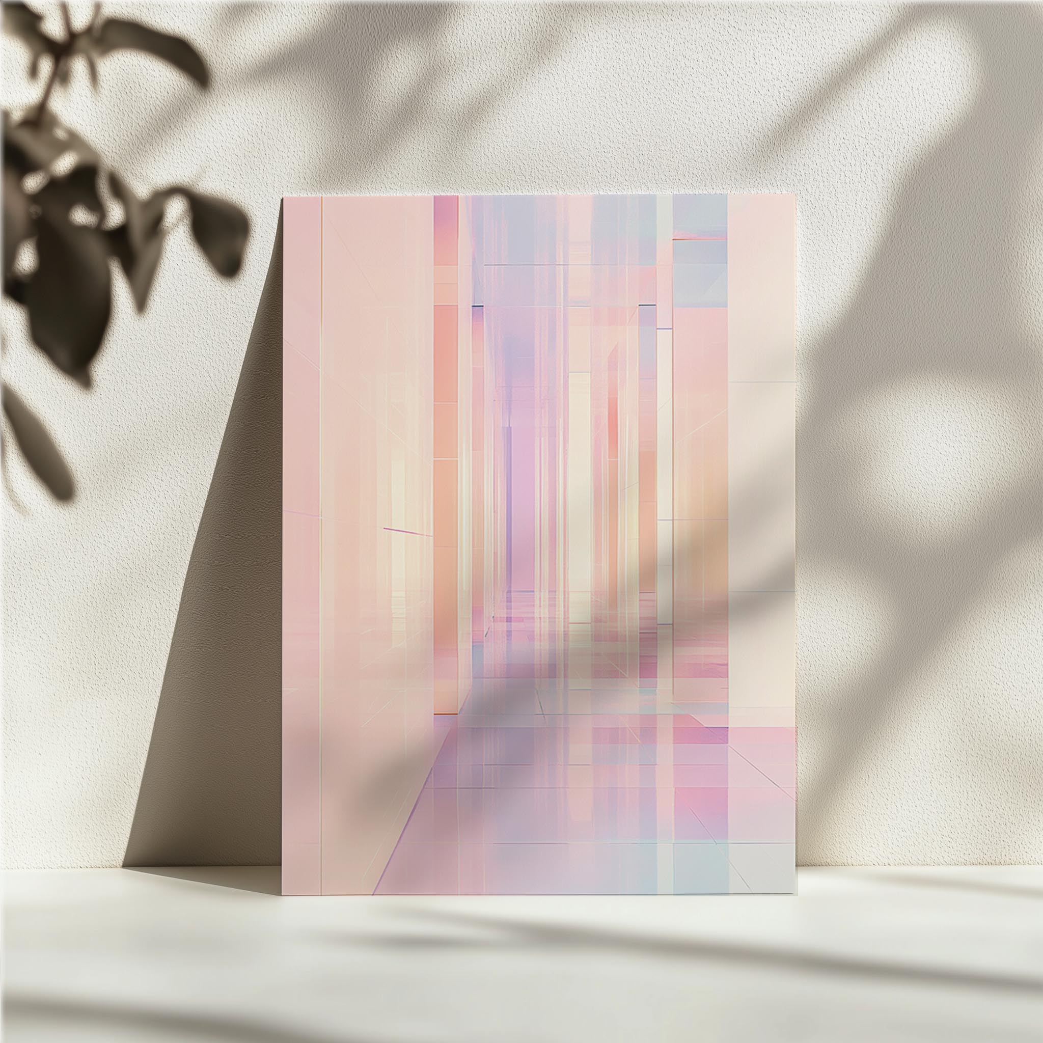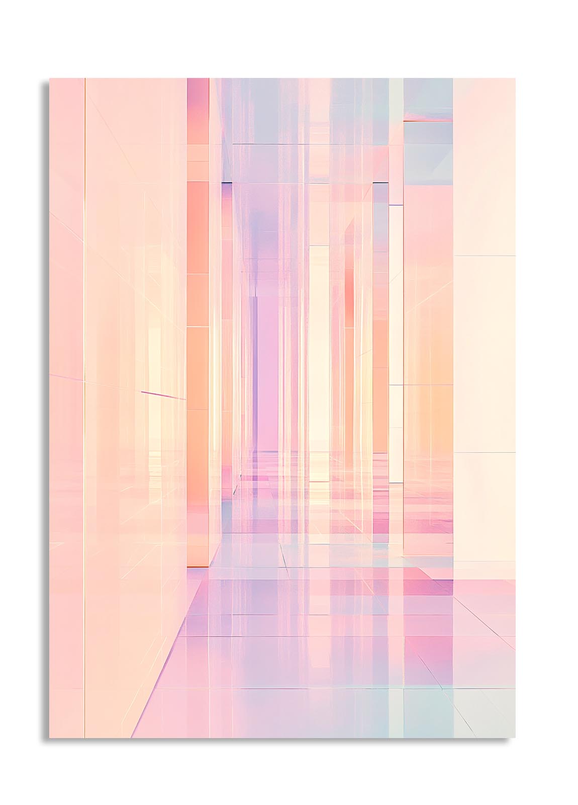 This surreal artwork depicts a hallway drenched in soft pastel hues, creating a dreamlike sense of infinity. The interplay of reflections and light adds depth, making the space appear expansive and calm. This piece is perfect for contemporary interiors, particularly in creative or meditative environments like studios, galleries, or relaxation rooms.