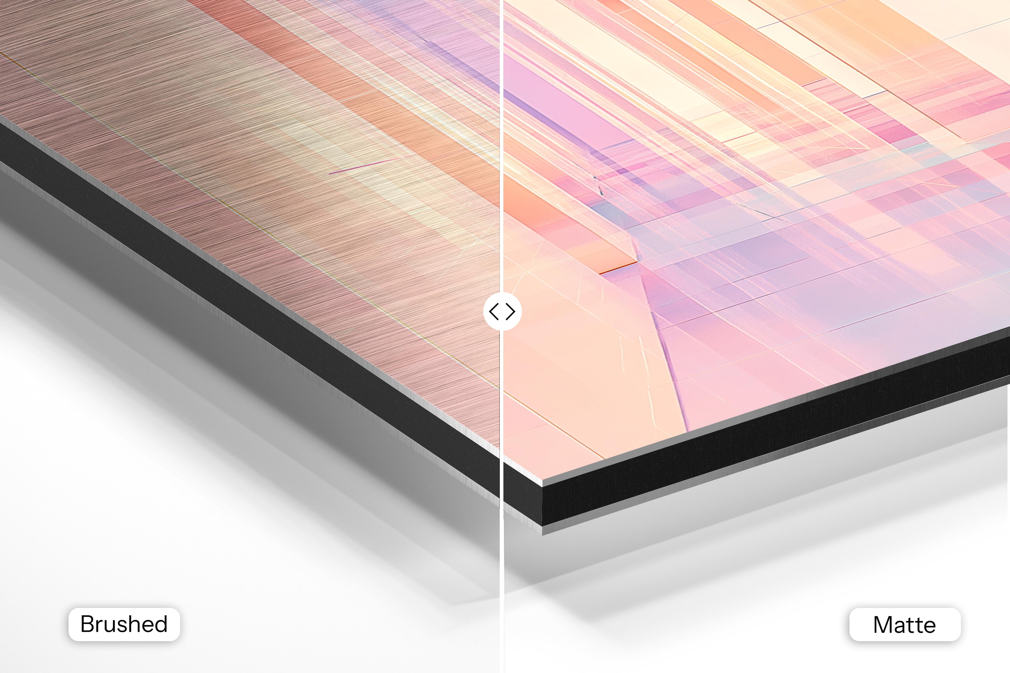 - Brushed Aluminum, on the other hand, features a raw metallic texture with visible brush strokes. Whites and highlights in your image let the silver surface show through, adding a dramatic, shimmering effect. Ideal for black-and-white images, minimalist designs, or abstract art, it creates a bold, industrial vibe with a modern edge.