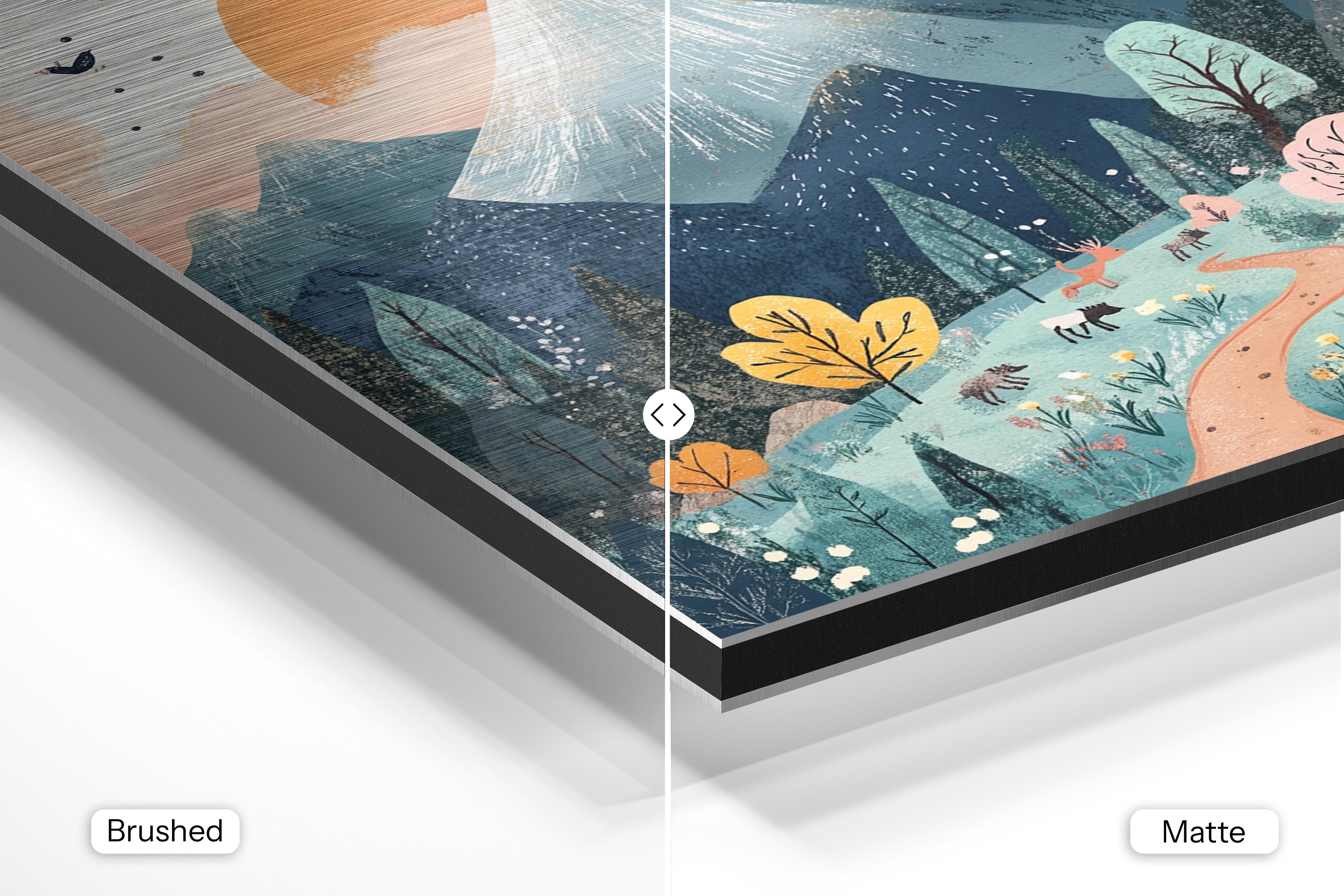 - Matte Aluminum offers a smooth, bright white surface that delivers crisp details and vibrant, true-to-life colors. With its non-reflective finish and subtle silky sheen, it’s perfect for photography, portraits, and colorful artwork—bringing a clean, polished look to any interior.