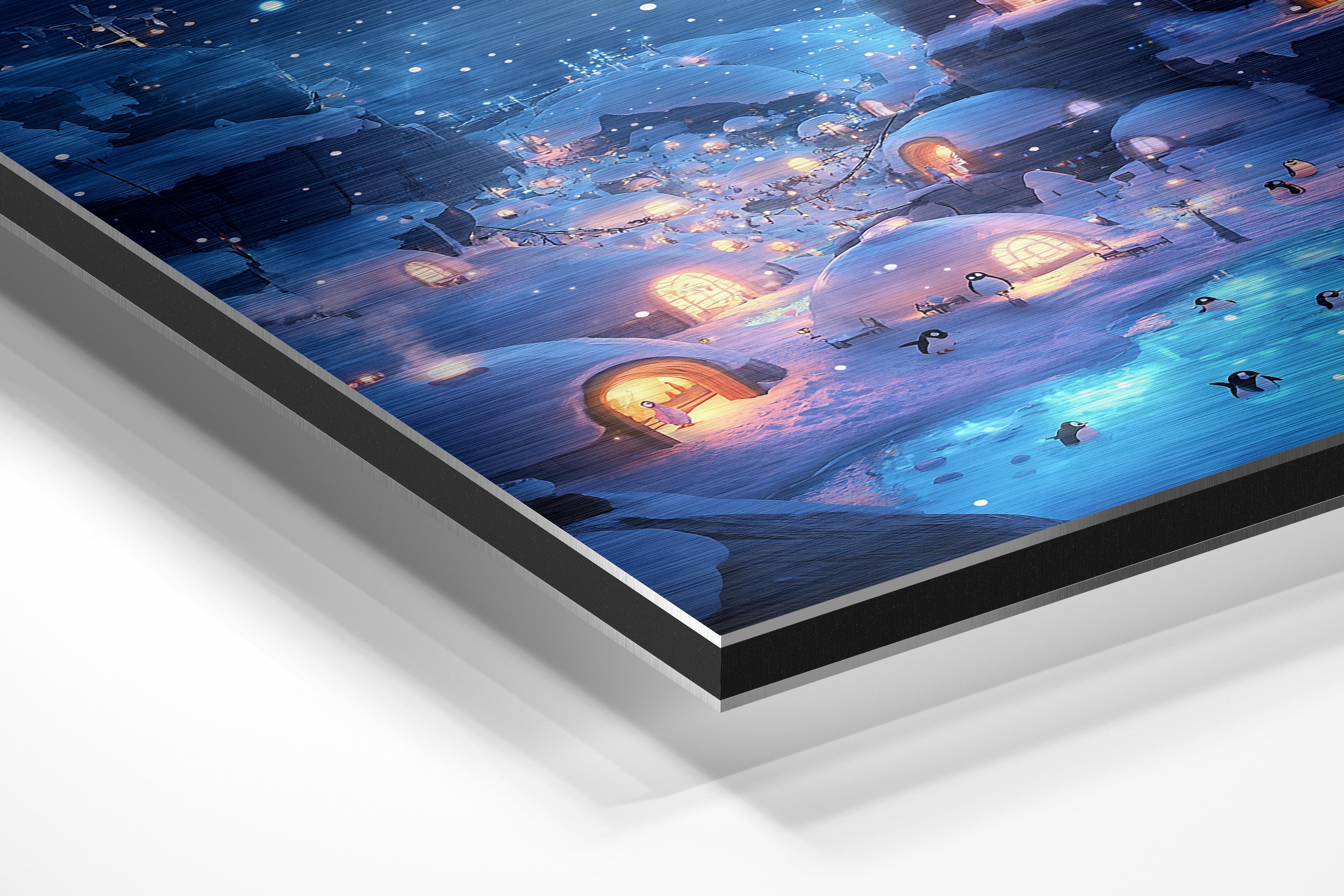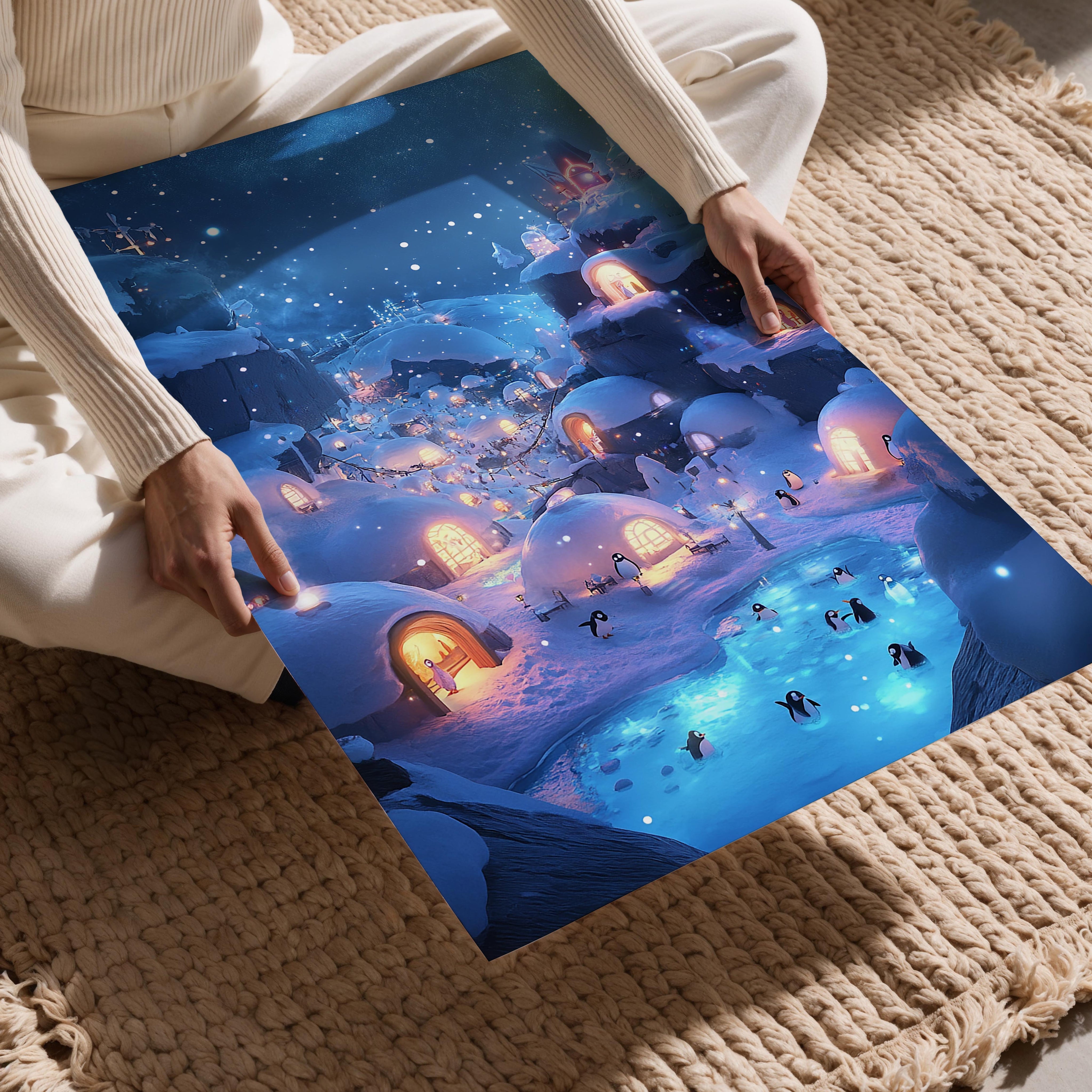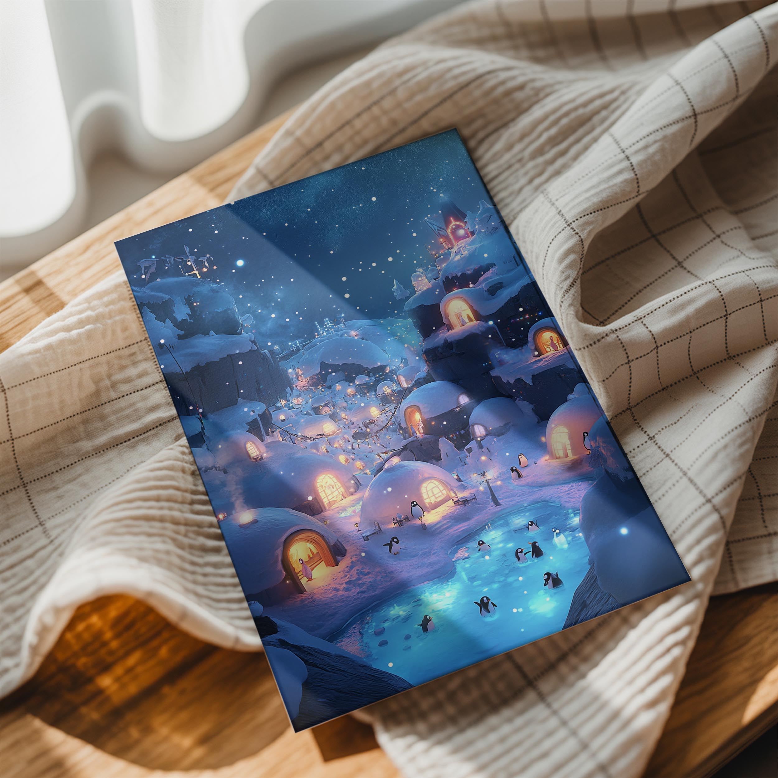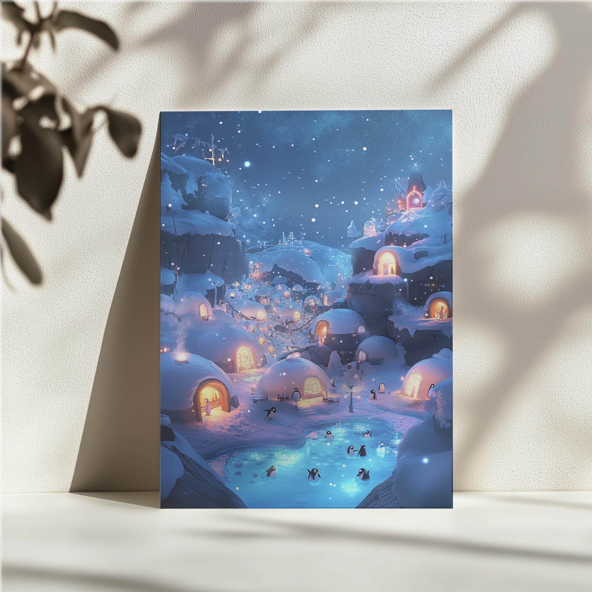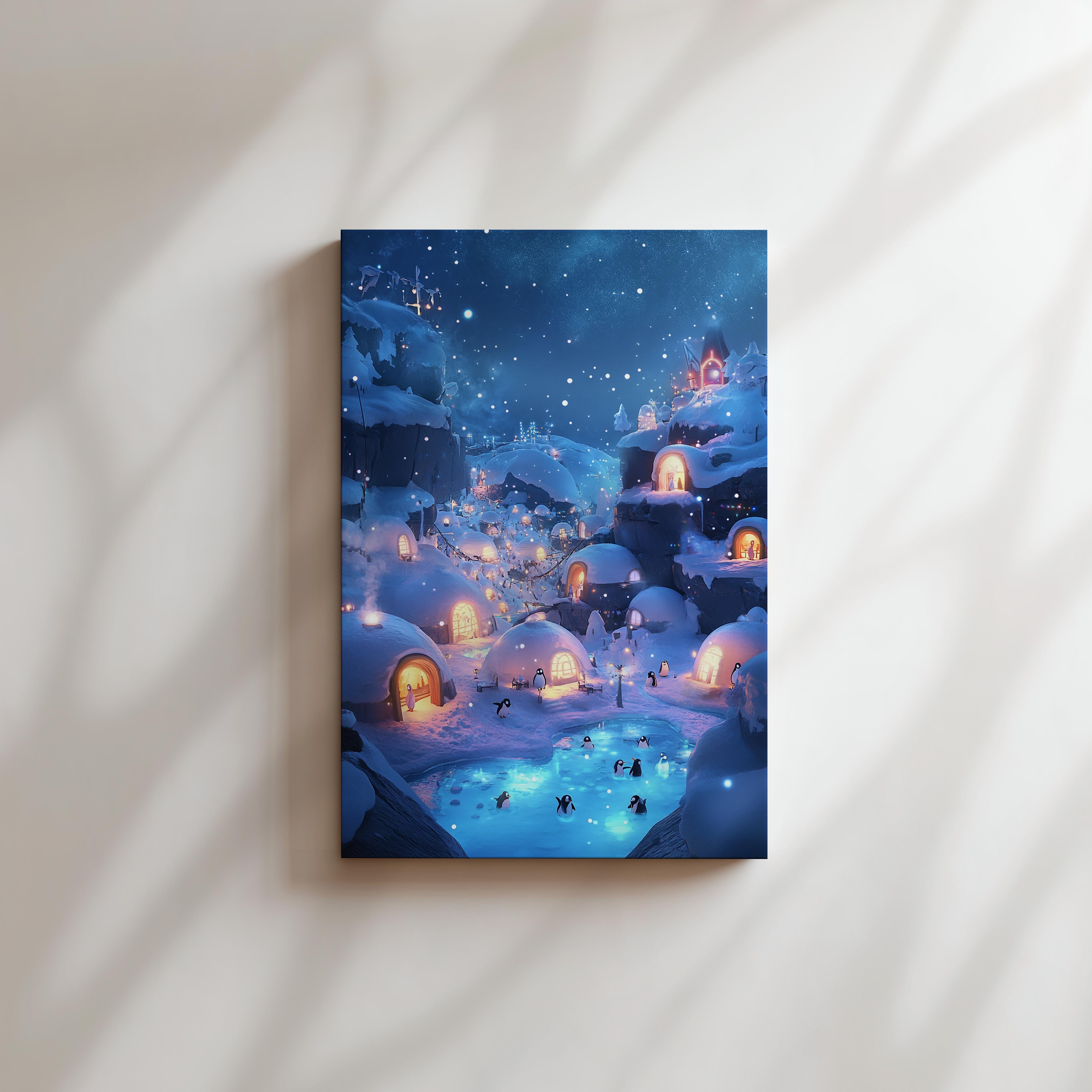 A magical winter village filled with igloos, penguins, and twinkling lights. The soft blues and glowing accents make this artwork ideal for seasonal décor, children’s rooms, or anyone who loves whimsical winter scenes. It’s a cozy celebration of community and wonder.