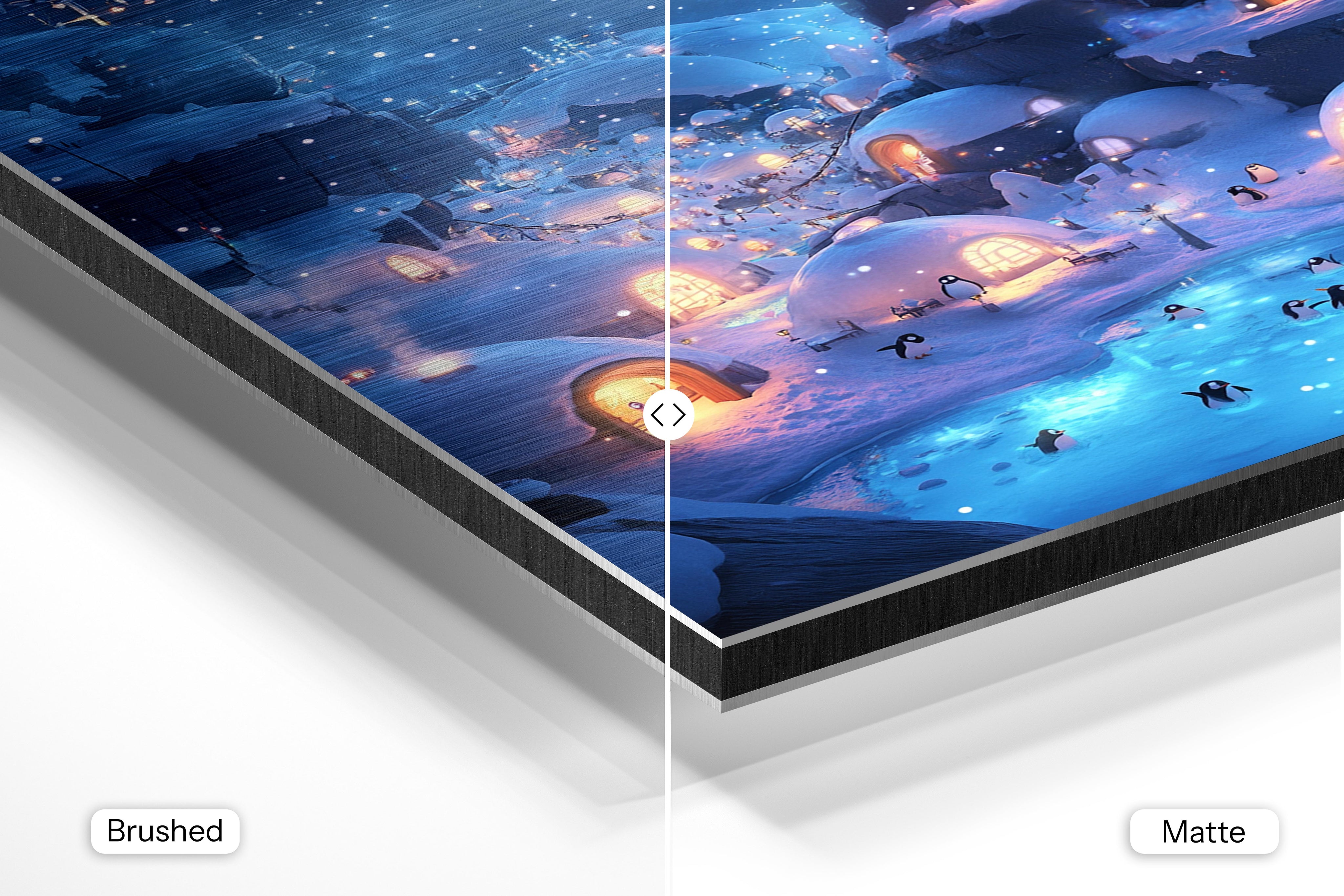 - Brushed Aluminum, on the other hand, features a raw metallic texture with visible brush strokes. Whites and highlights in your image let the silver surface show through, adding a dramatic, shimmering effect. Ideal for black-and-white images, minimalist designs, or abstract art, it creates a bold, industrial vibe with a modern edge.