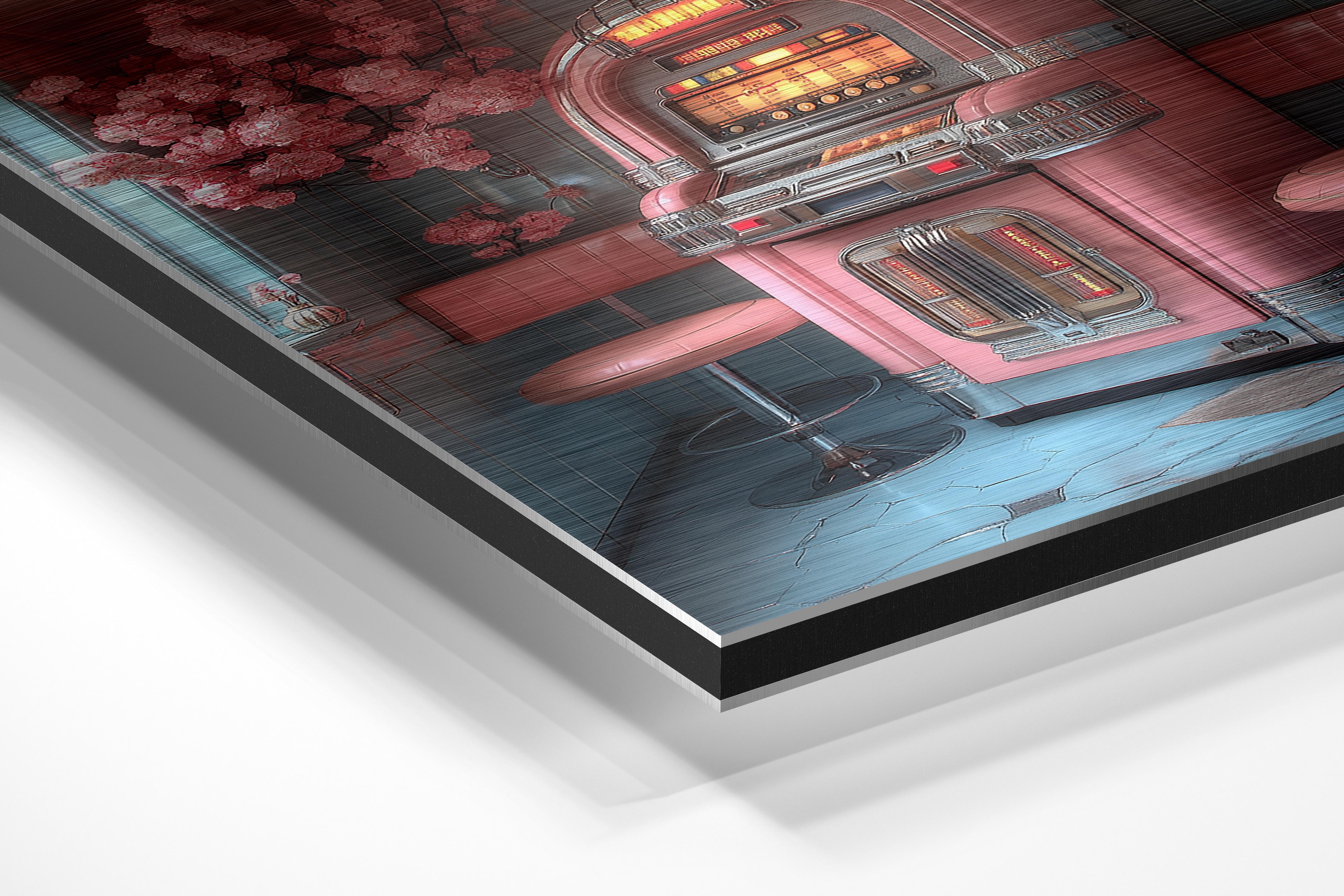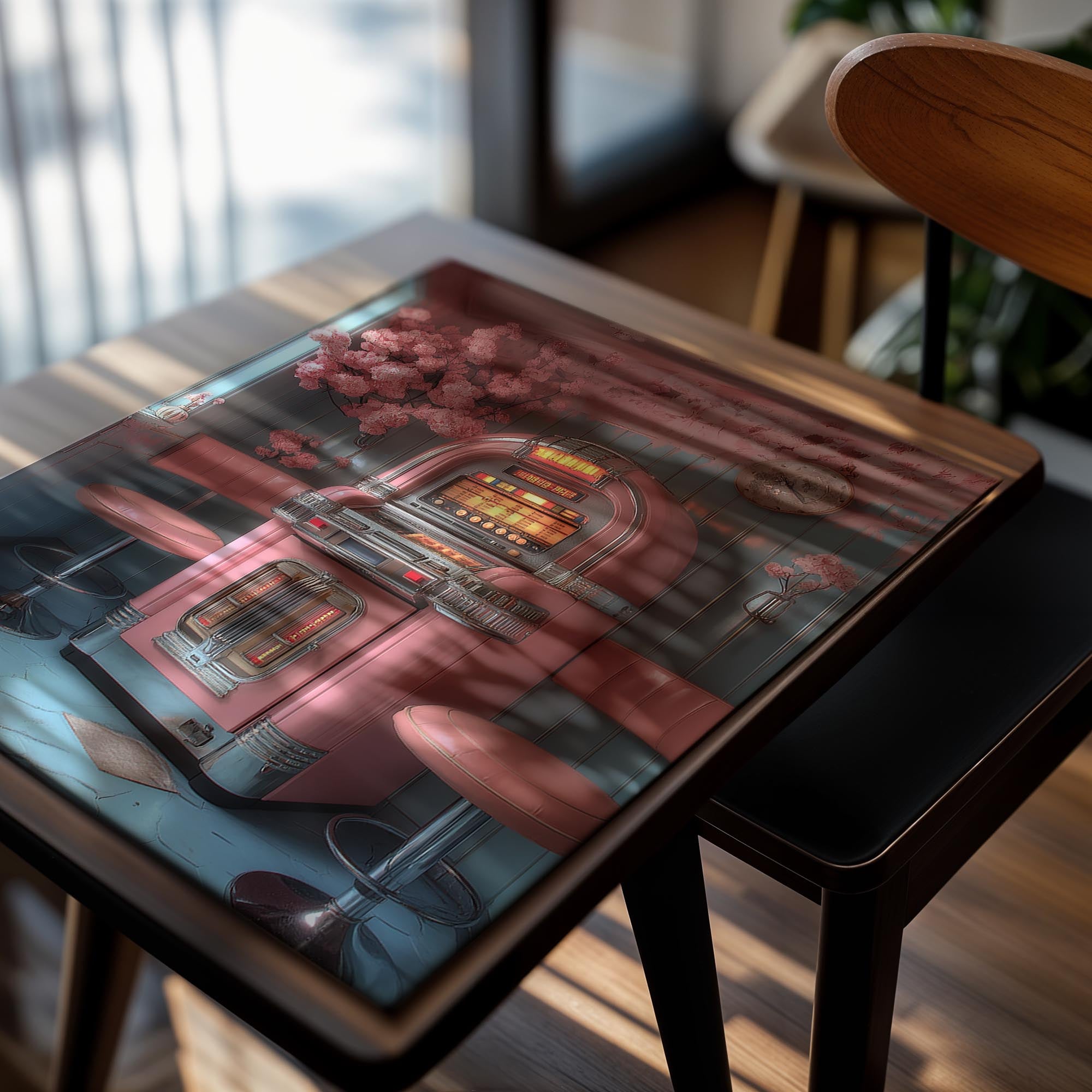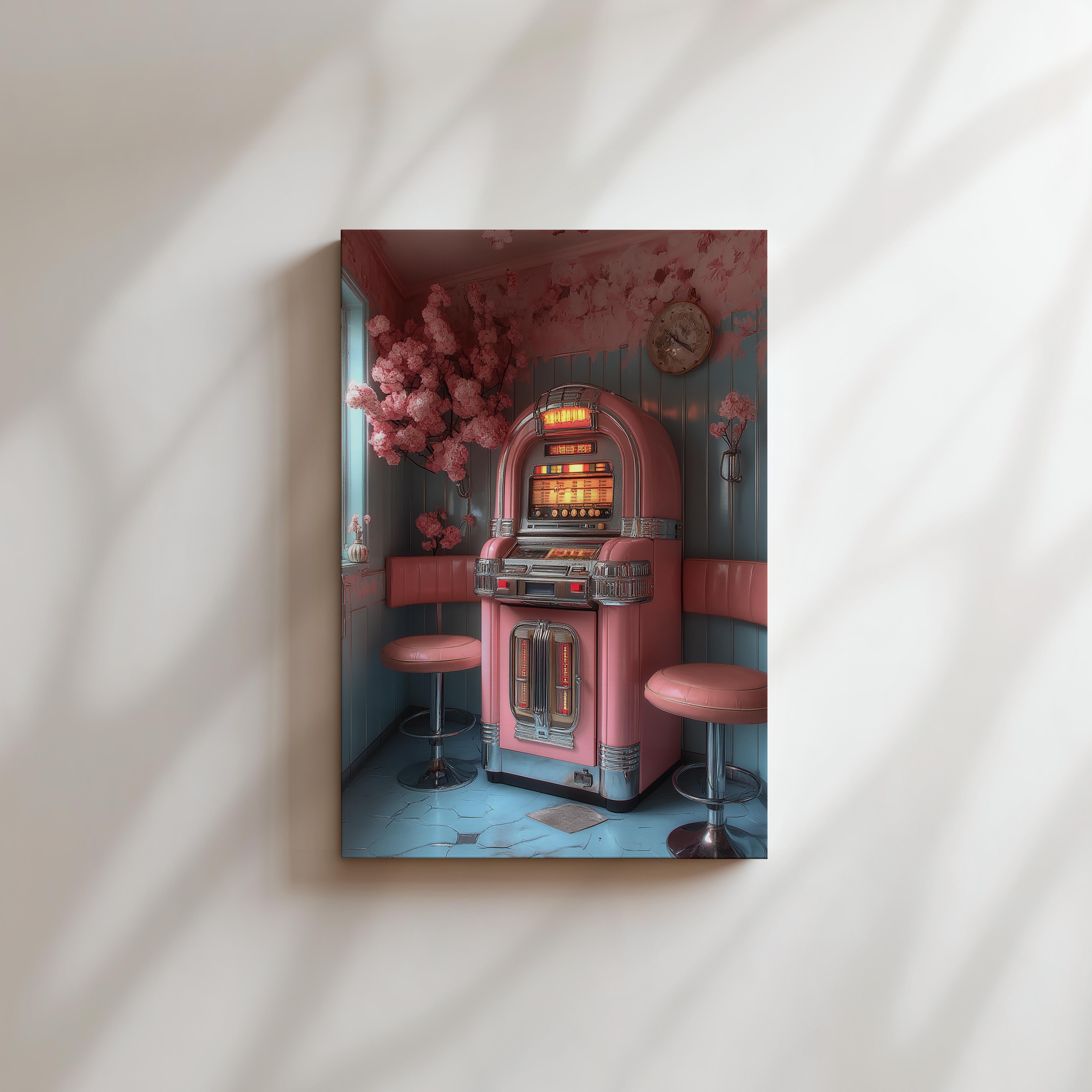 This soft, pastel-toned jukebox set in a charming corner exudes a whimsical and dreamy vibe. The pink and blue accents, along with blooming floral decor, create a serene yet retro ambiance. Perfect for bedrooms, cafes, or cozy reading nooks, this piece brings a touch of nostalgia and sweetness. Its delicate aesthetic makes it a versatile addition to interiors aiming for a vintage-meets-modern appeal.