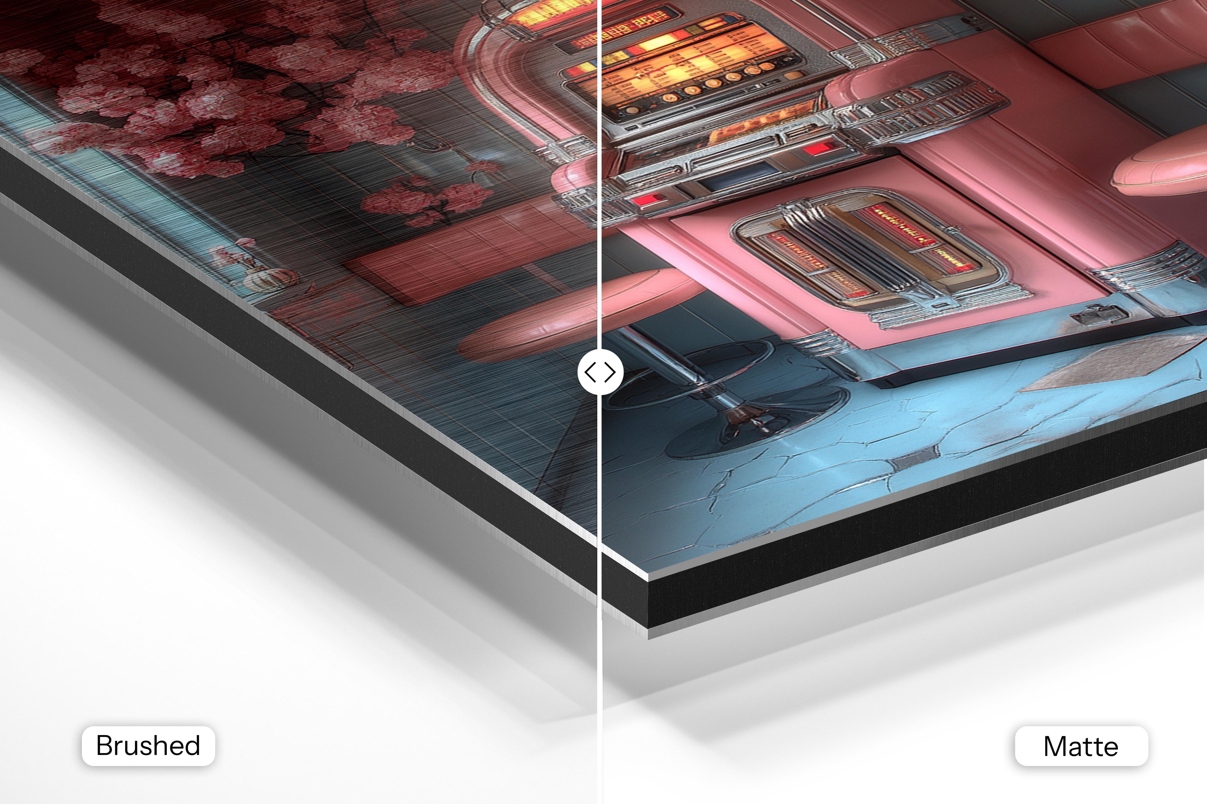 - Brushed Aluminum, on the other hand, features a raw metallic texture with visible brush strokes. Whites and highlights in your image let the silver surface show through, adding a dramatic, shimmering effect. Ideal for black-and-white images, minimalist designs, or abstract art, it creates a bold, industrial vibe with a modern edge.
