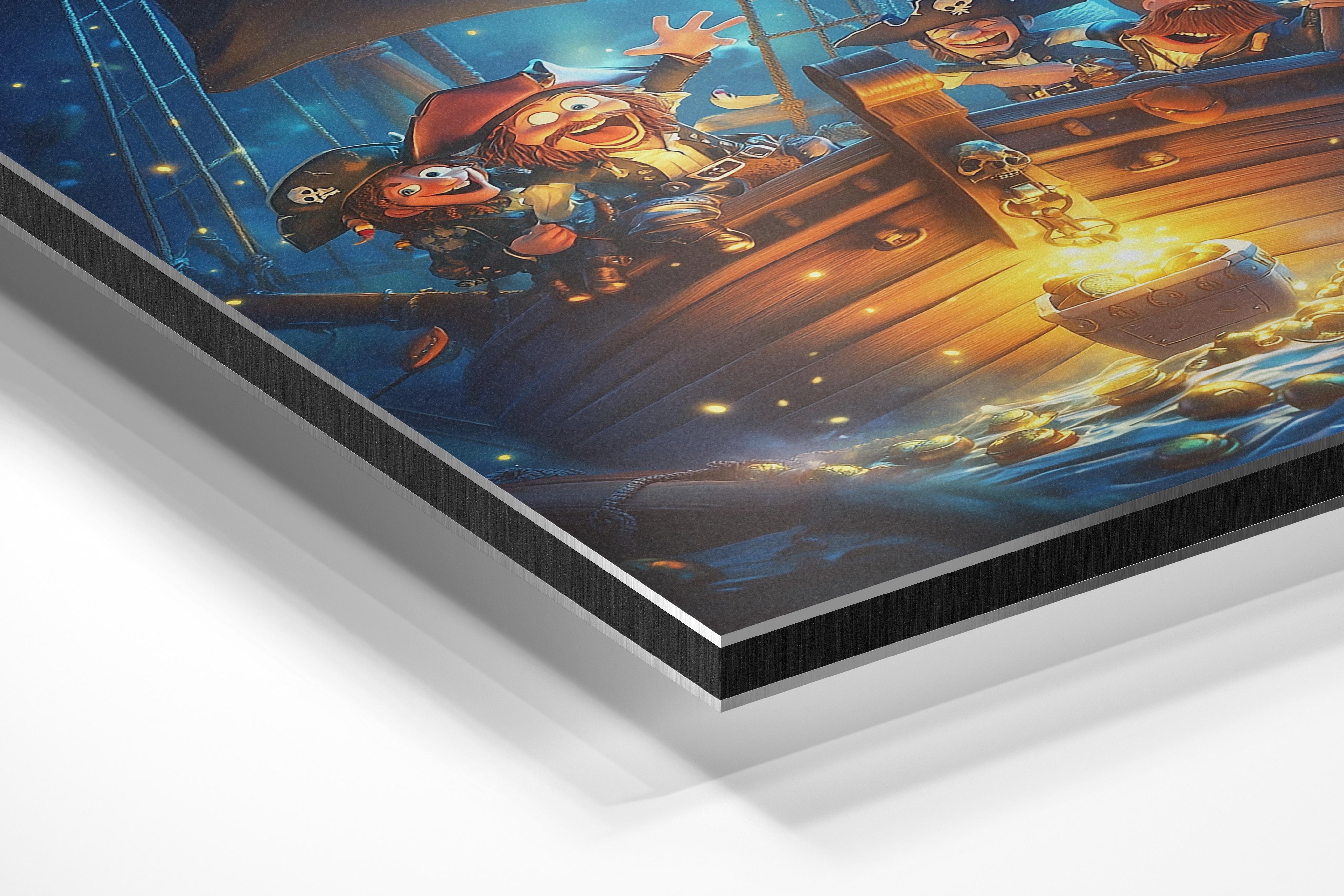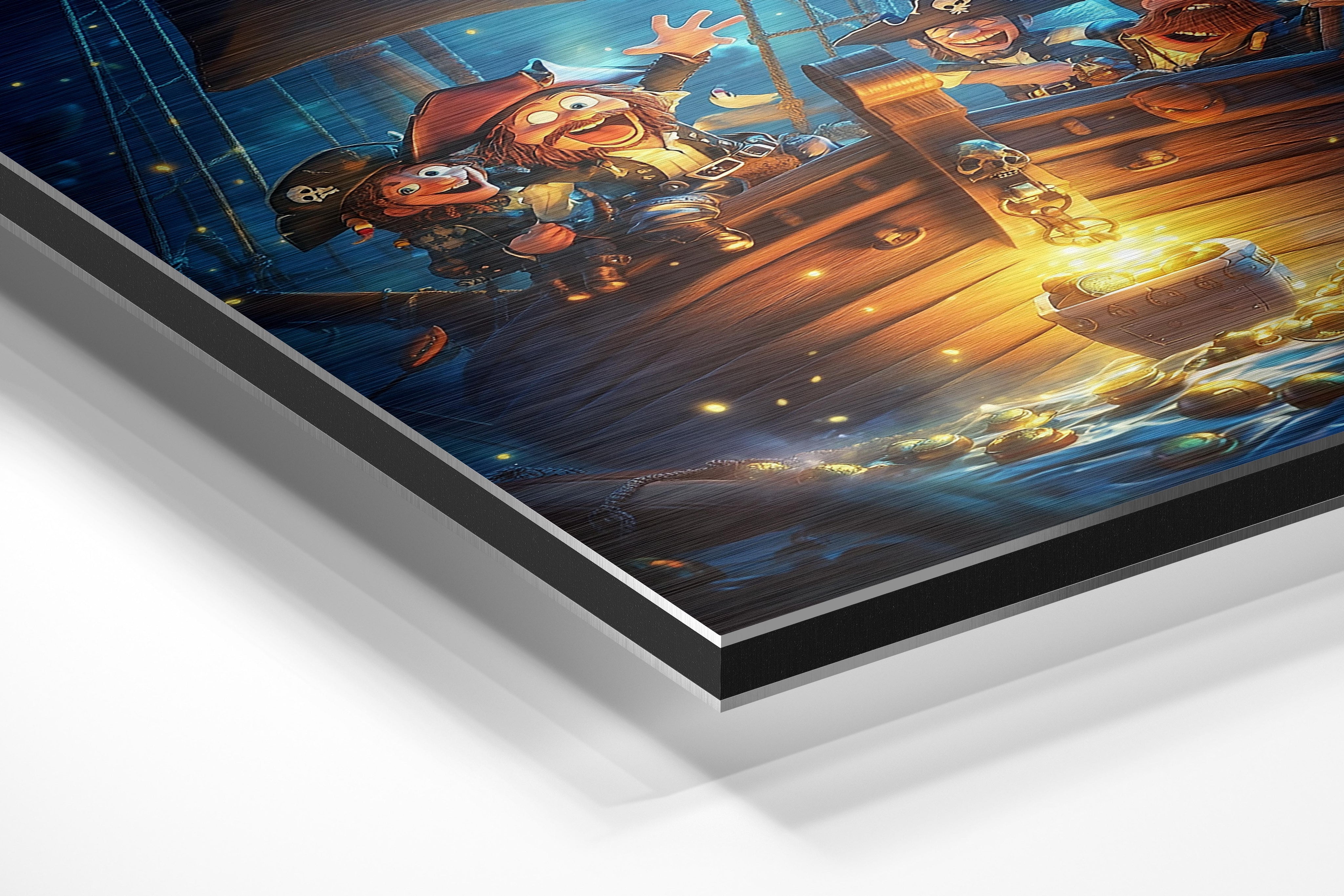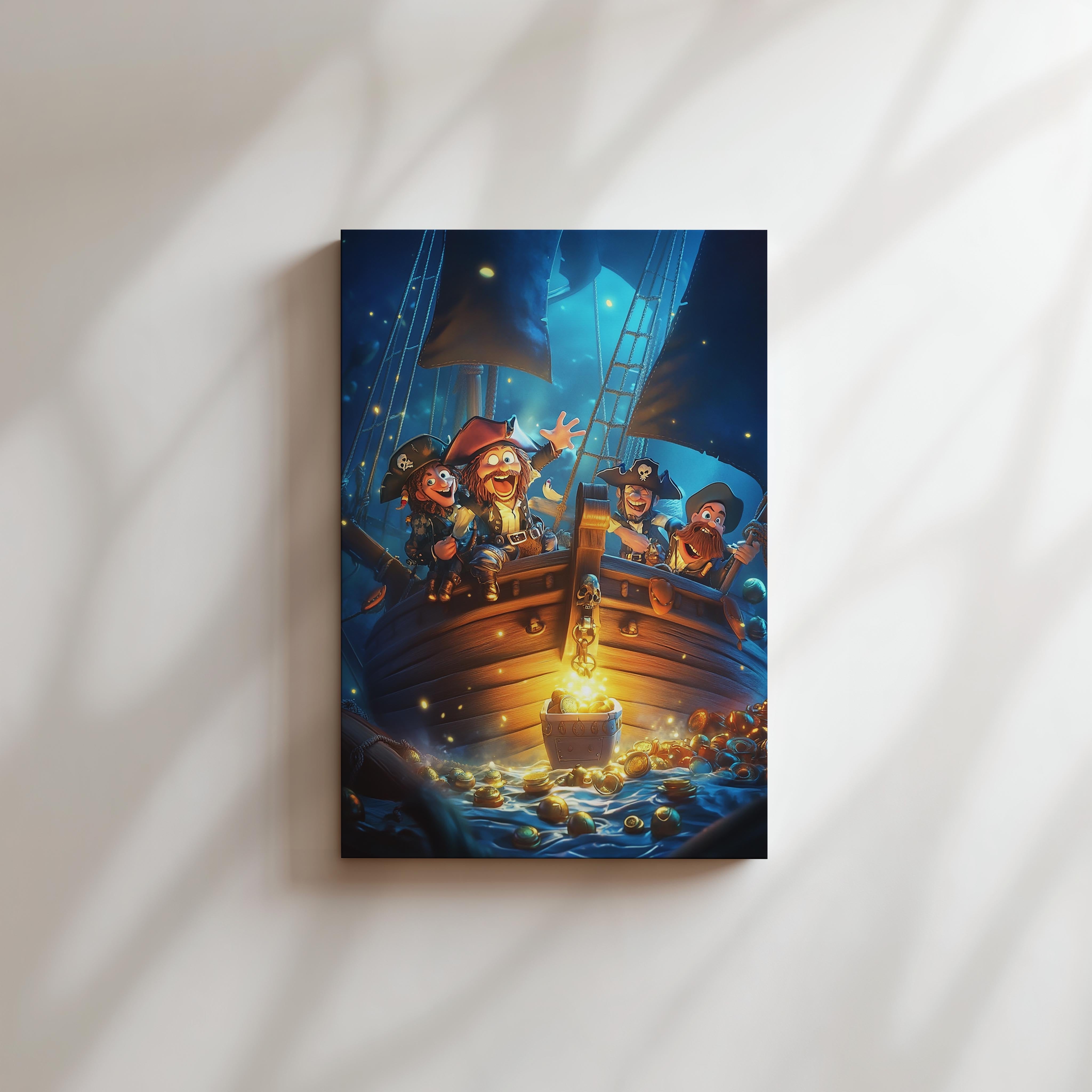 A dynamic scene of cheerful pirates aboard their ship, celebrating a chest filled with golden treasure. The glowing light from the treasure contrasts vividly with the deep blue tones of the sea and sky, creating a dramatic and exciting composition. Perfect for adventure enthusiasts or themed spaces, this artwork captures the thrill of discovery and the joy of shared adventures. Its lively and detailed design makes it a centerpiece for storytelling and imagination.