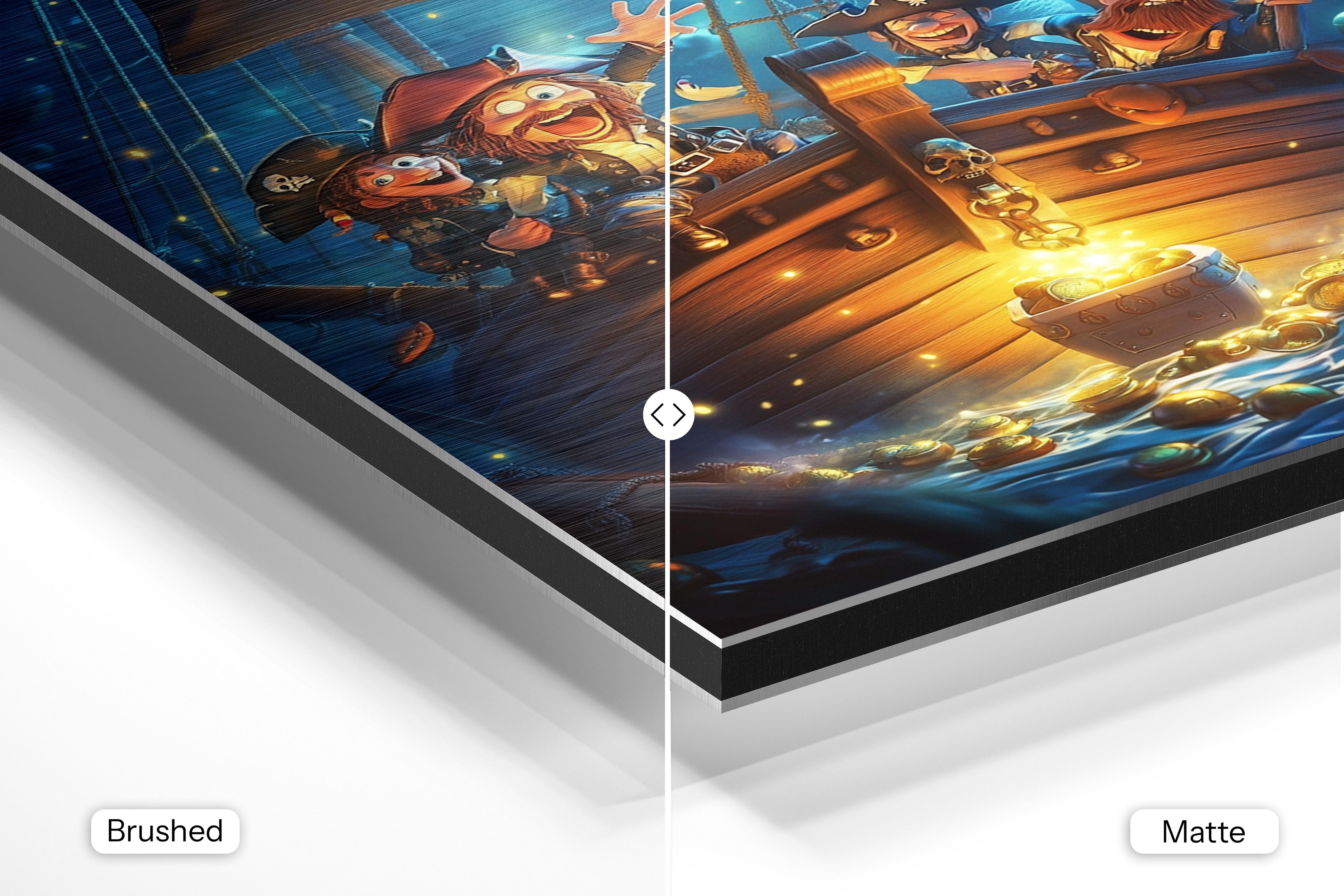 - Brushed Aluminum, on the other hand, features a raw metallic texture with visible brush strokes. Whites and highlights in your image let the silver surface show through, adding a dramatic, shimmering effect. Ideal for black-and-white images, minimalist designs, or abstract art, it creates a bold, industrial vibe with a modern edge.