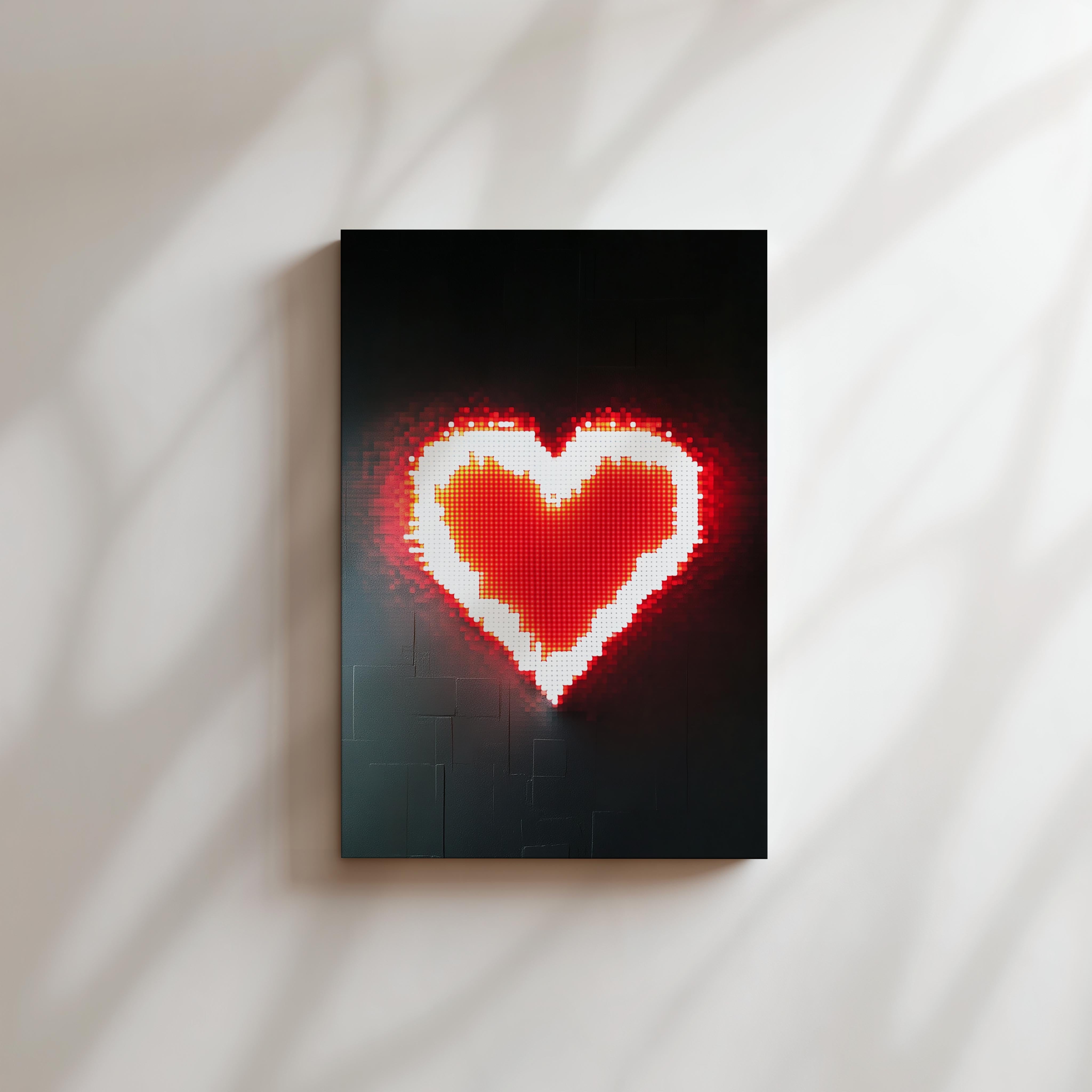 This vibrant pixelated heart glows against a dark background, blending retro aesthetics with modern digital artistry. The luminous red and white tones create a sense of warmth and playfulness, making it an eye-catching centerpiece. Perfect for tech-inspired decor or gaming-themed spaces, this piece adds a fun, nostalgic vibe to any room. It appeals to those who appreciate the intersection of technology and art, while the pixelated design nods to vintage video games. Whether displayed in a gaming room, media lounge, or modern office, this glowing heart radiates charm and creativity, making it a memorable addition to any setting.