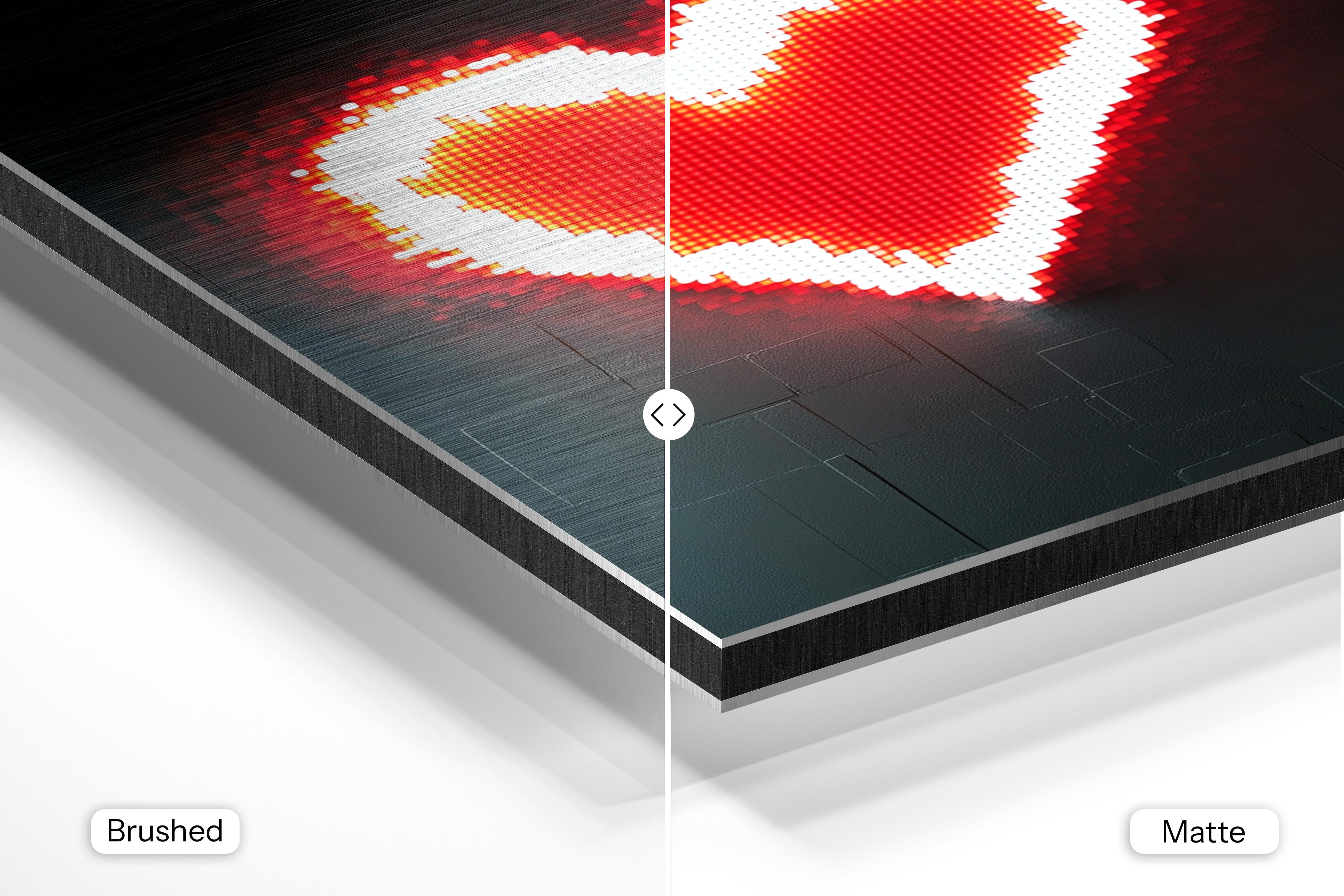 - Brushed Aluminum, on the other hand, features a raw metallic texture with visible brush strokes. Whites and highlights in your image let the silver surface show through, adding a dramatic, shimmering effect. Ideal for black-and-white images, minimalist designs, or abstract art, it creates a bold, industrial vibe with a modern edge.