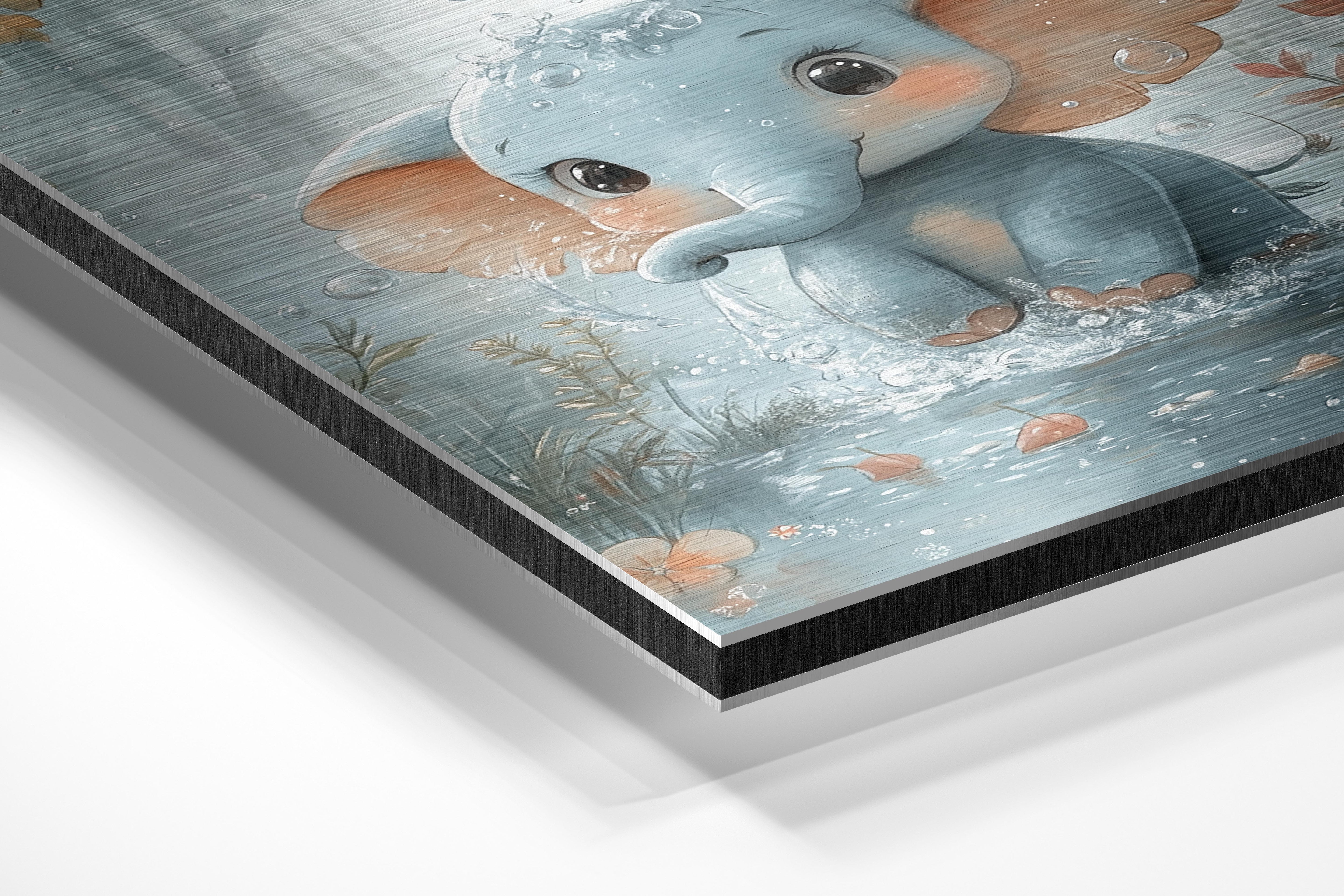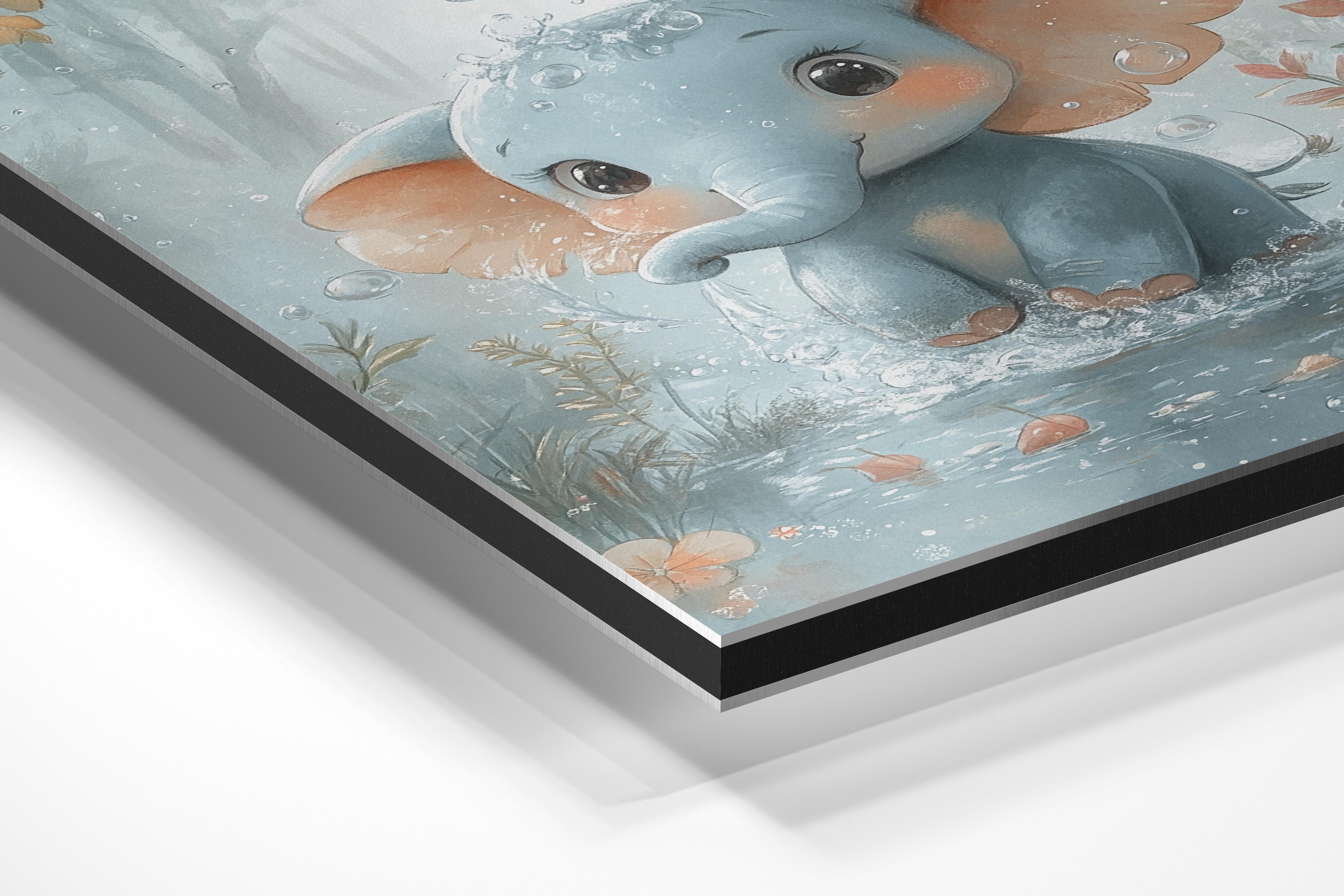 This delightful digital illustration features an adorable baby elephant splashing in a shallow pond, surrounded by lush greenery. The soft pastel hues and whimsical details, such as water droplets and autumn leaves floating in the air, add to the charm. The elephant’s wide, expressive eyes and rosy cheeks make it irresistibly cute, perfect for nursery decor or children’s spaces. The dreamy background and gentle tones create a peaceful and joyful atmosphere, ideal for bringing warmth and positivity to any setting.