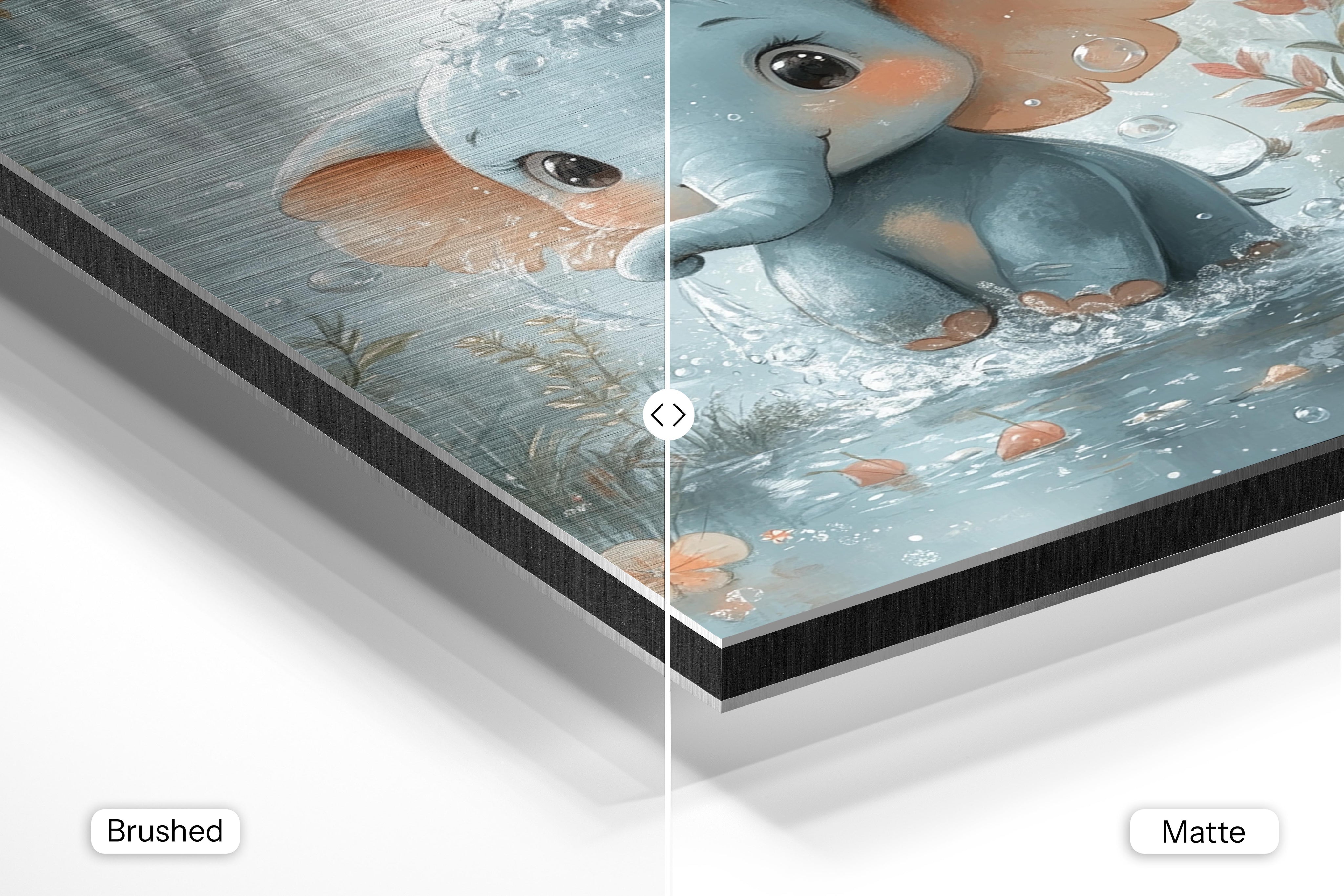 - Brushed Aluminum, on the other hand, features a raw metallic texture with visible brush strokes. Whites and highlights in your image let the silver surface show through, adding a dramatic, shimmering effect. Ideal for black-and-white images, minimalist designs, or abstract art, it creates a bold, industrial vibe with a modern edge.