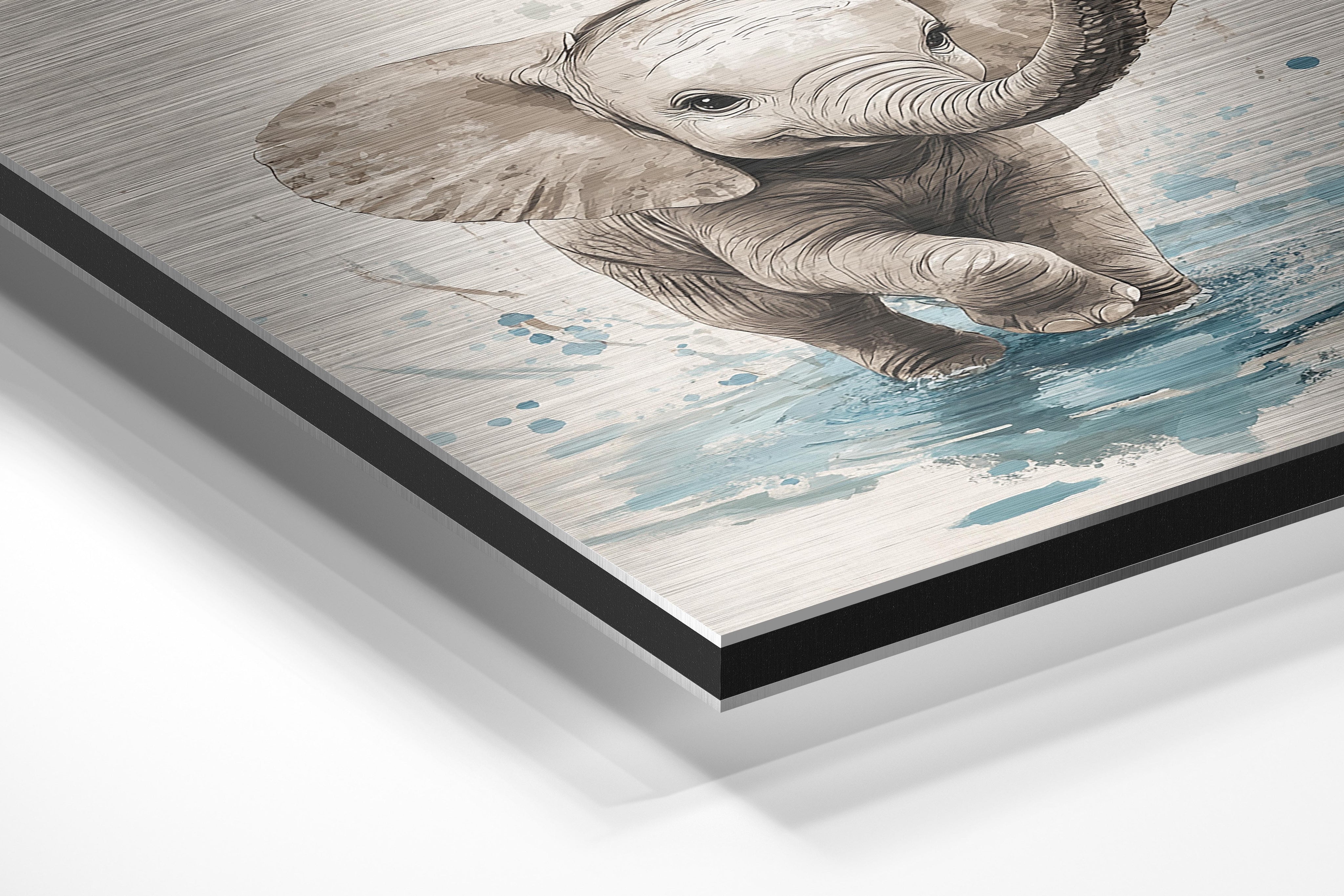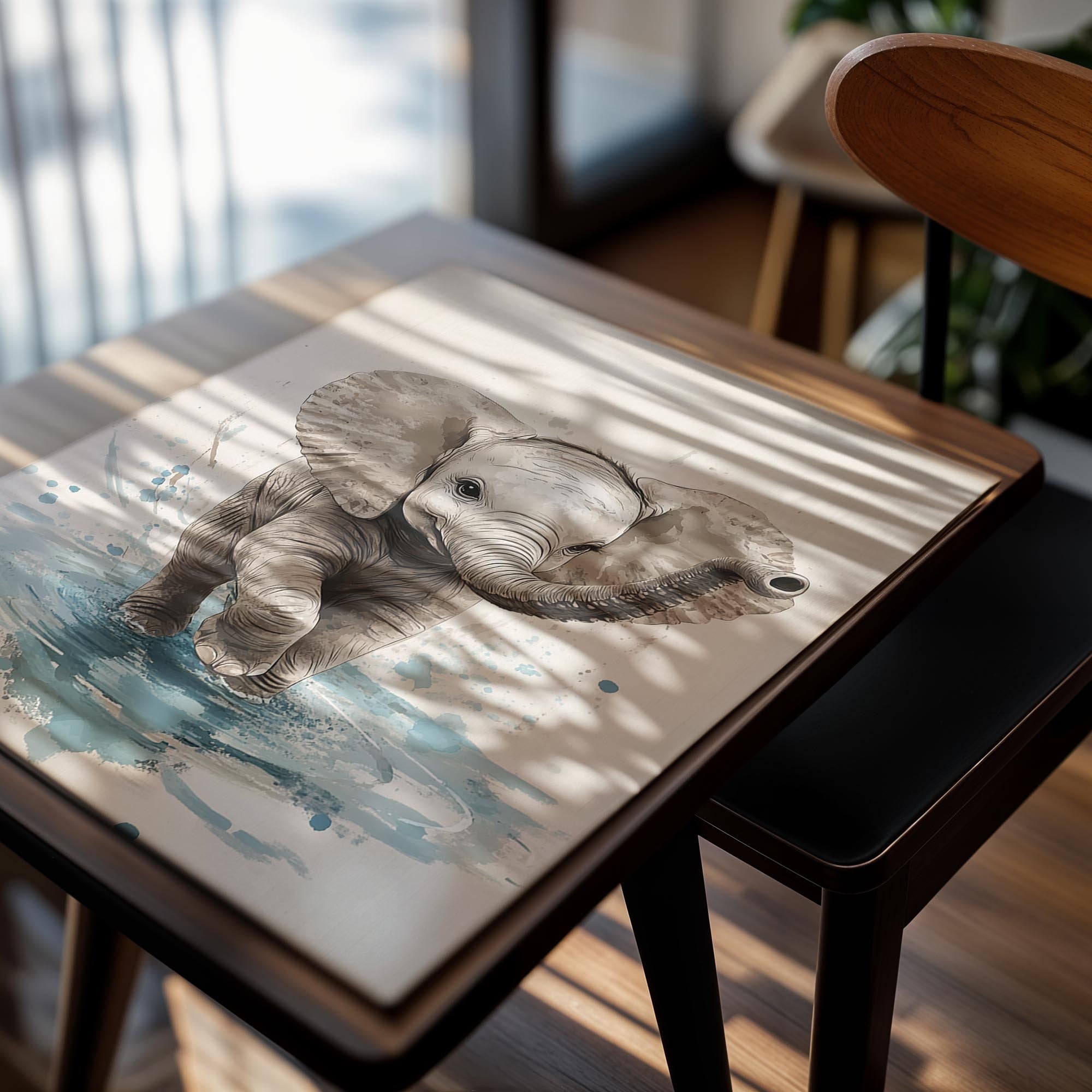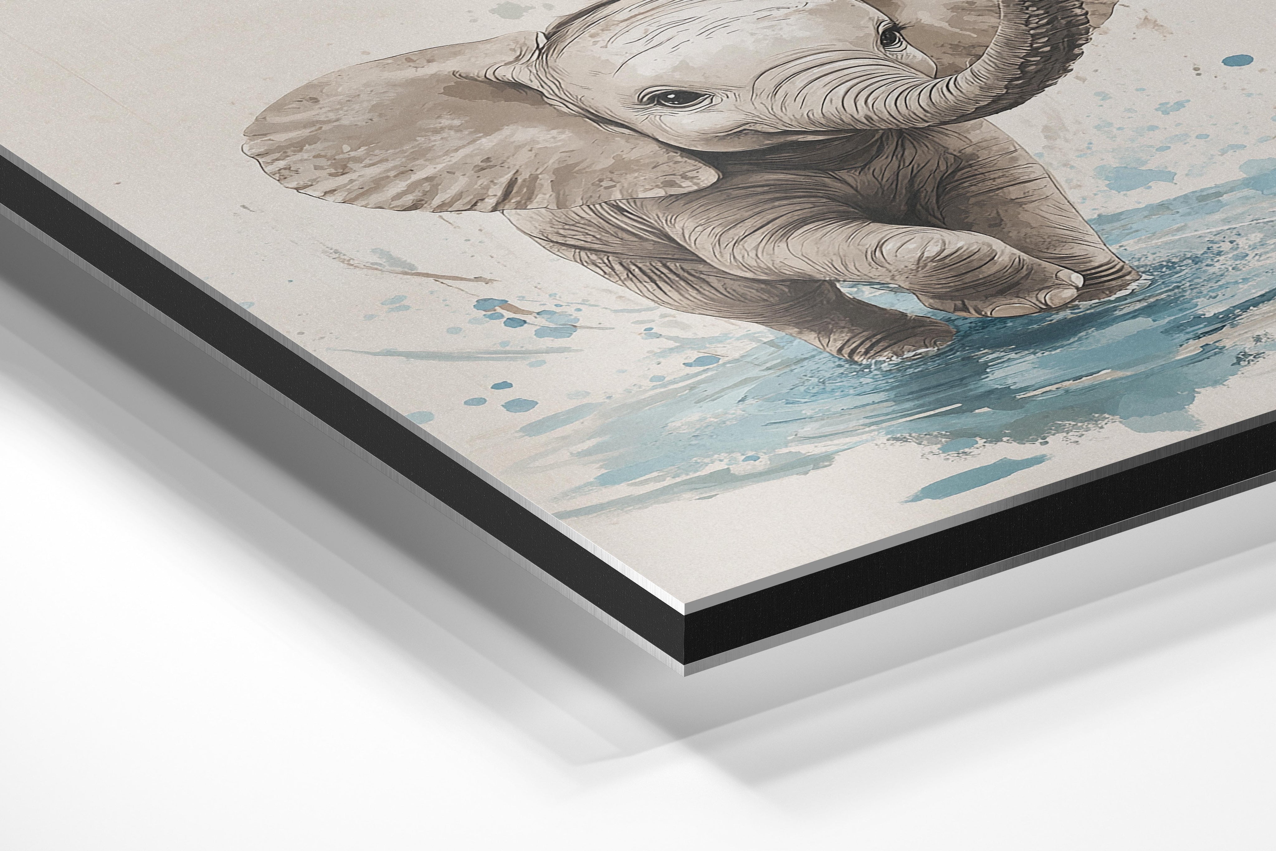 This charming artwork captures the innocence and joy of a baby elephant splashing through a shallow pool of water. The soft, hand-drawn details and watercolor splashes give it a lively, yet serene aesthetic. Its neutral background ensures that the focus remains on the elephant’s playful motion. This piece is a perfect fit for nurseries, children's rooms, or any space that celebrates wildlife and positivity. It evokes happiness, curiosity, and the beauty of nature, making it a wonderful choice for animal lovers and those looking for art that brings a sense of joy.