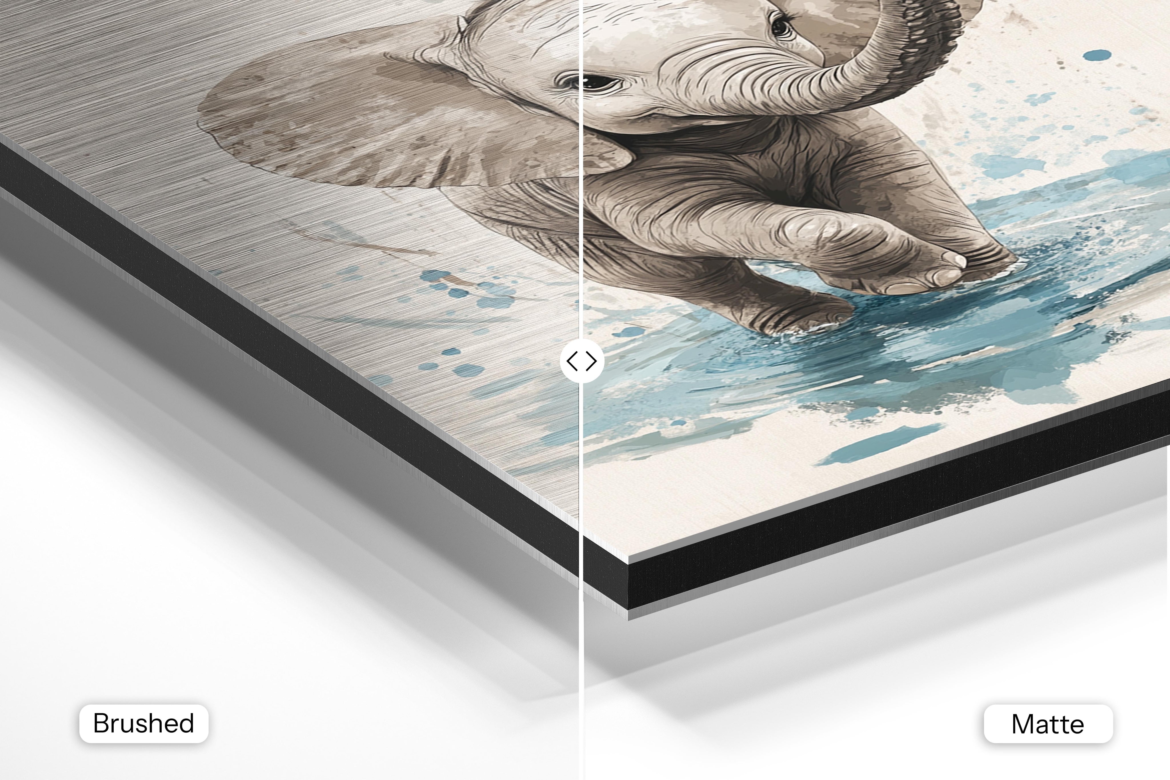 - Brushed Aluminum, on the other hand, features a raw metallic texture with visible brush strokes. Whites and highlights in your image let the silver surface show through, adding a dramatic, shimmering effect. Ideal for black-and-white images, minimalist designs, or abstract art, it creates a bold, industrial vibe with a modern edge.