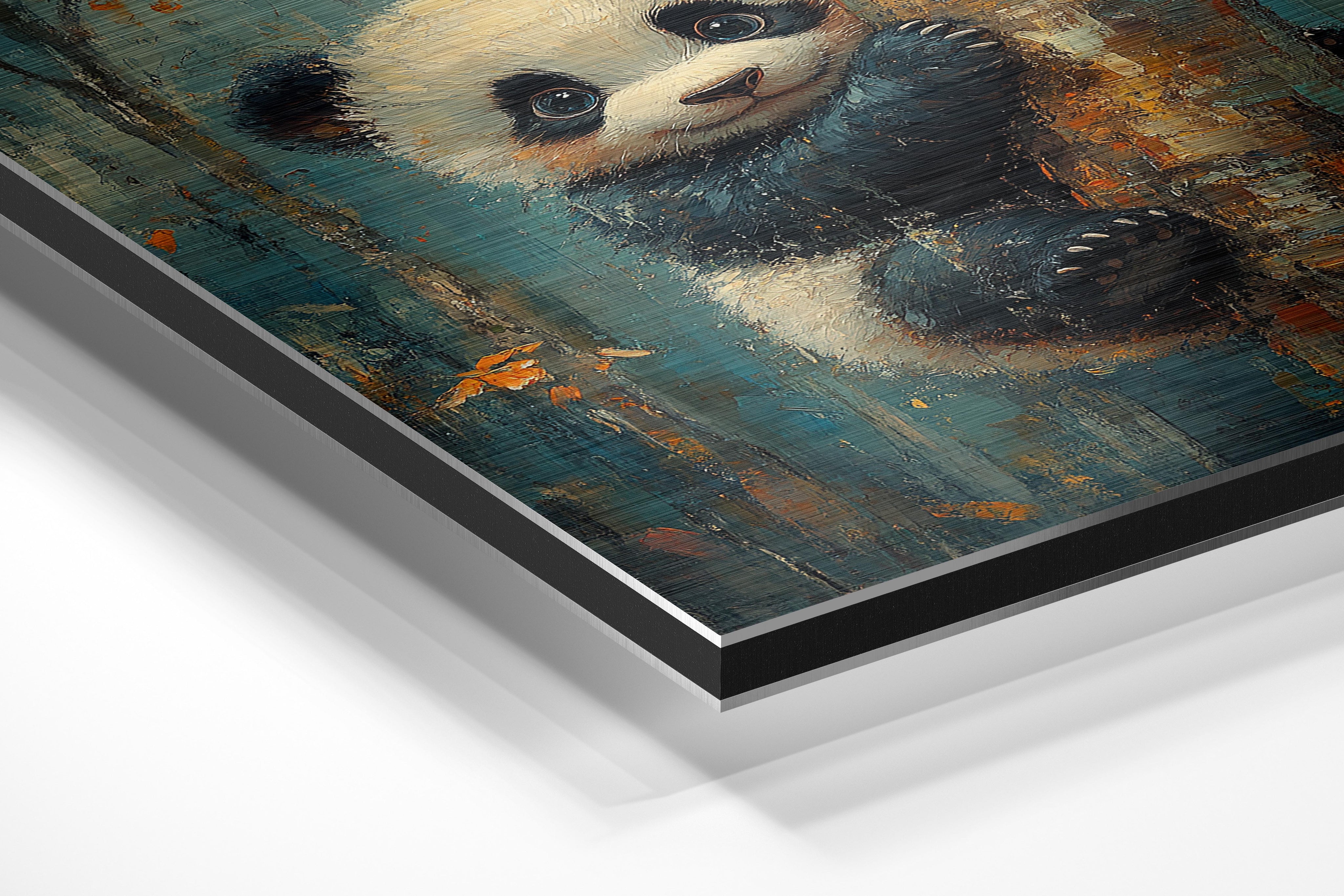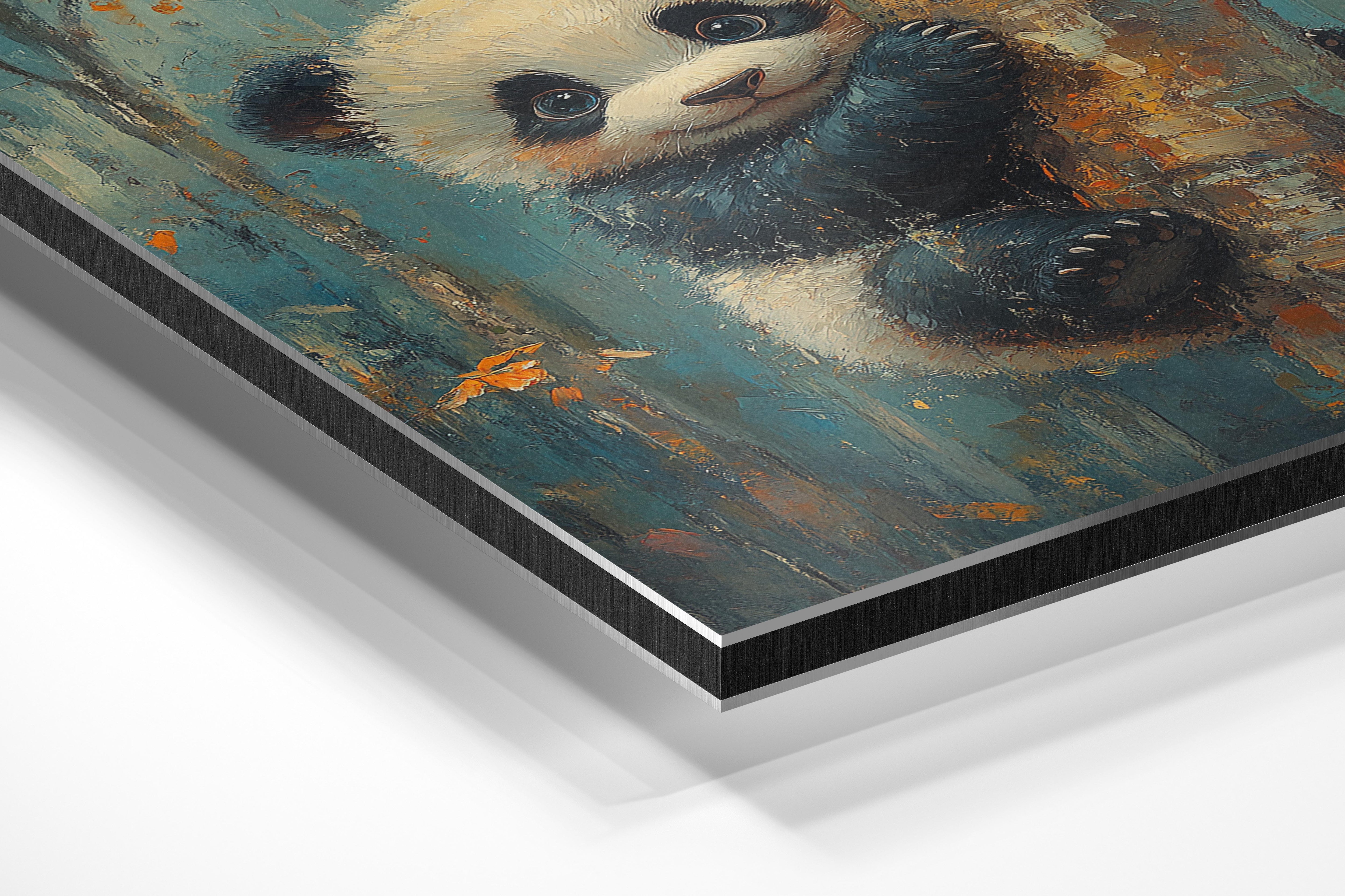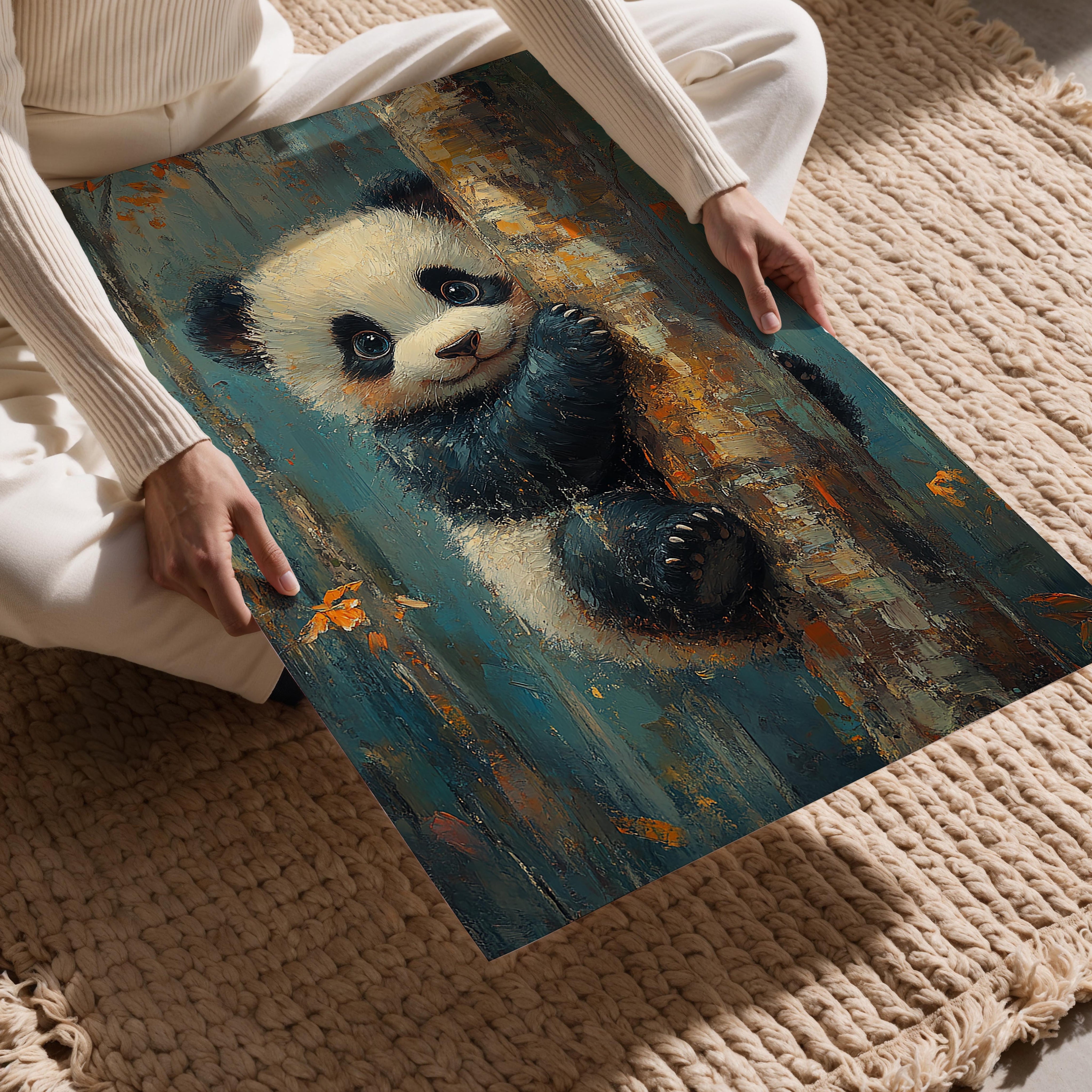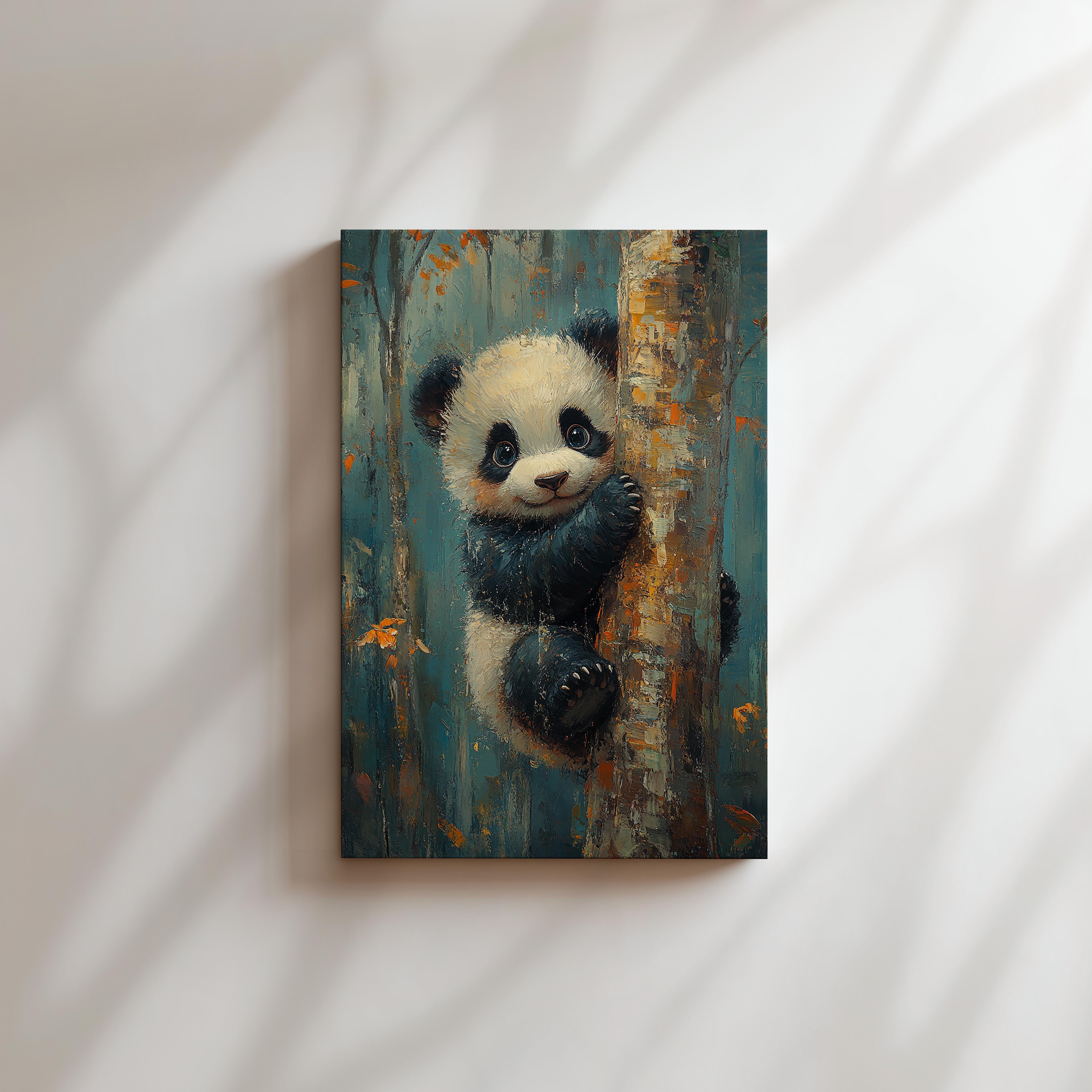 This charming artwork captures a young panda clinging to a tree trunk with a delightful and curious expression. The soft fur details and vibrant autumnal background create a warm and inviting scene. The blend of realism and painterly textures adds depth, making this a perfect piece for children's rooms, nurseries, or any space needing a touch of joy and innocence. The rich blue and orange hues contrast beautifully, creating a visually pleasing and heartwarming composition. It embodies playfulness and the beauty of nature, making it a great gift for animal lovers.