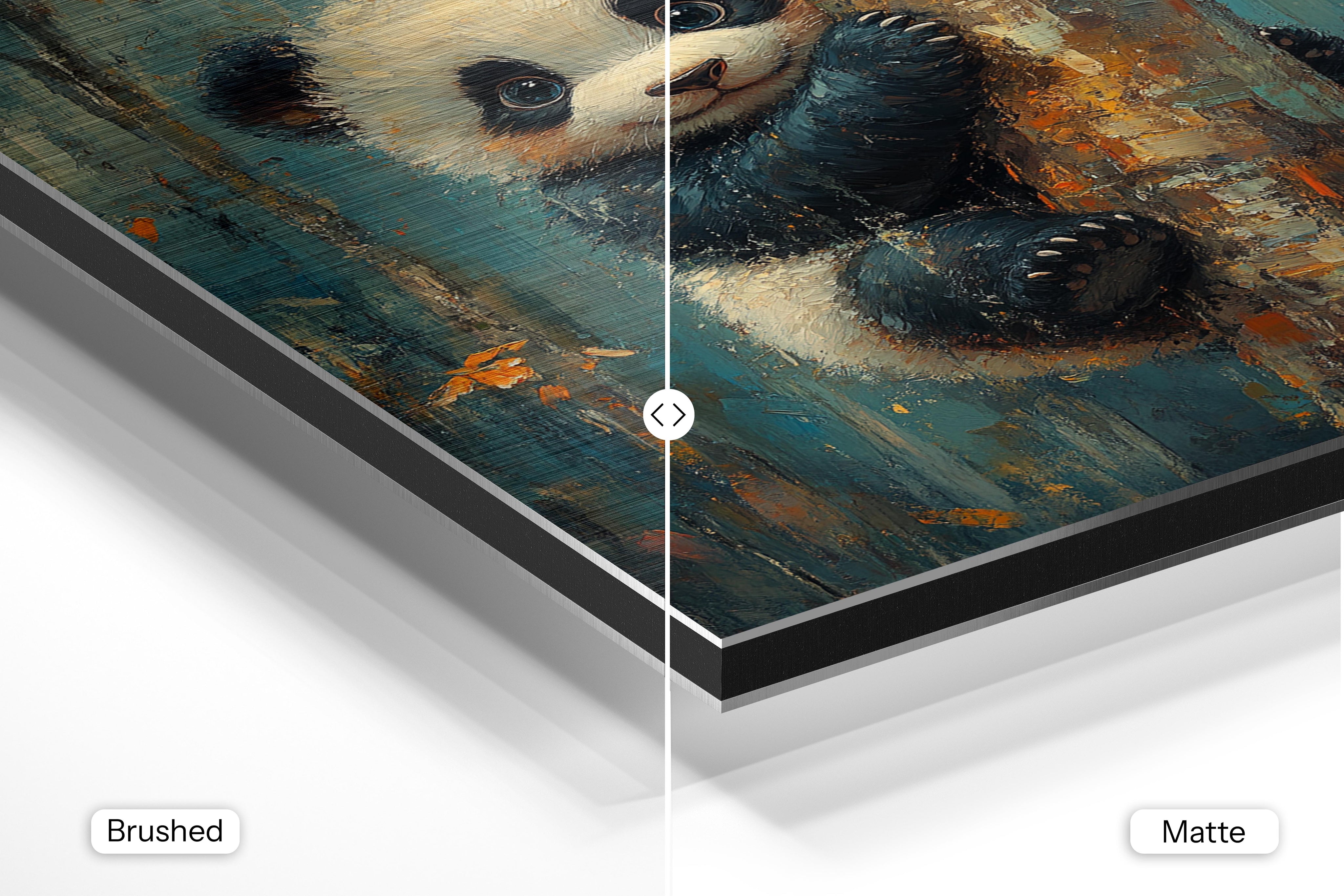 - Brushed Aluminum, on the other hand, features a raw metallic texture with visible brush strokes. Whites and highlights in your image let the silver surface show through, adding a dramatic, shimmering effect. Ideal for black-and-white images, minimalist designs, or abstract art, it creates a bold, industrial vibe with a modern edge.