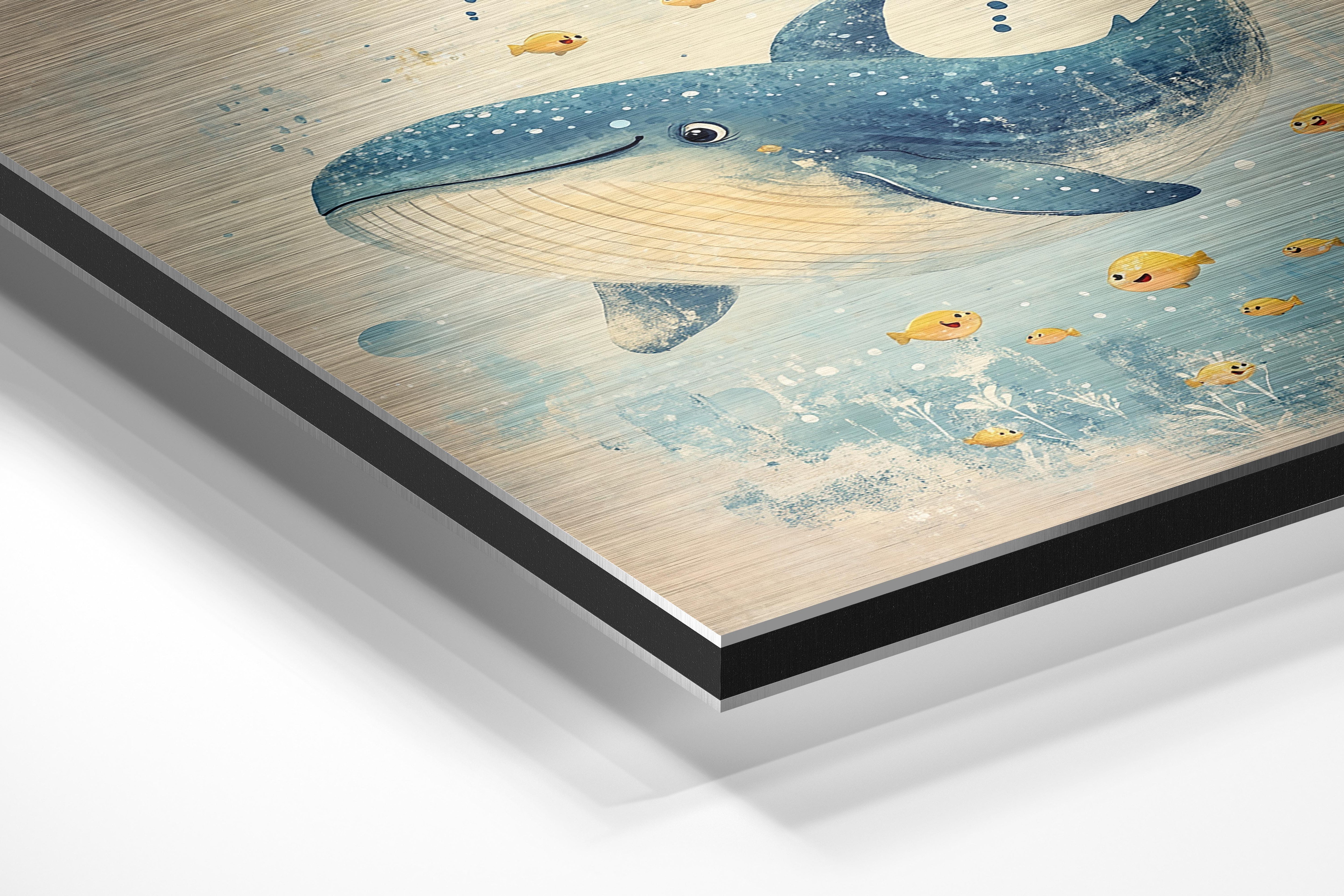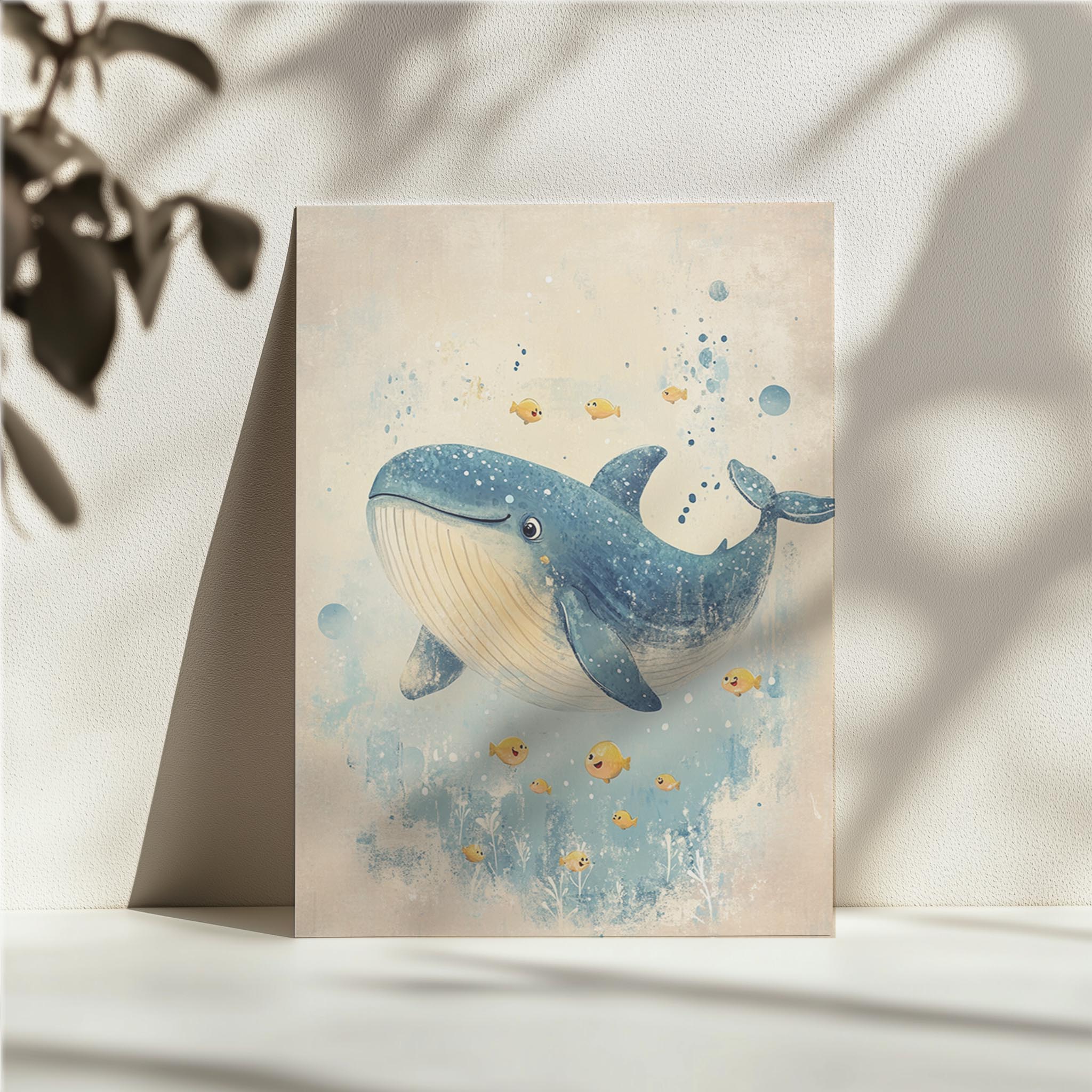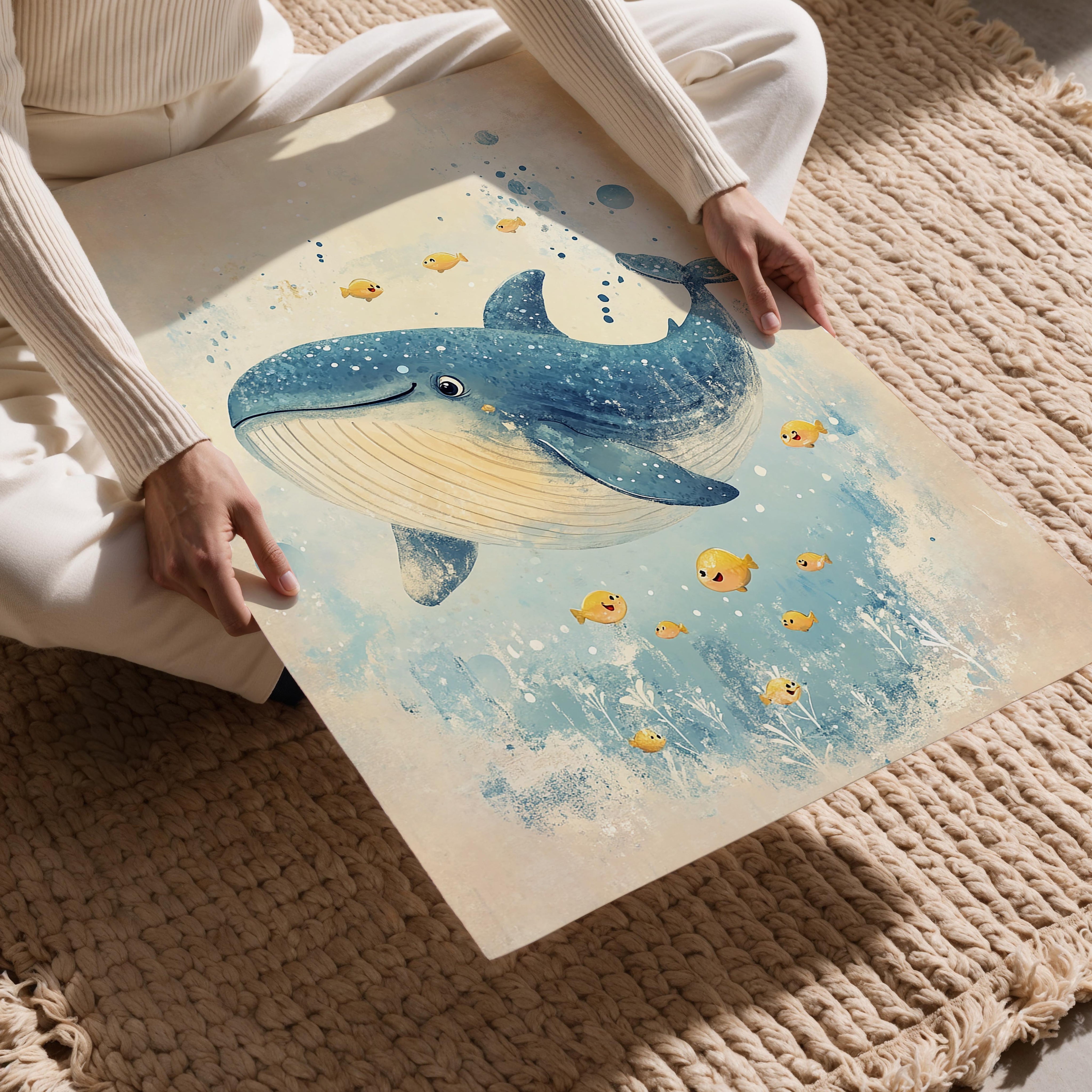This charming illustration features a smiling blue whale surrounded by cheerful golden fish. The whale's playful expression, combined with the light, pastel watercolor textures, creates a whimsical underwater scene. The background is softly blended with delicate marine elements, adding depth to the composition. This piece is ideal for nurseries, children’s spaces, or any setting where a lighthearted and joyful oceanic vibe is desired. Its cheerful tone invites a sense of wonder and adventure.