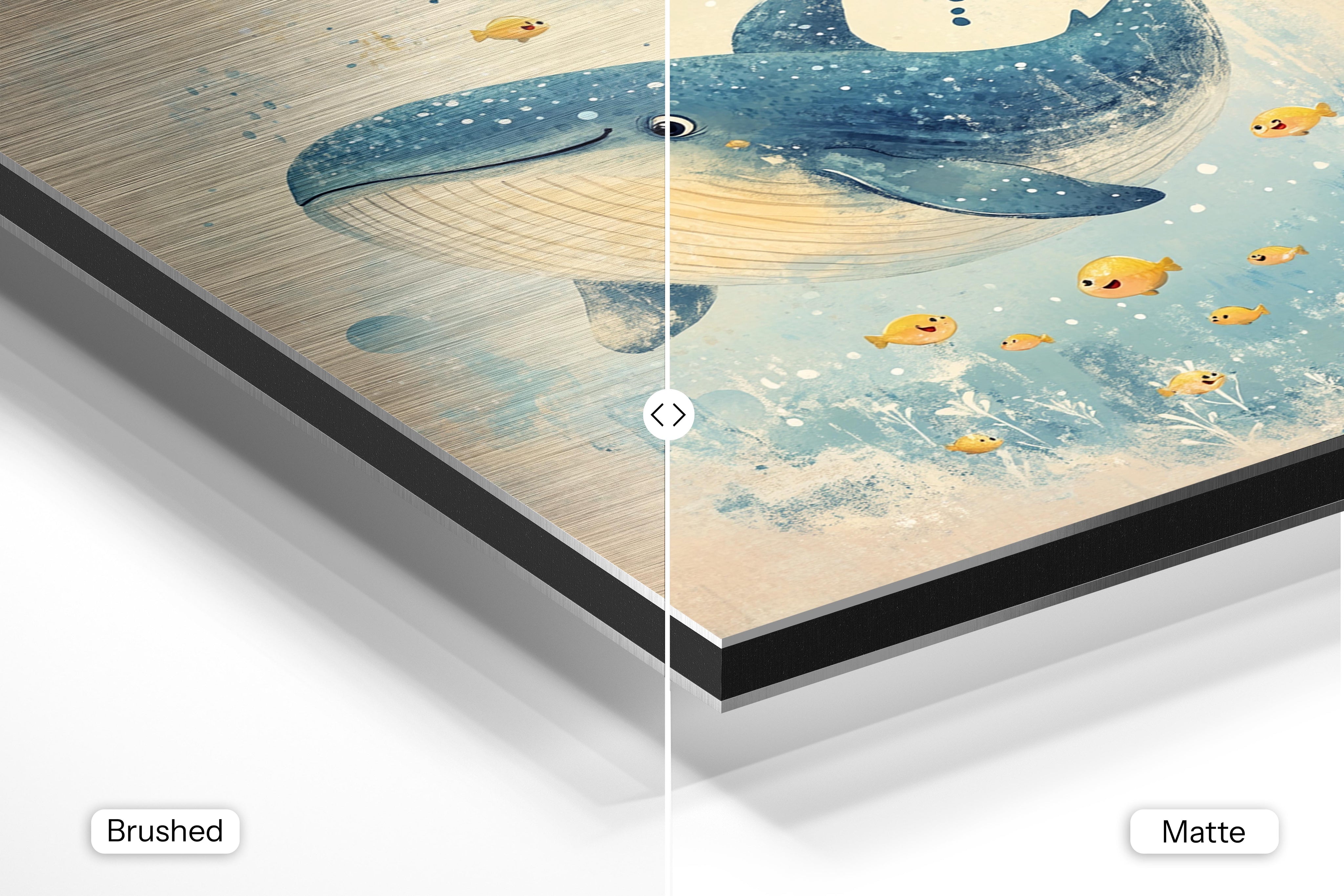 - Brushed Aluminum, on the other hand, features a raw metallic texture with visible brush strokes. Whites and highlights in your image let the silver surface show through, adding a dramatic, shimmering effect. Ideal for black-and-white images, minimalist designs, or abstract art, it creates a bold, industrial vibe with a modern edge.