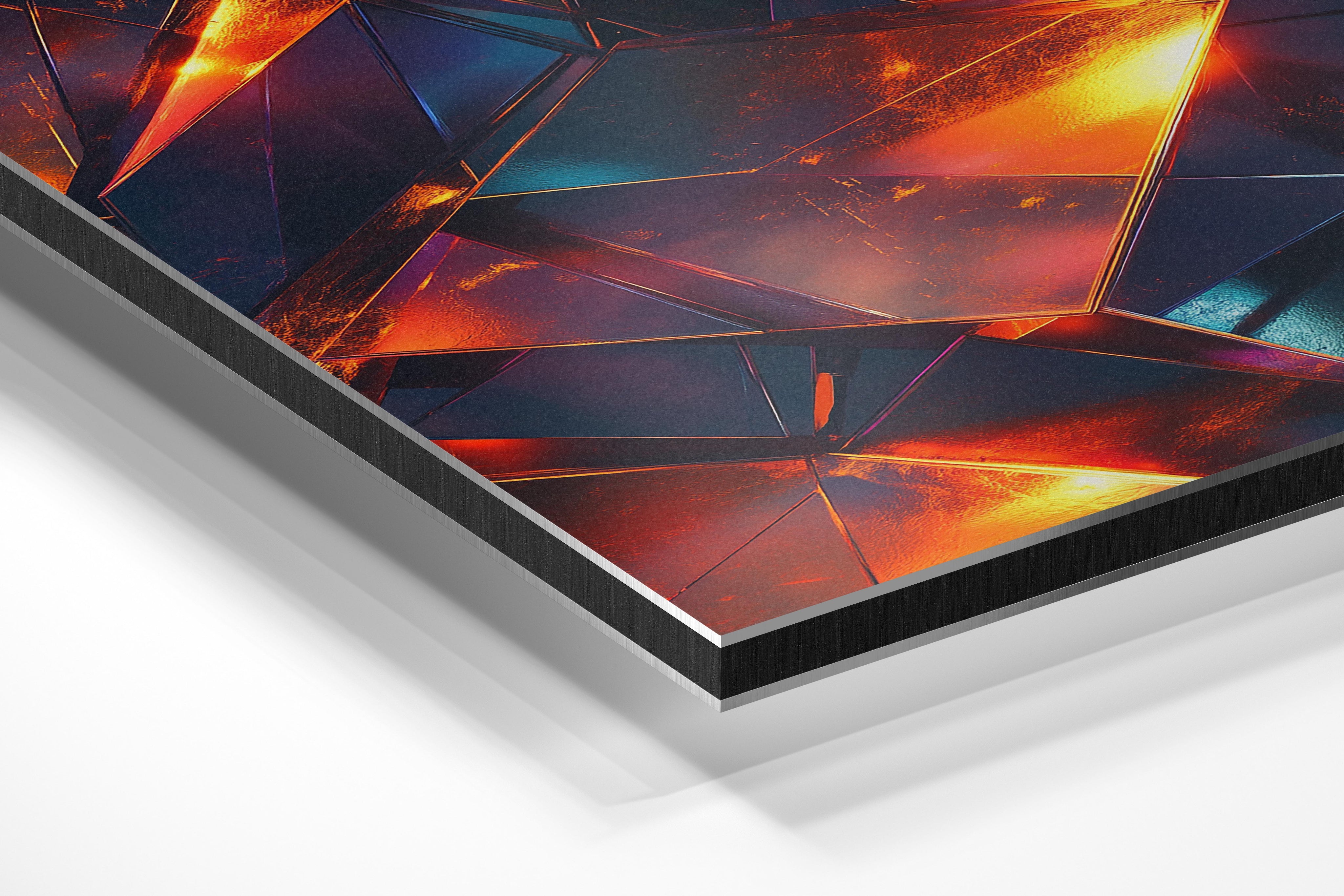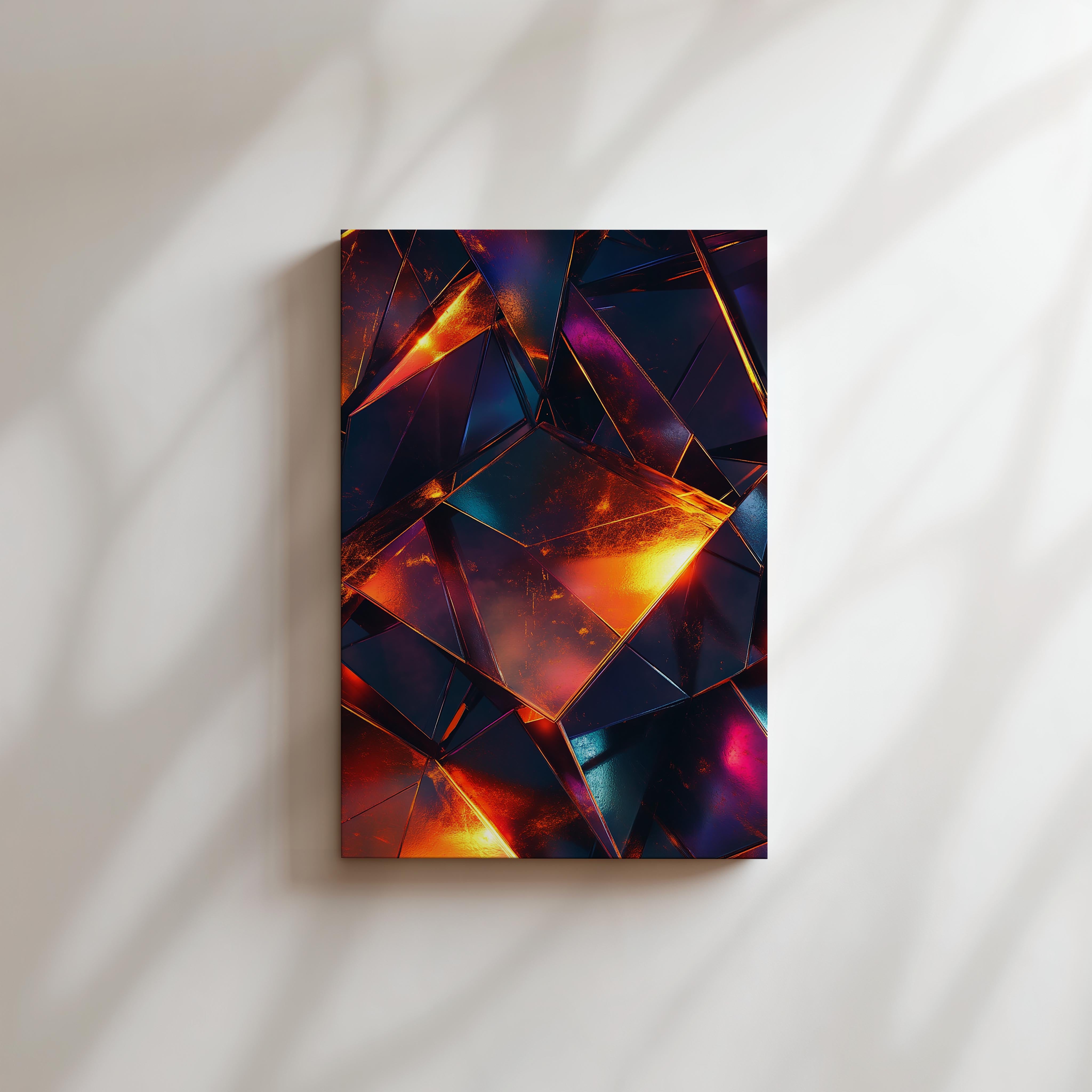 This captivating artwork presents a composition of prism-like geometric shapes, illuminated with bold, fiery gradients of orange and pink. The reflective surfaces shimmer with light, creating a futuristic and sophisticated visual appeal. This piece is a perfect fit for modern interiors seeking a pop of color and vibrancy. It works well in creative spaces or contemporary living rooms, where its striking design and radiant tones can draw attention and uplift the atmosphere. A blend of modern geometry and vivid illumination.