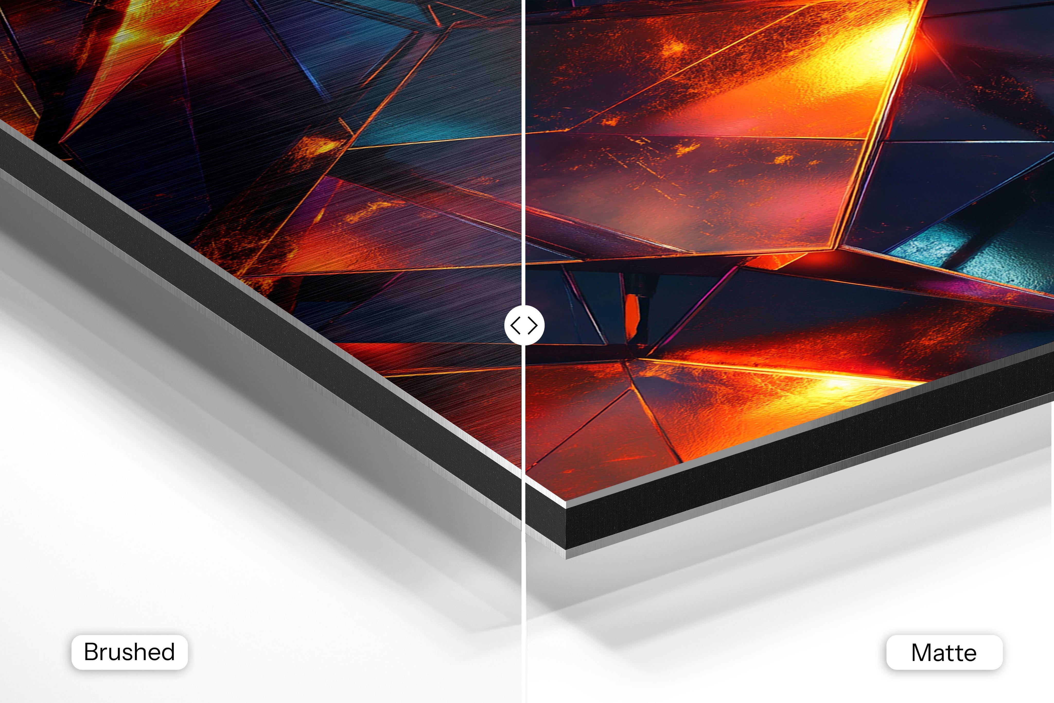 - Brushed Aluminum, on the other hand, features a raw metallic texture with visible brush strokes. Whites and highlights in your image let the silver surface show through, adding a dramatic, shimmering effect. Ideal for black-and-white images, minimalist designs, or abstract art, it creates a bold, industrial vibe with a modern edge.
