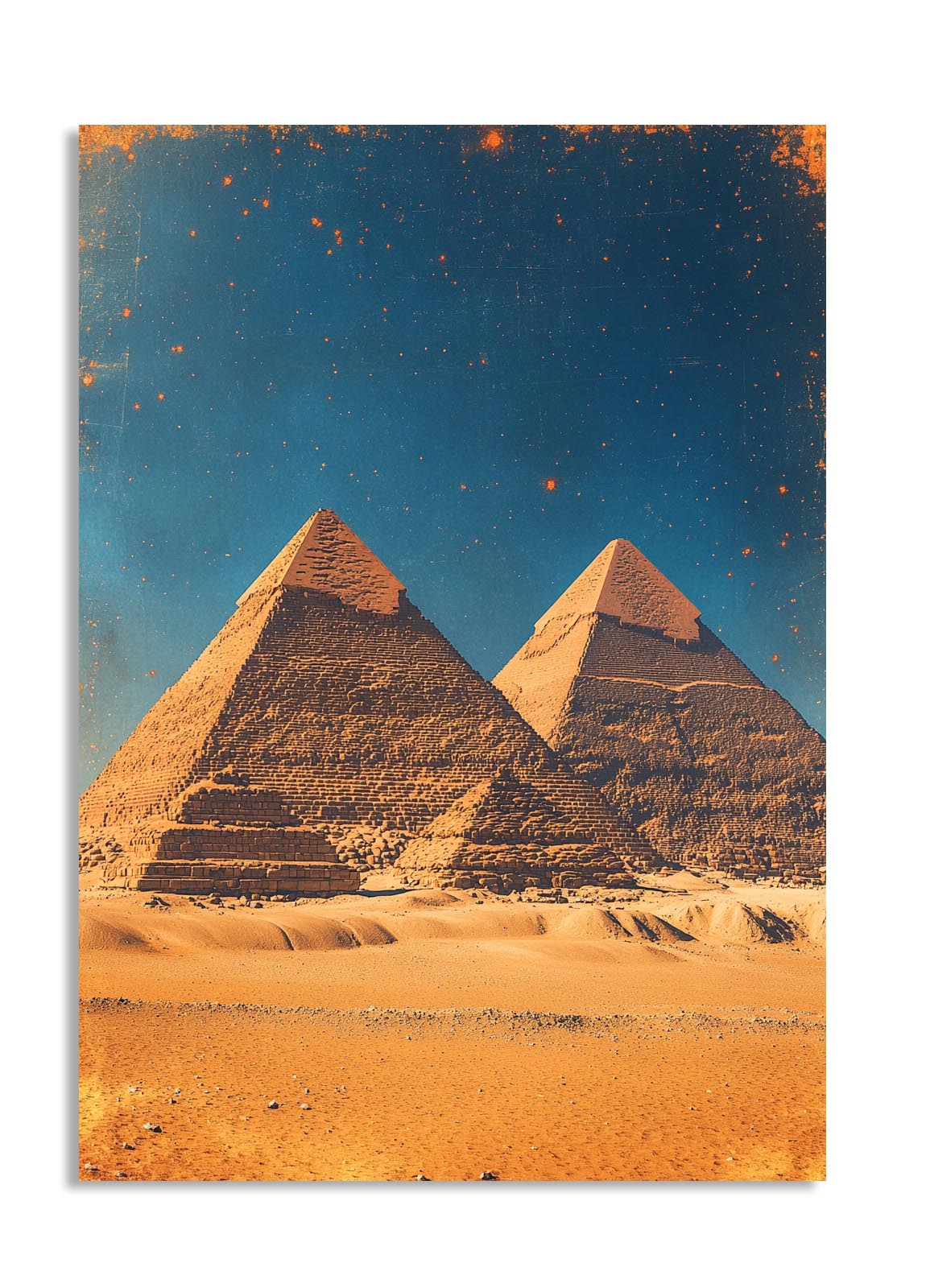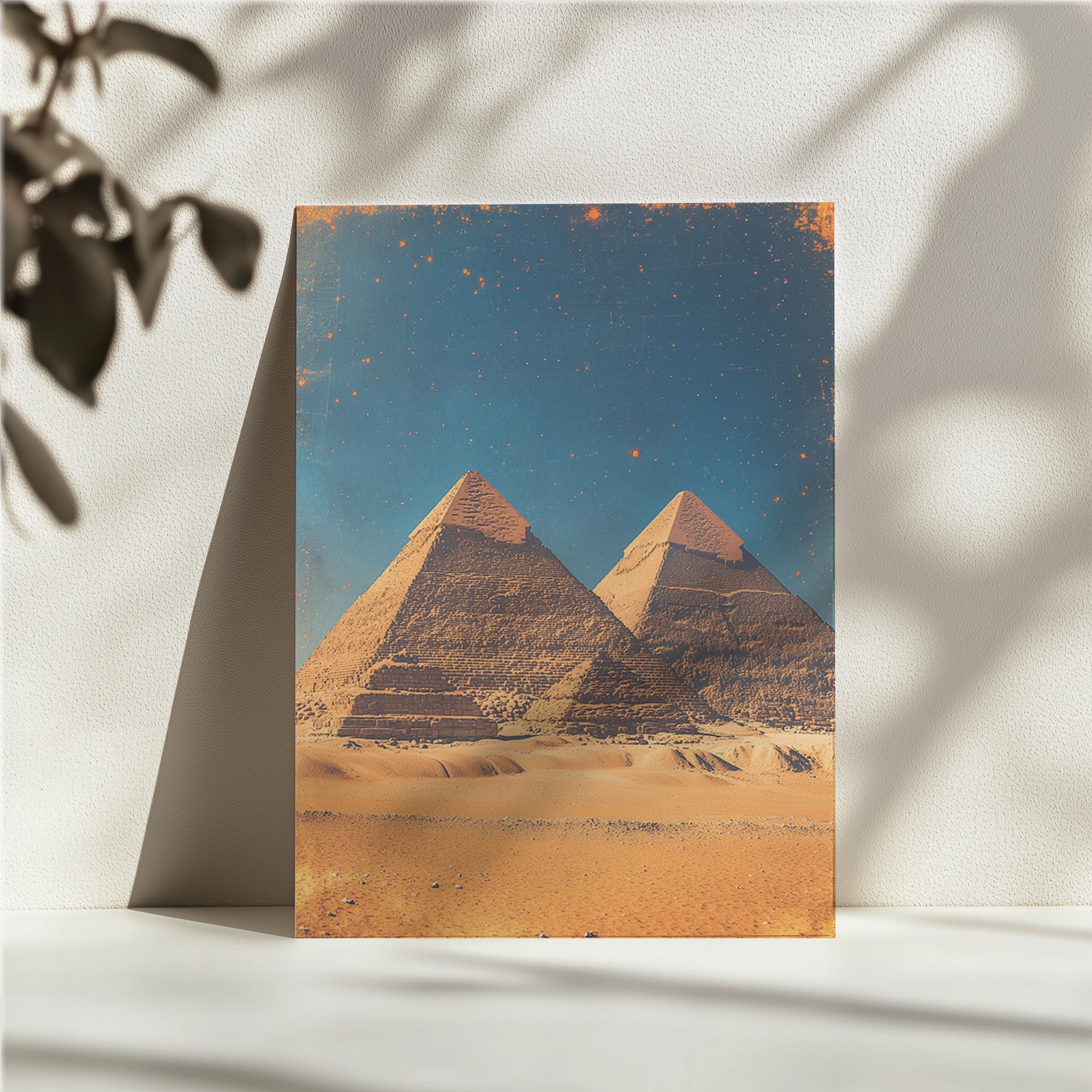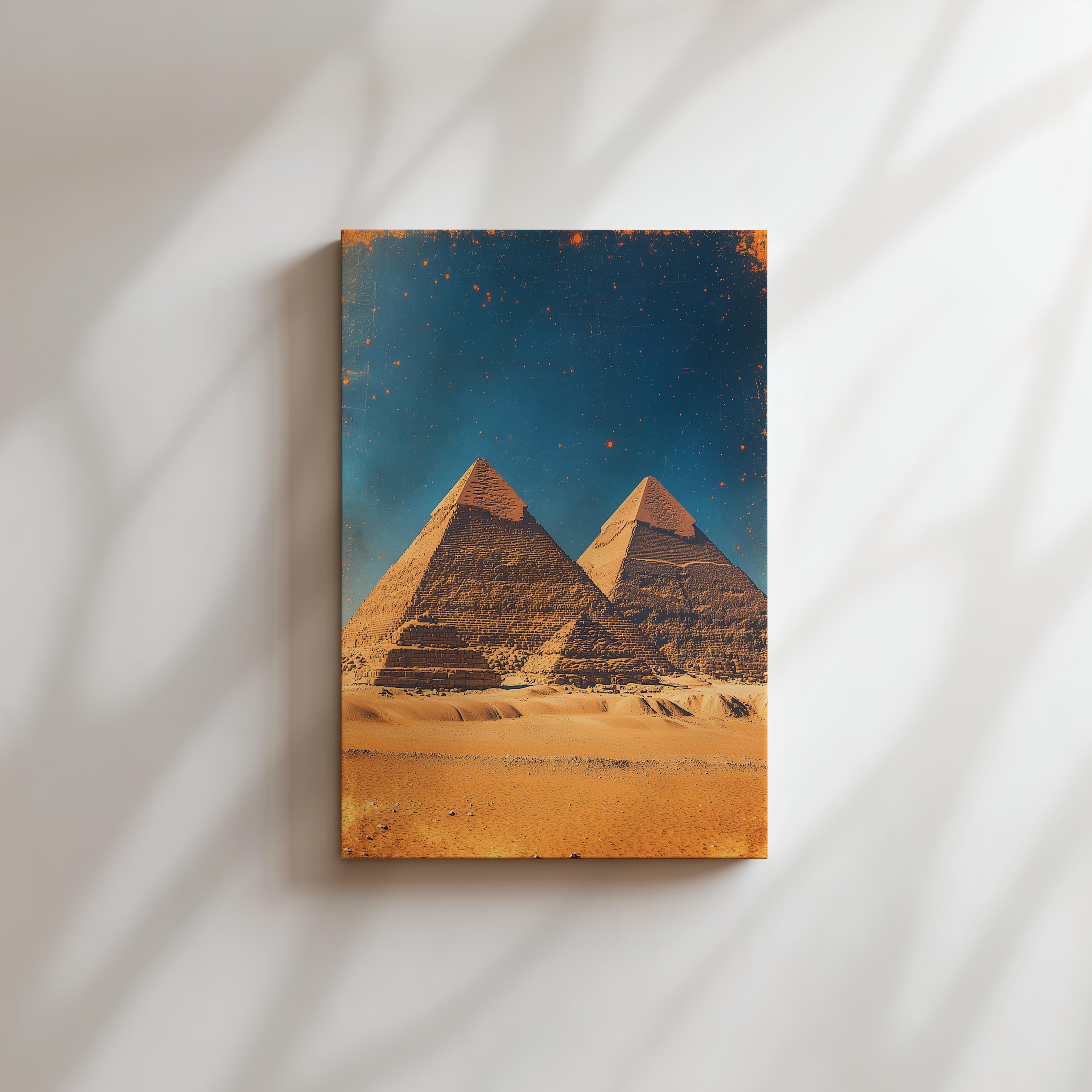 This awe-inspiring image showcases the Great Pyramids of Giza under a star-filled sky, blending the majesty of ancient history with the beauty of the cosmos. The warm tones of the desert sand contrast with the cool blues of the celestial backdrop, creating a striking composition. This piece captures the grandeur and mystery of the pyramids, symbolizing endurance and human ingenuity. Ideal for history enthusiasts or those drawn to the wonders of the ancient world, this artwork is perfect for a study, office, or any space dedicated to exploration and discovery. The vivid colors and timeless subject matter make it a captivating centerpiece for any room.