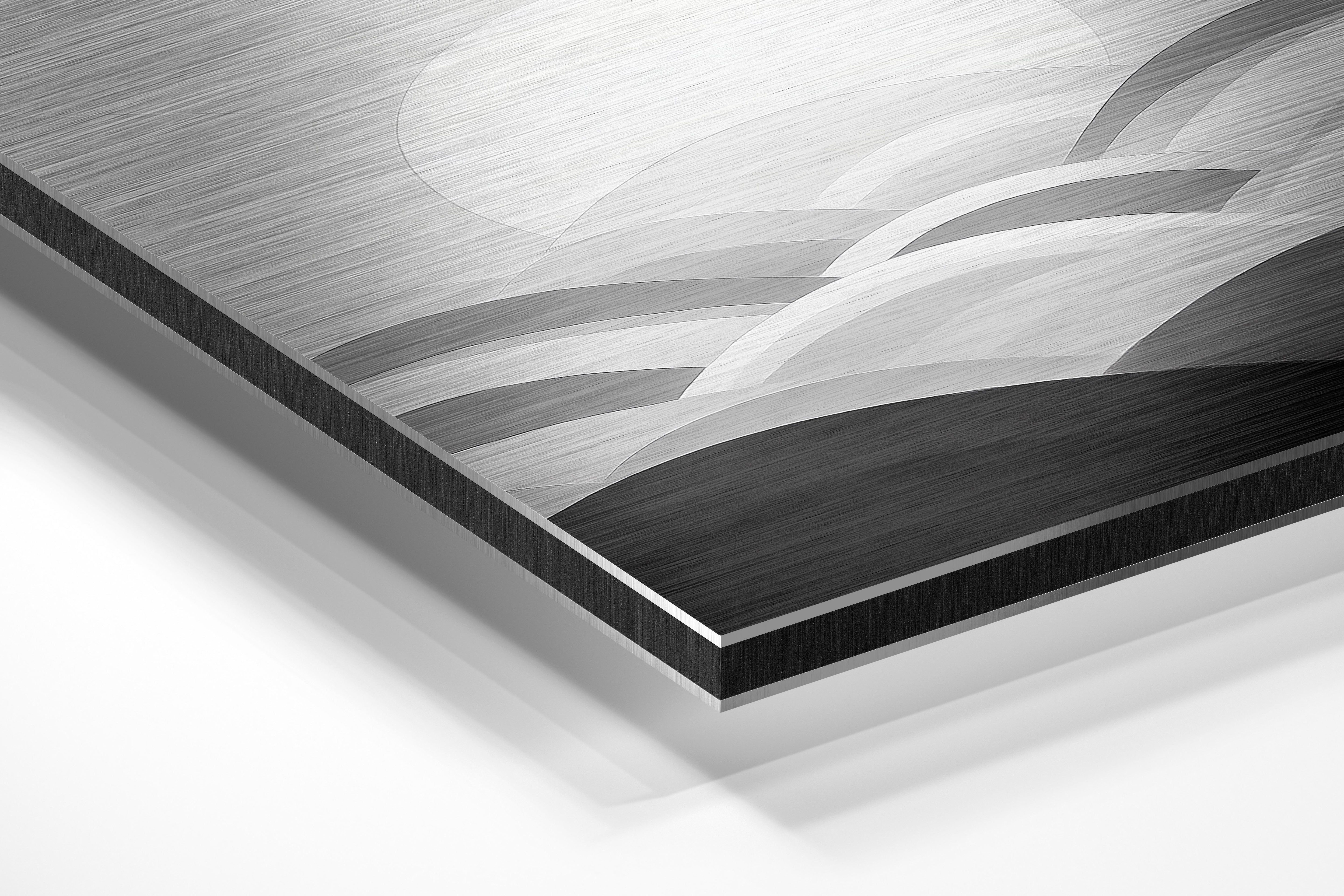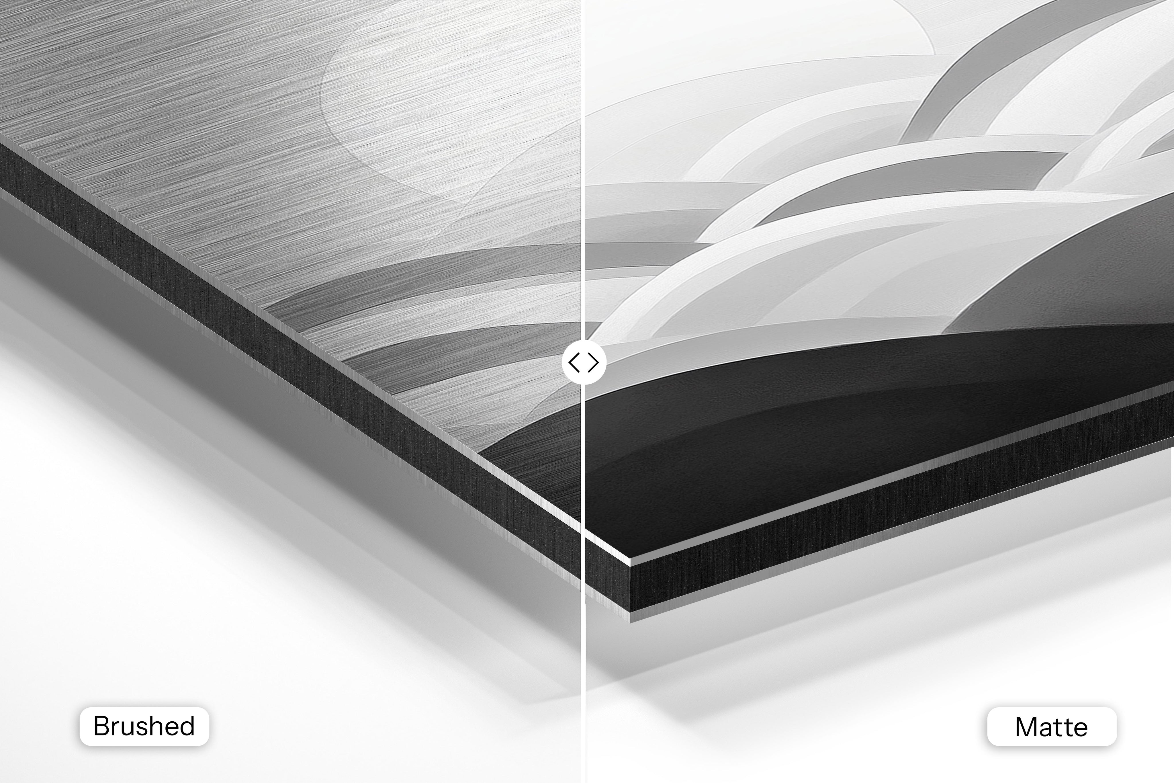 - Brushed Aluminum, on the other hand, features a raw metallic texture with visible brush strokes. Whites and highlights in your image let the silver surface show through, adding a dramatic, shimmering effect. Ideal for black-and-white images, minimalist designs, or abstract art, it creates a bold, industrial vibe with a modern edge.