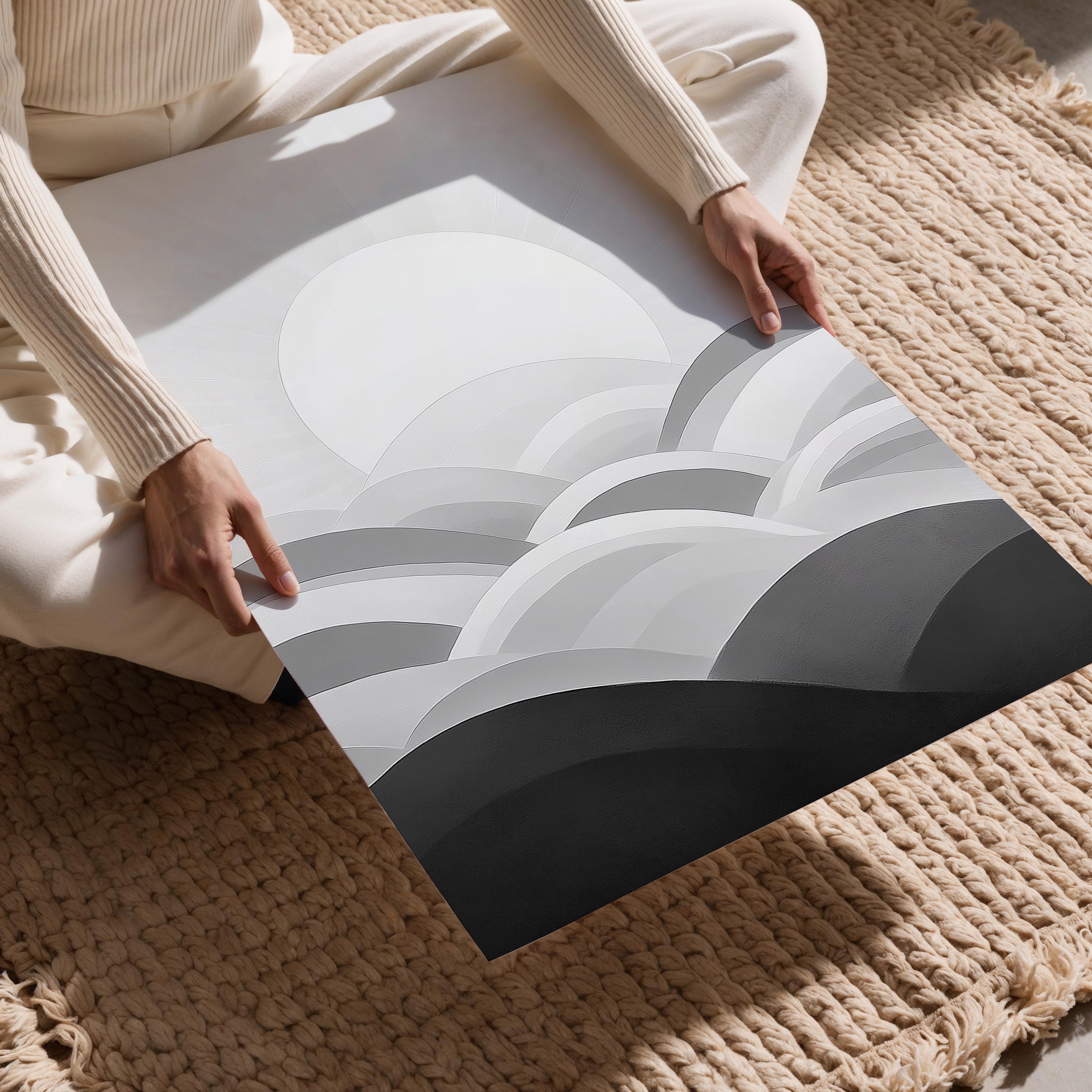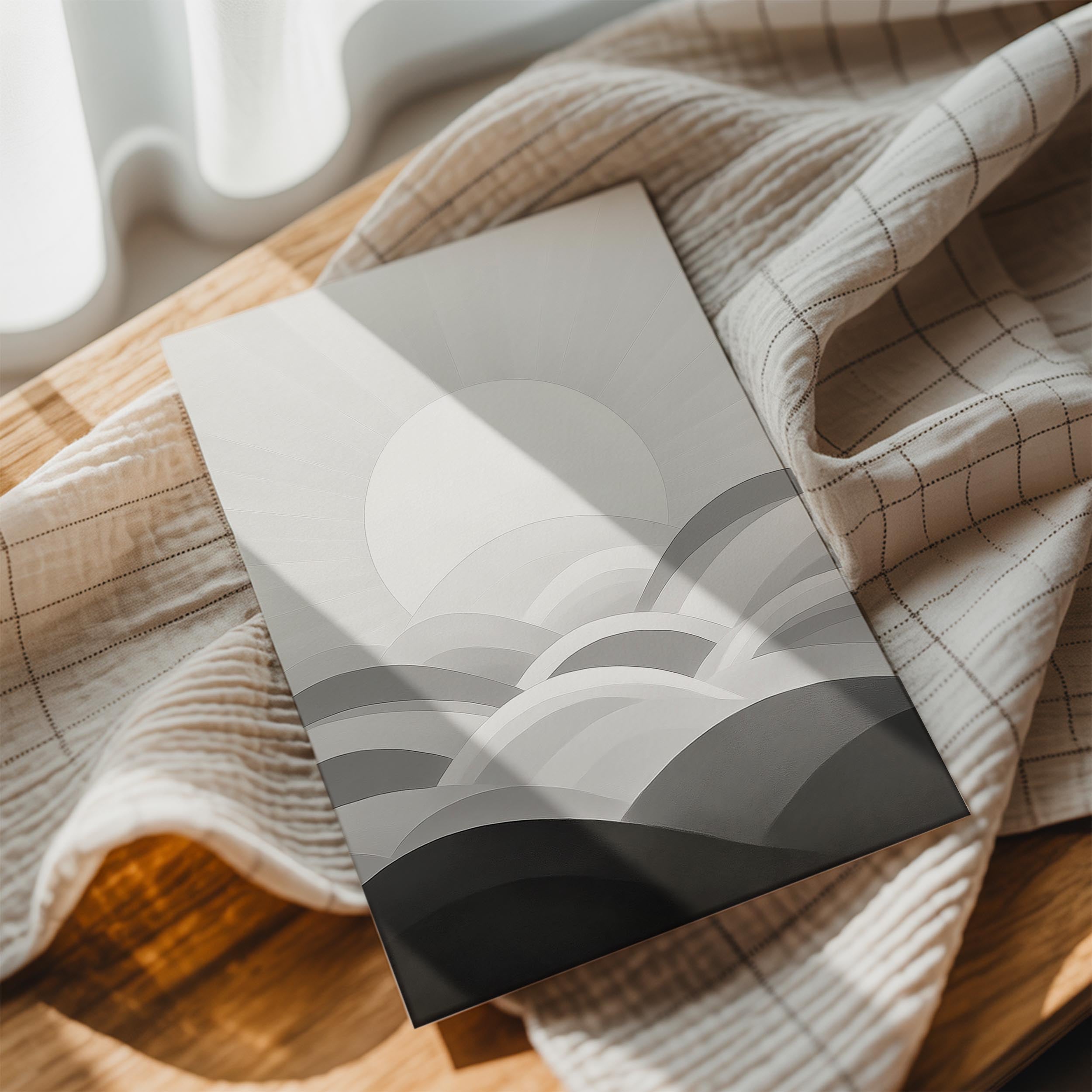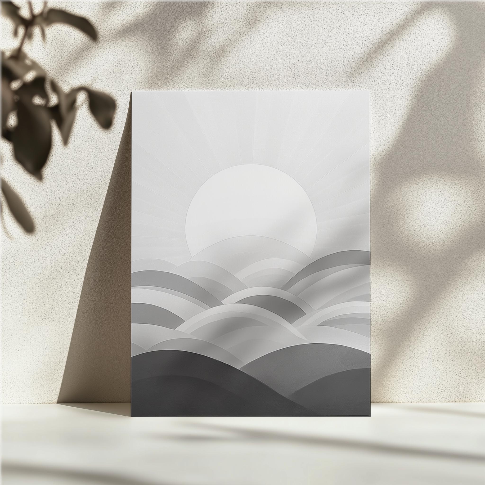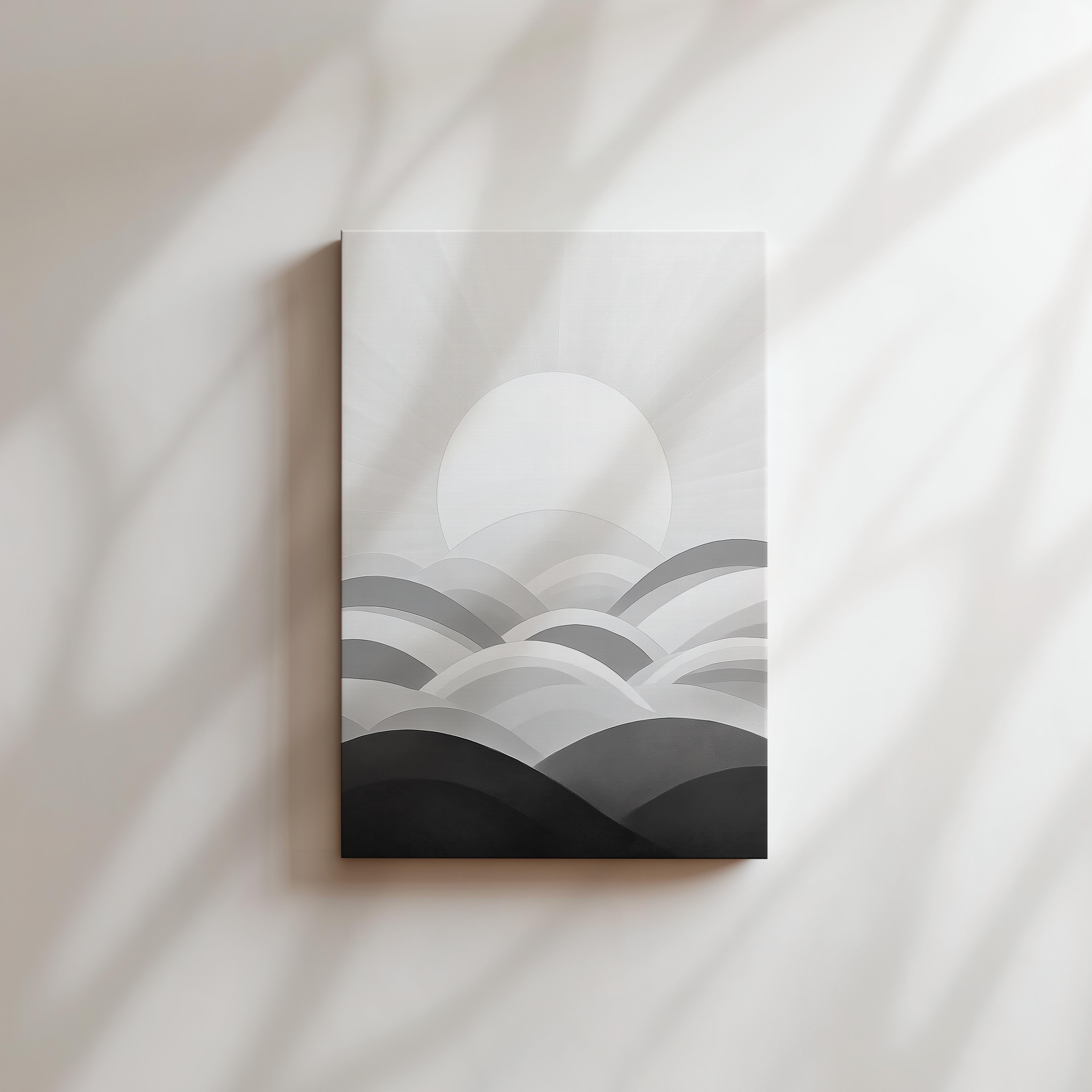 This image features a radiant sunrise or sunset casting light over a series of grayscale, layered hills. The simplicity of the design is both soothing and striking, with the glowing sun acting as the focal point. It represents themes of renewal, hope, and peace, making it ideal for meditation spaces, bedrooms, or calming interior decor. Its balance of minimalism and emotional depth makes it a versatile choice for various artistic or professional environments. Viewers are invited to reflect on the passage of time and the beauty of nature.