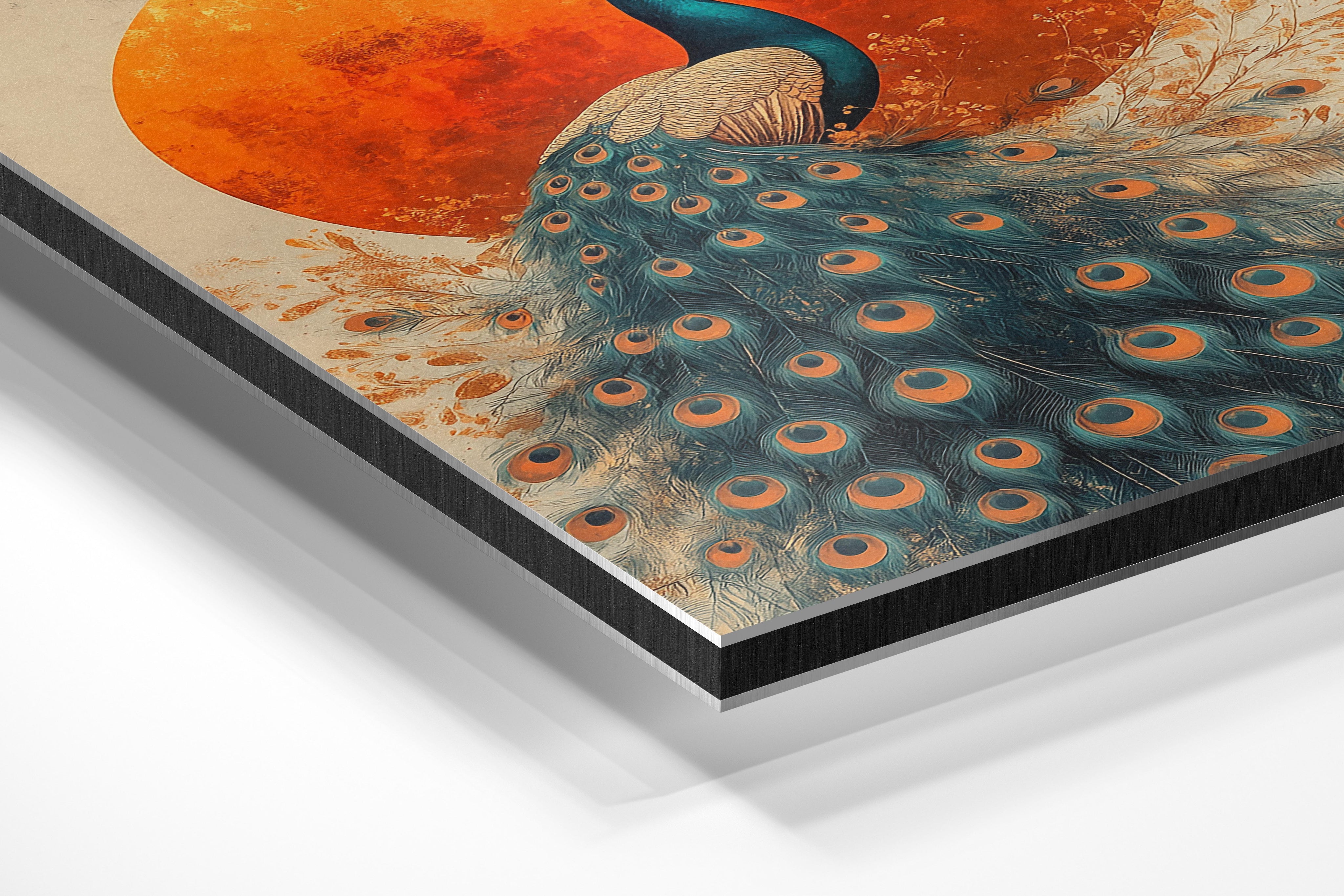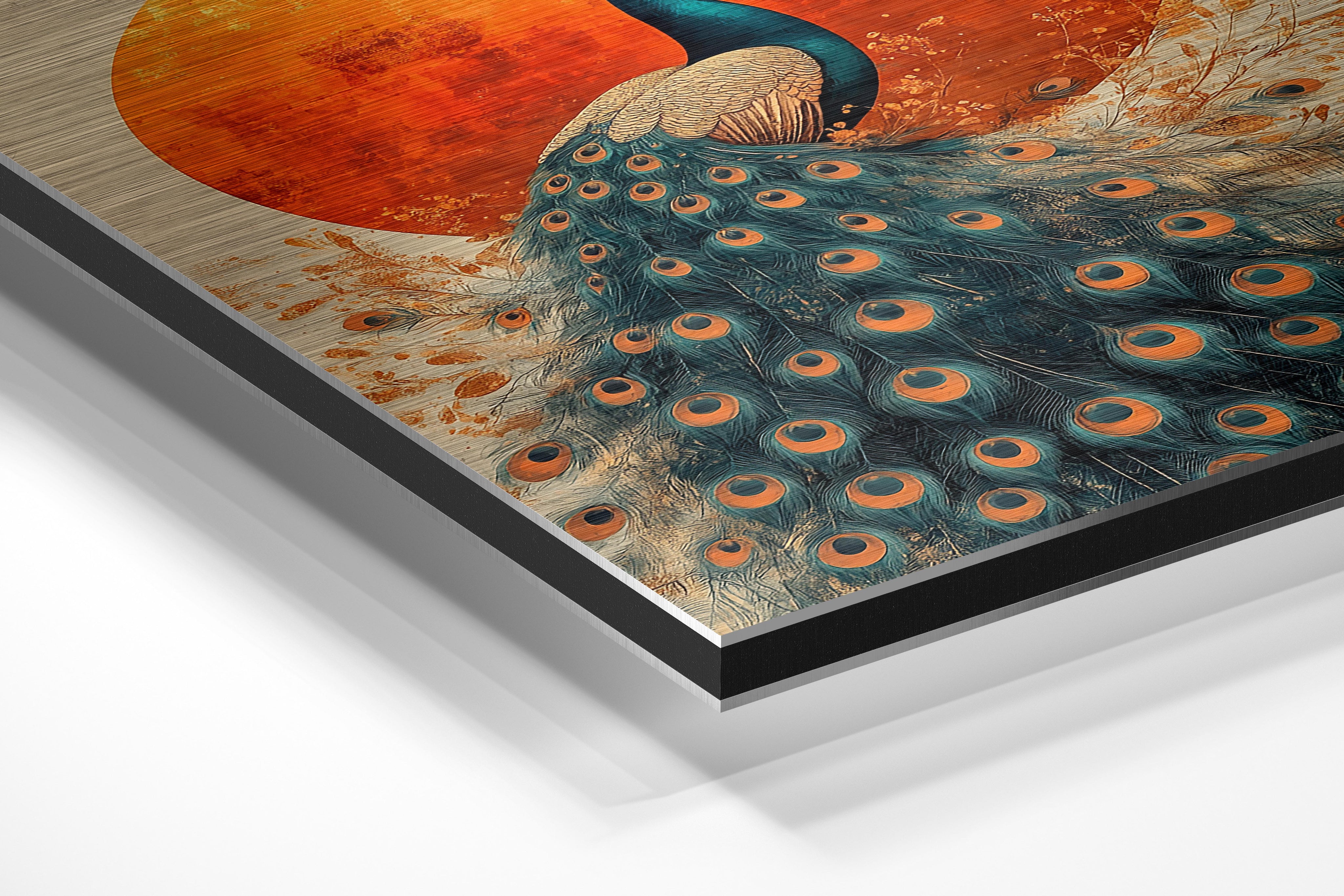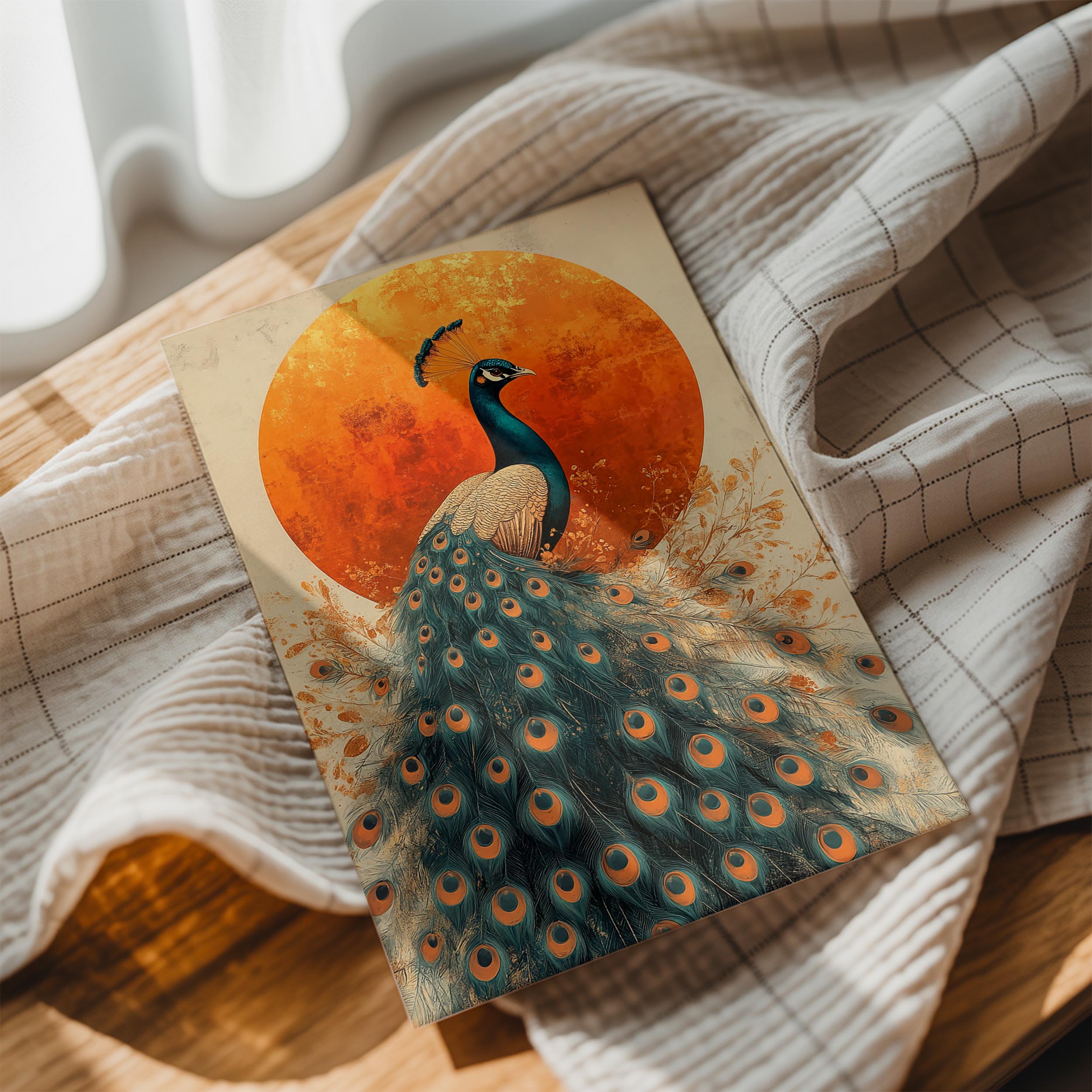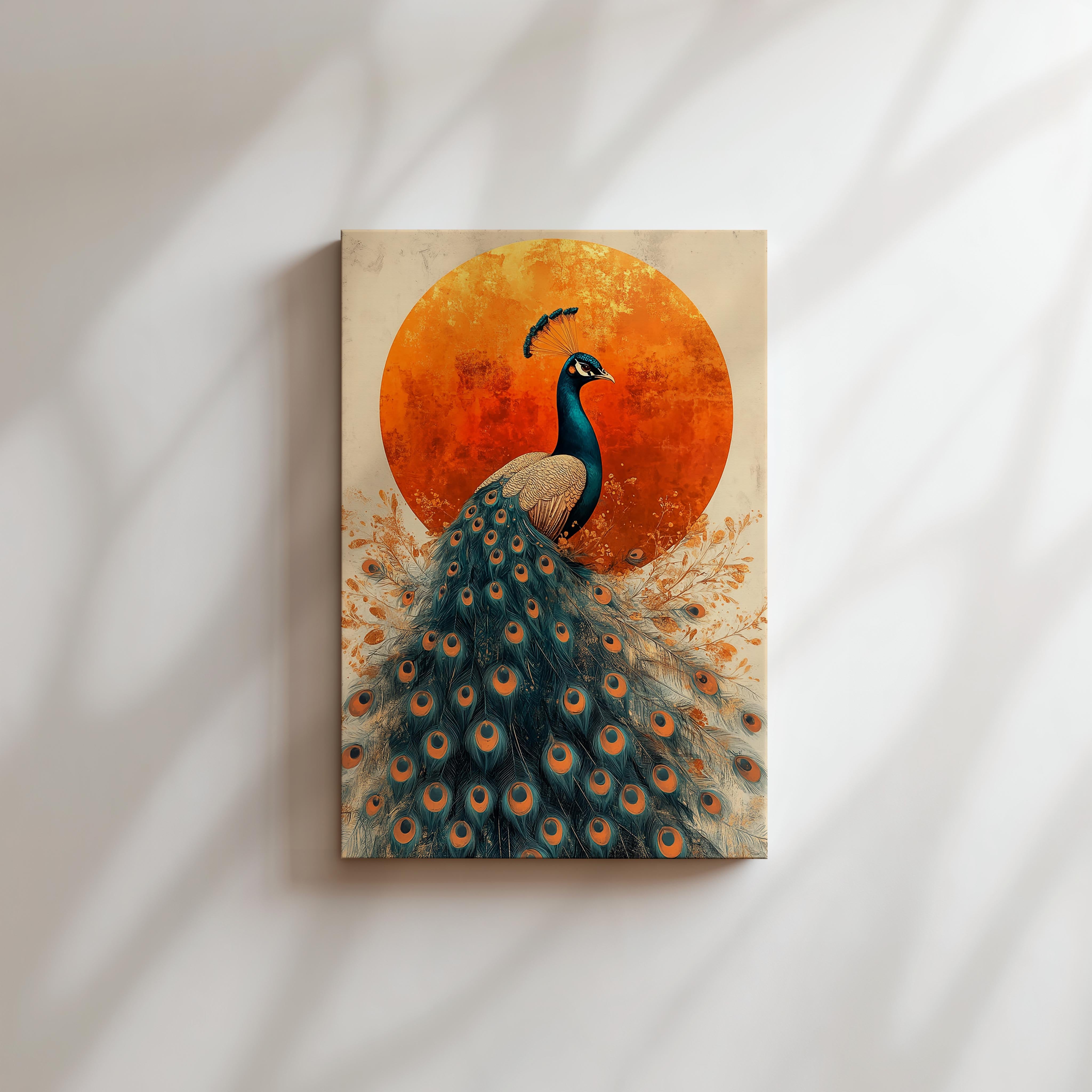 A breathtaking illustration of a peacock, its dazzling feathers cascading against a golden sun backdrop. The intricate feather details and the rich blue-green hues contrast beautifully with the warm golden tones. This regal artwork would make a luxurious statement in an elegant living space, bedroom, or grand hallway, evoking themes of beauty, confidence, and nobility.