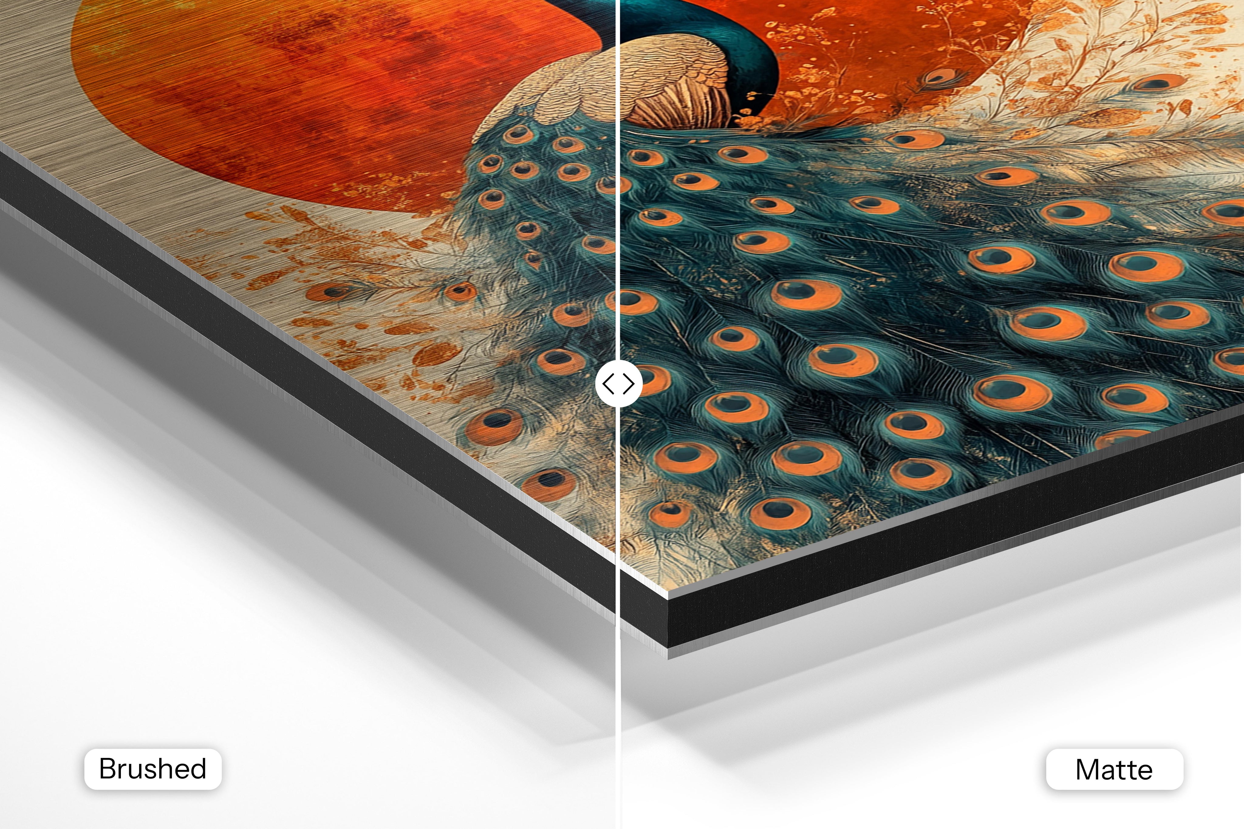 - Brushed Aluminum, on the other hand, features a raw metallic texture with visible brush strokes. Whites and highlights in your image let the silver surface show through, adding a dramatic, shimmering effect. Ideal for black-and-white images, minimalist designs, or abstract art, it creates a bold, industrial vibe with a modern edge.