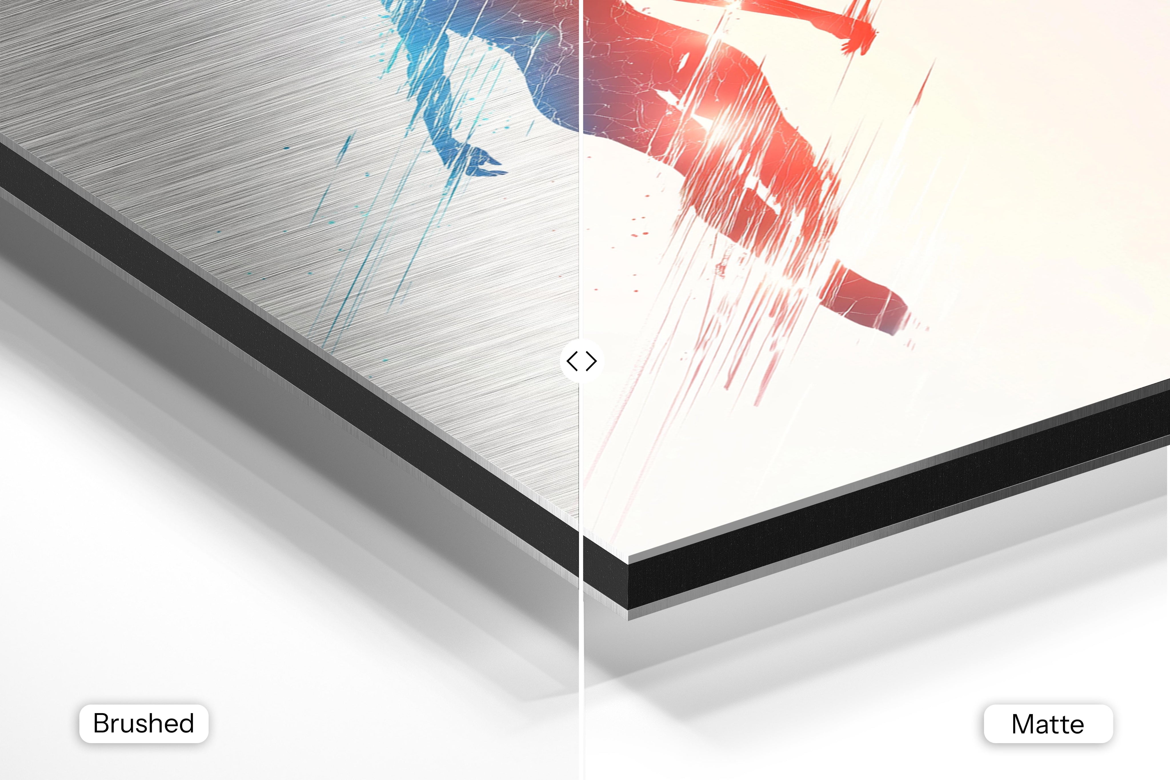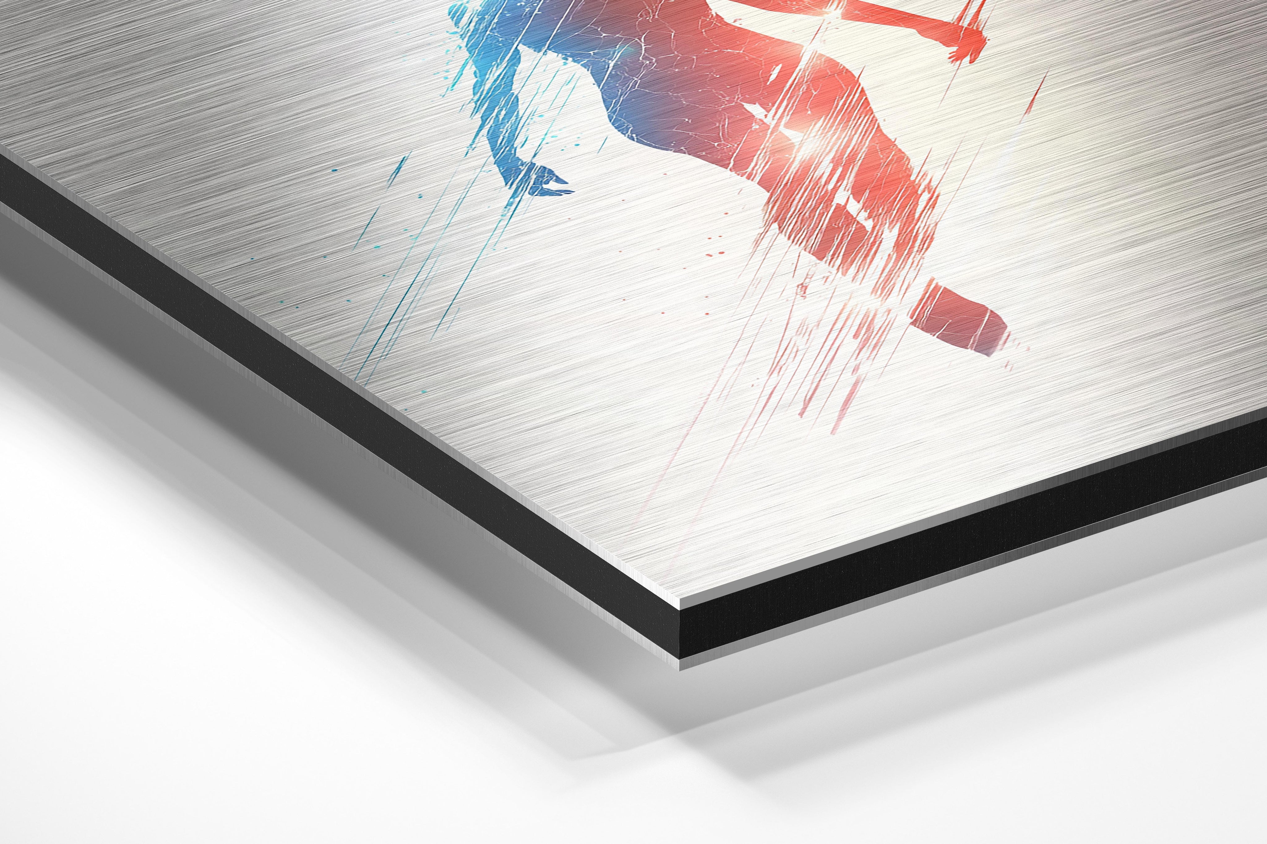 - Brushed Aluminum, on the other hand, features a raw metallic texture with visible brush strokes. Whites and highlights in your image let the silver surface show through, adding a dramatic, shimmering effect. Ideal for black-and-white images, minimalist designs, or abstract art, it creates a bold, industrial vibe with a modern edge.