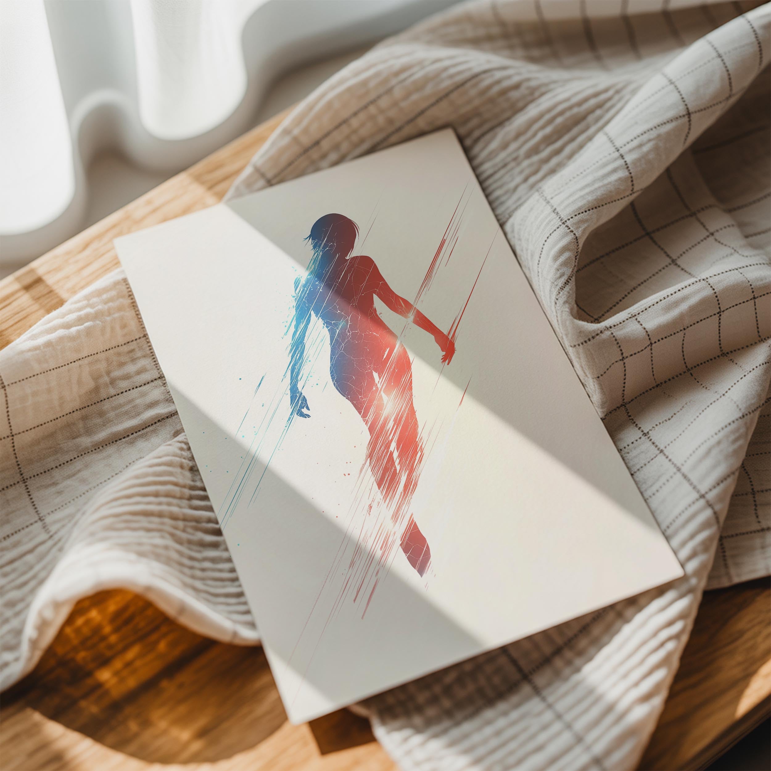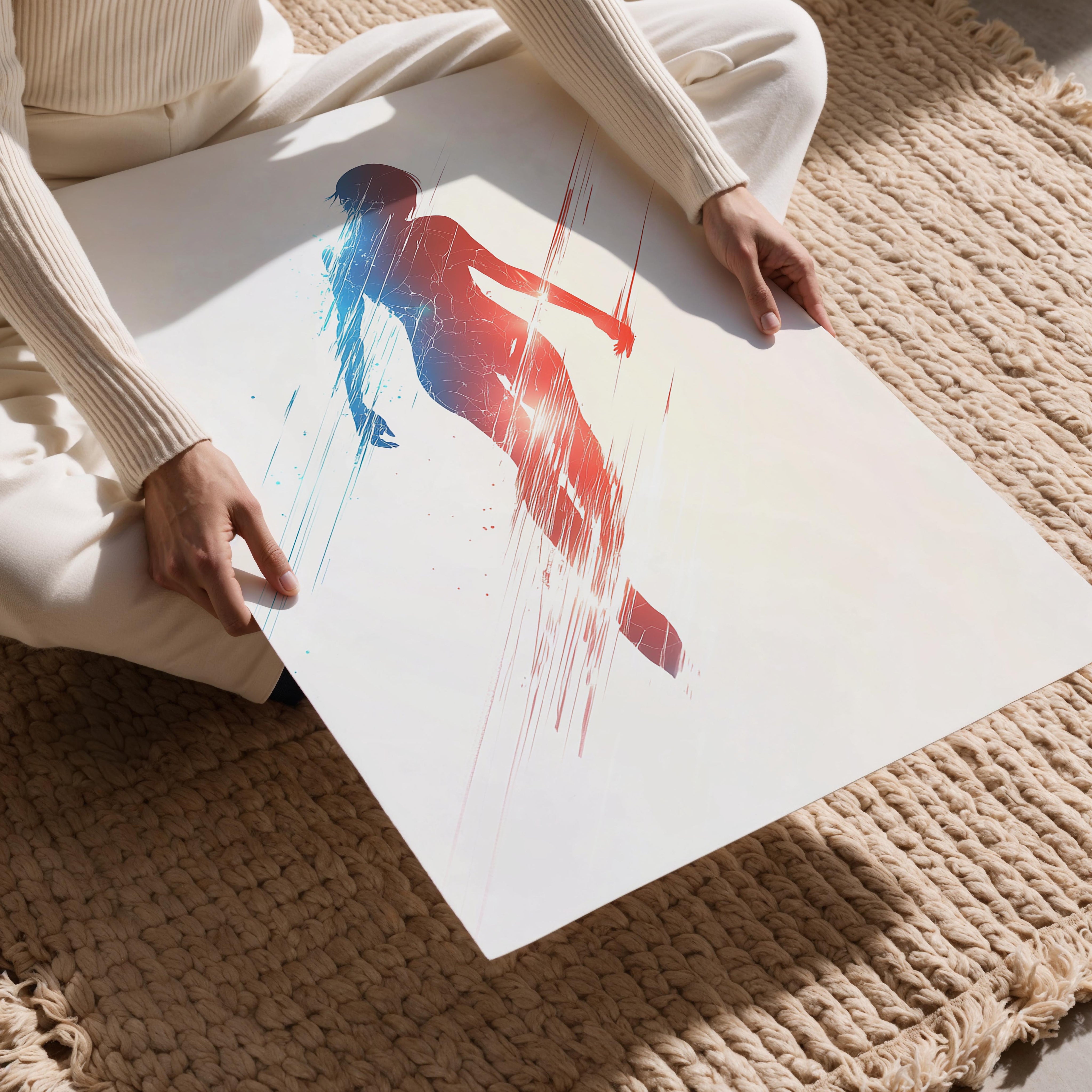 This artwork features a striking silhouette of a human figure outlined with vibrant streaks of blue and red. The abstract nature evokes a sense of energy and motion, with the fading edges giving the impression of a figure in transformation or transition. This piece would be perfect for modern living spaces, evoking themes of energy, duality, and resilience. The gradient background enhances the central focus while providing a calming aura that balances the dynamic subject. It is an ideal centerpiece for creative offices or as a motivational piece in personal spaces.