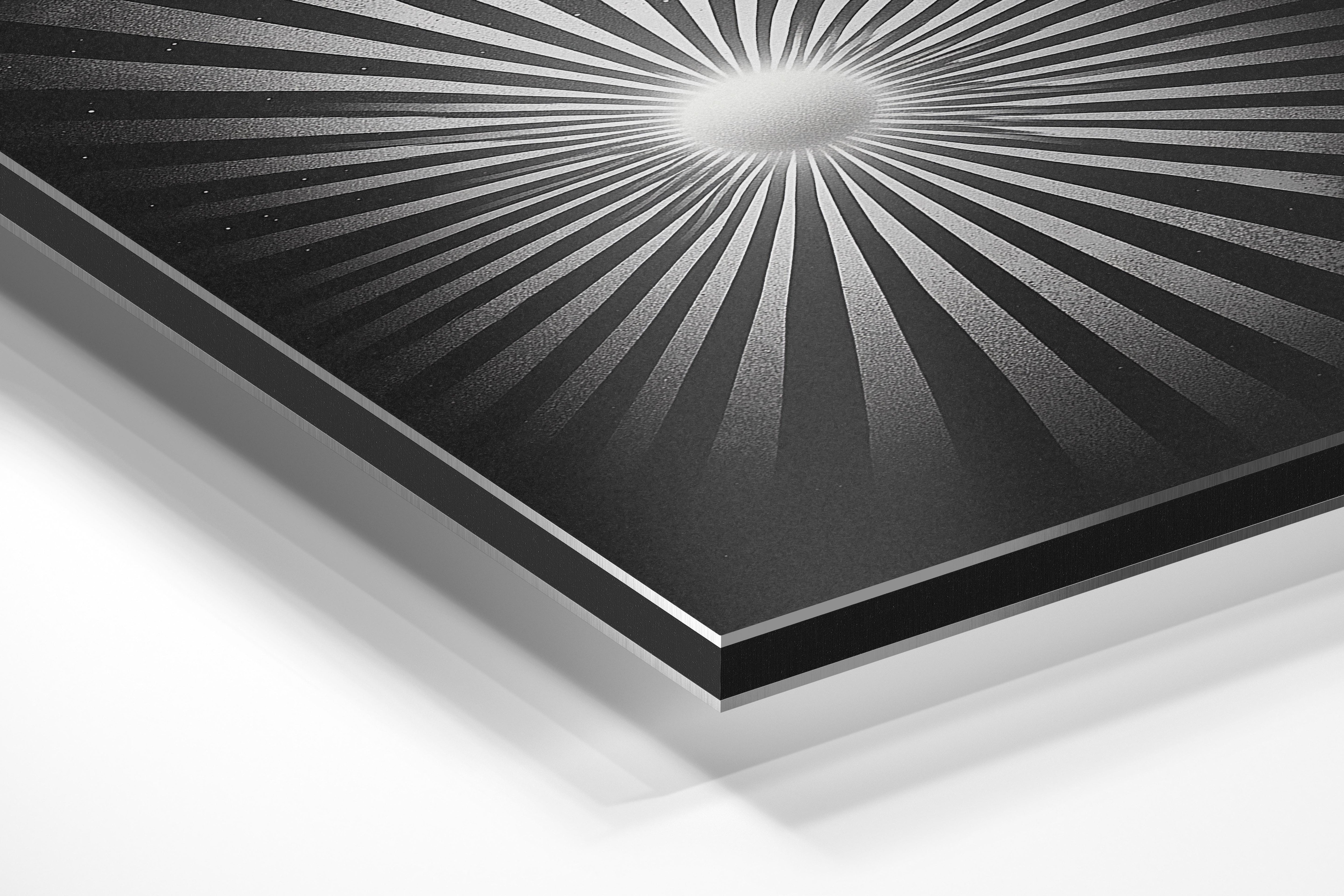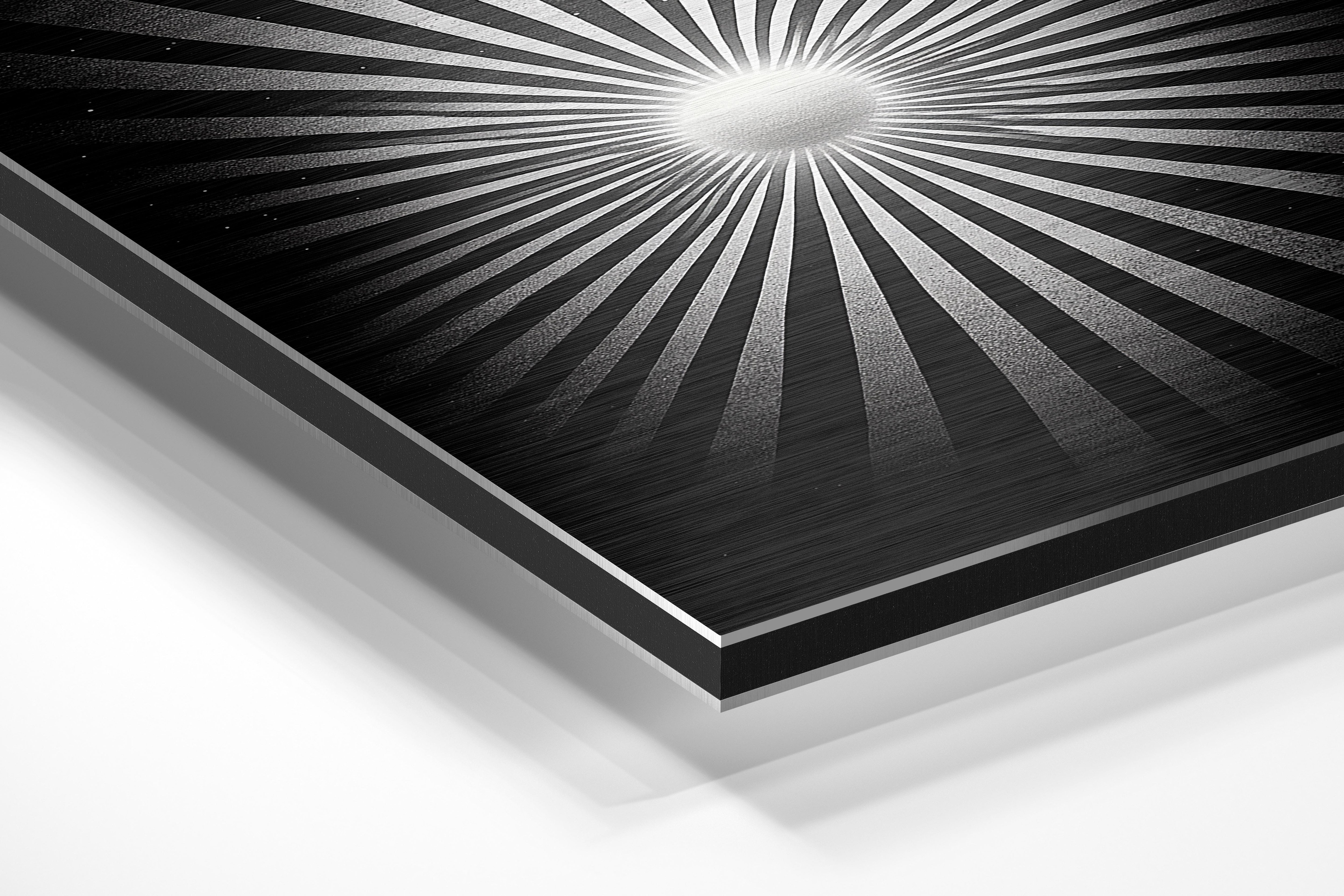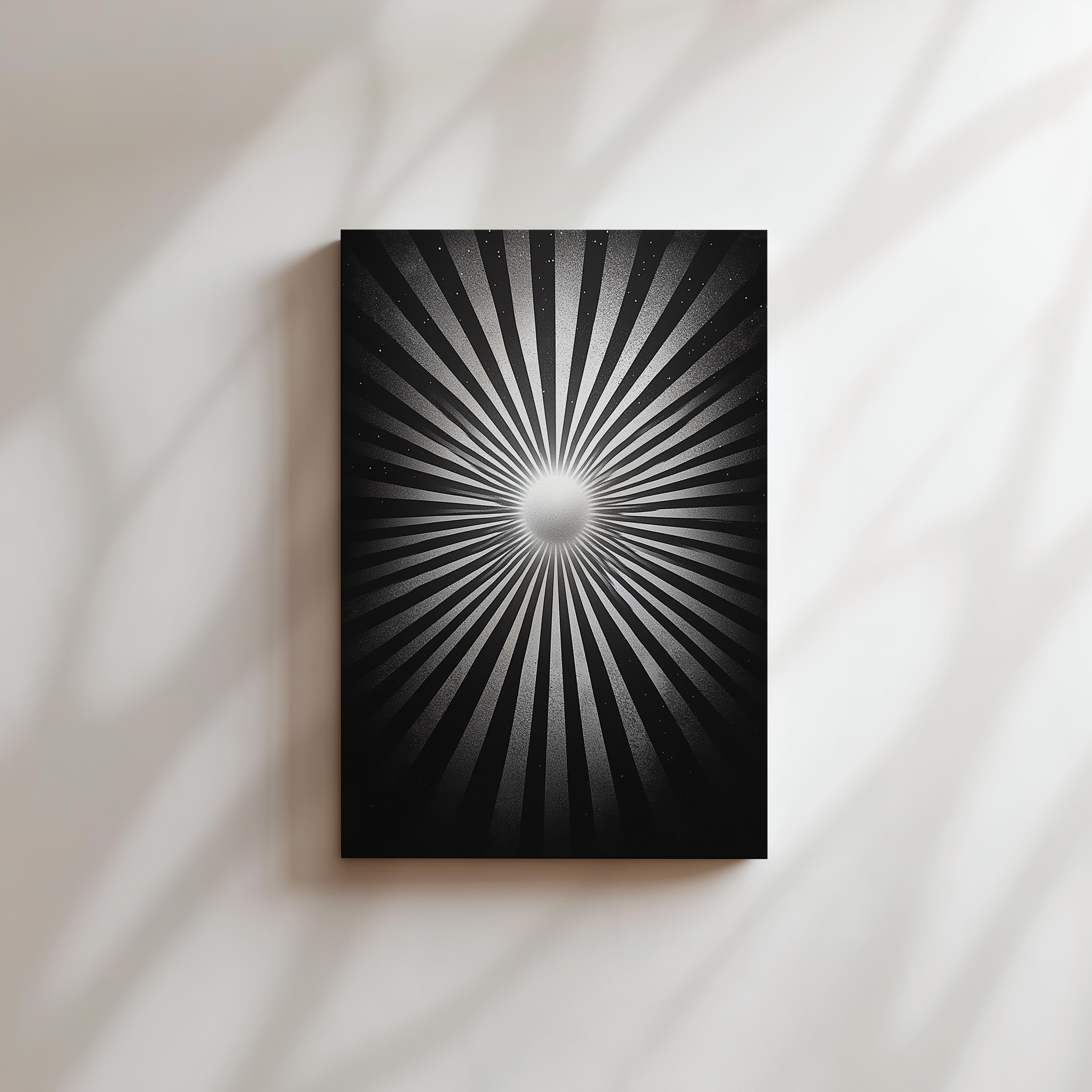 A stunning monochromatic artwork featuring a radiant starburst design. Sharp, geometric rays emanate symmetrically from a central glowing point, resembling a supernova or celestial phenomenon. This minimalist piece blends modern aesthetics with a cosmic theme, making it ideal for contemporary interiors. The high-contrast black-and-white design pairs beautifully with neutral or metallic decor, perfect for an office or living room accent wall.