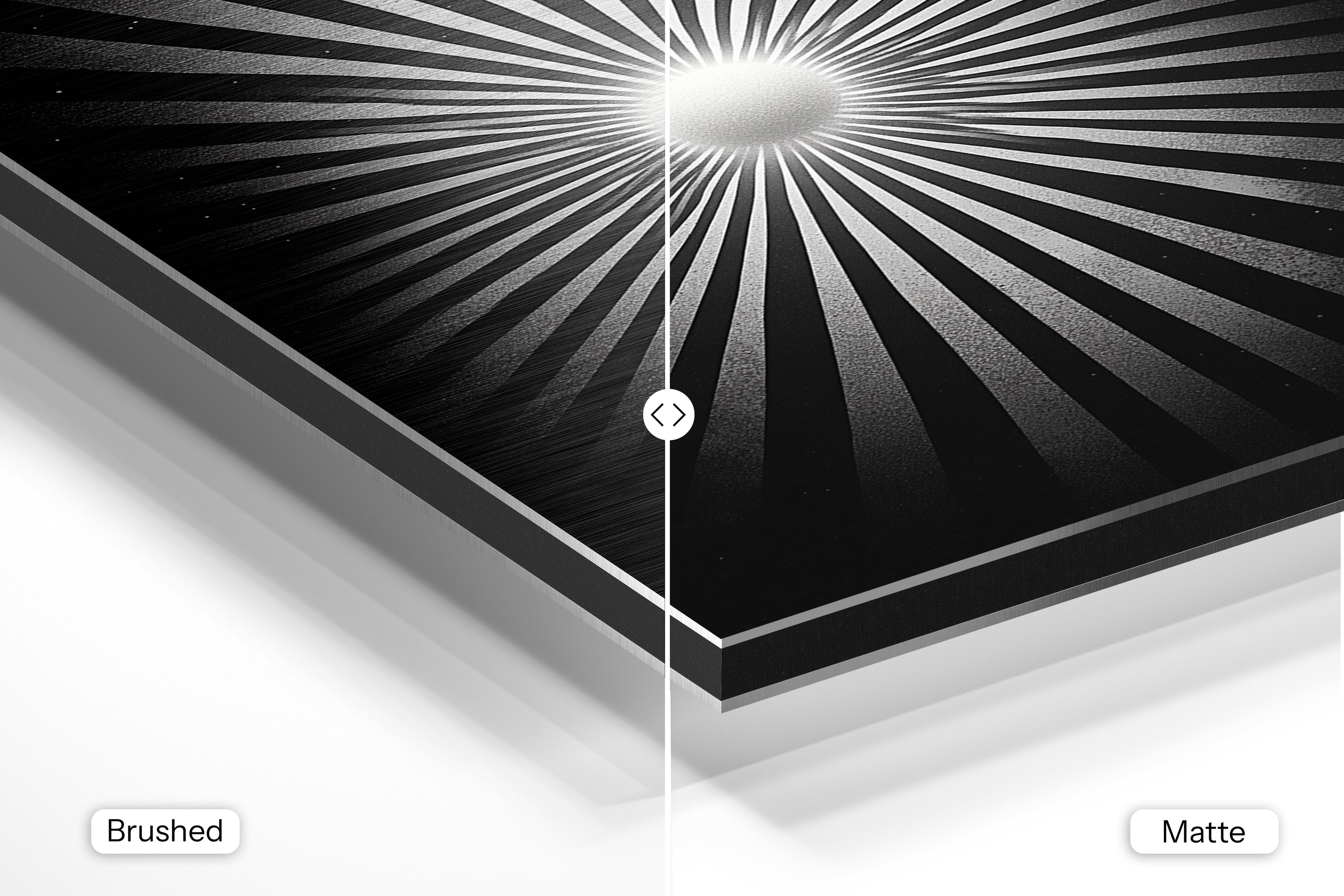 - Brushed Aluminum, on the other hand, features a raw metallic texture with visible brush strokes. Whites and highlights in your image let the silver surface show through, adding a dramatic, shimmering effect. Ideal for black-and-white images, minimalist designs, or abstract art, it creates a bold, industrial vibe with a modern edge.