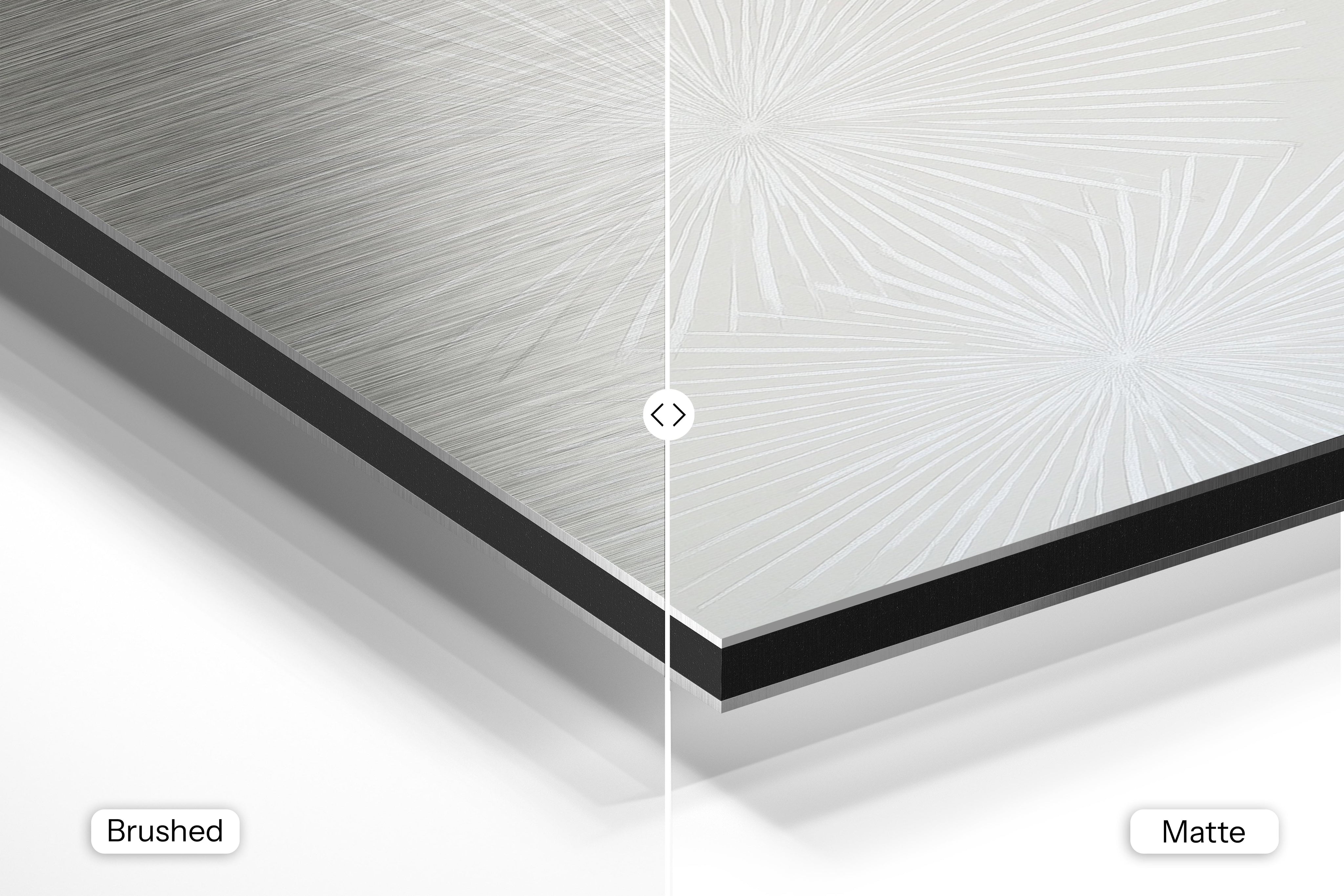 - Brushed Aluminum, on the other hand, features a raw metallic texture with visible brush strokes. Whites and highlights in your image let the silver surface show through, adding a dramatic, shimmering effect. Ideal for black-and-white images, minimalist designs, or abstract art, it creates a bold, industrial vibe with a modern edge.