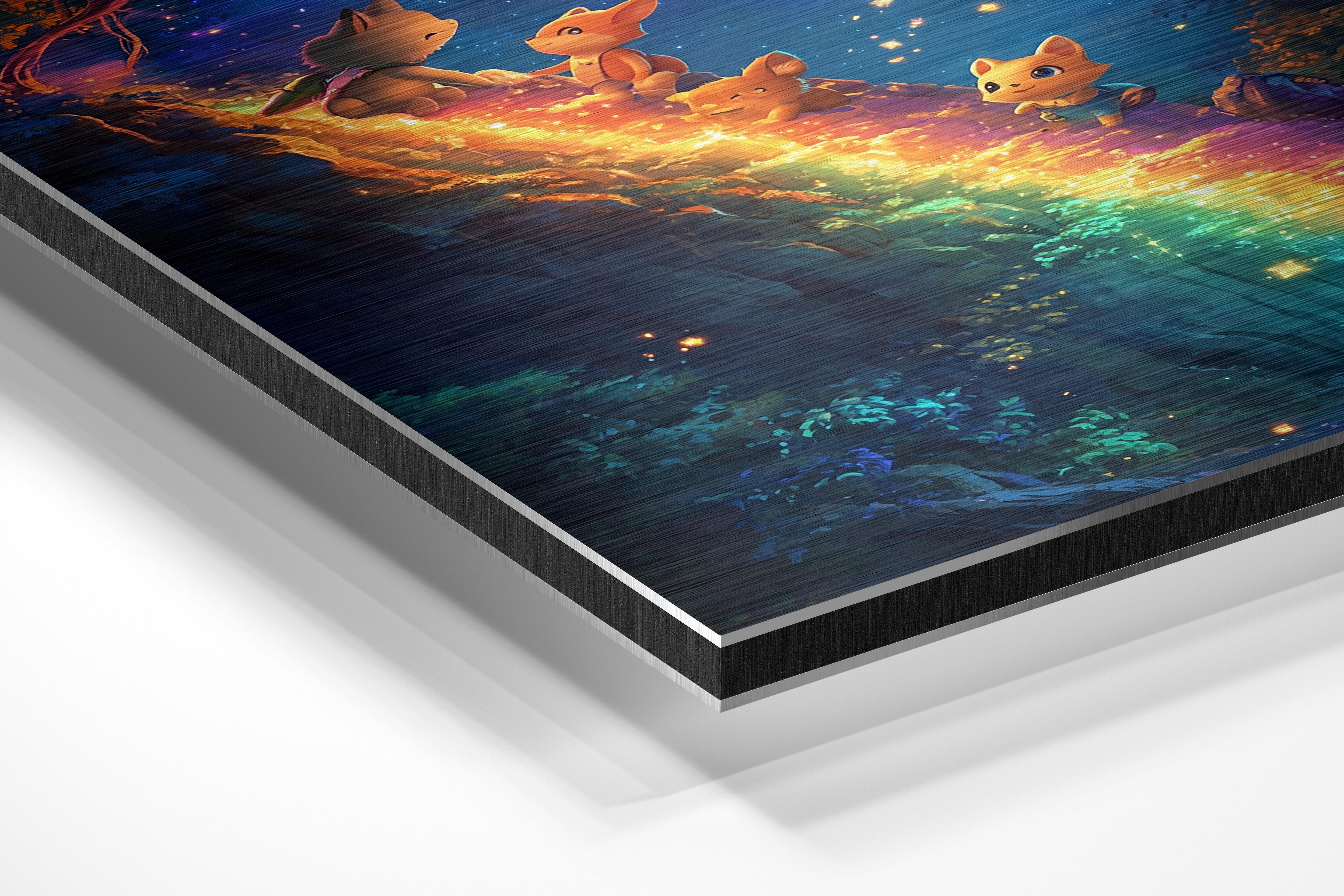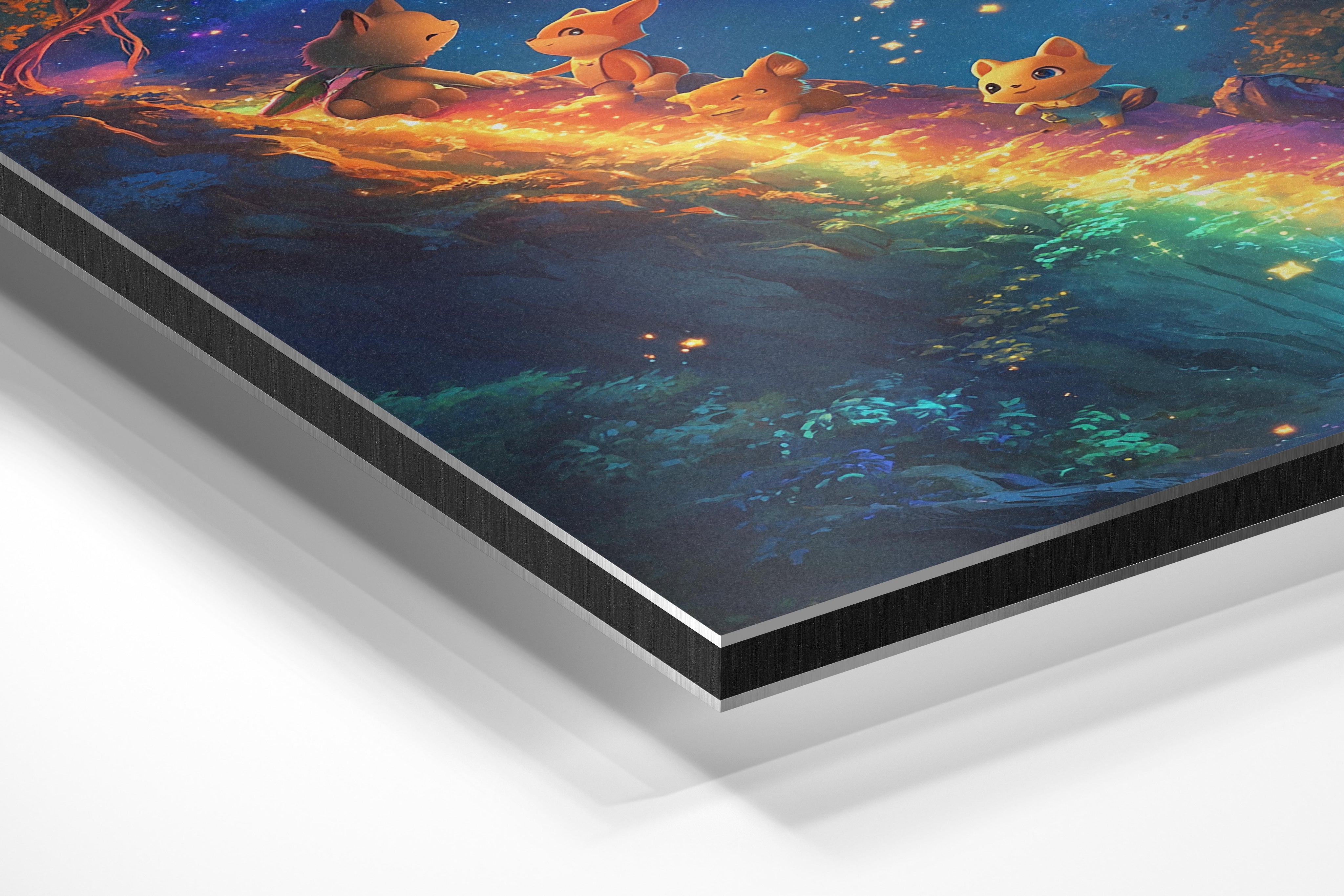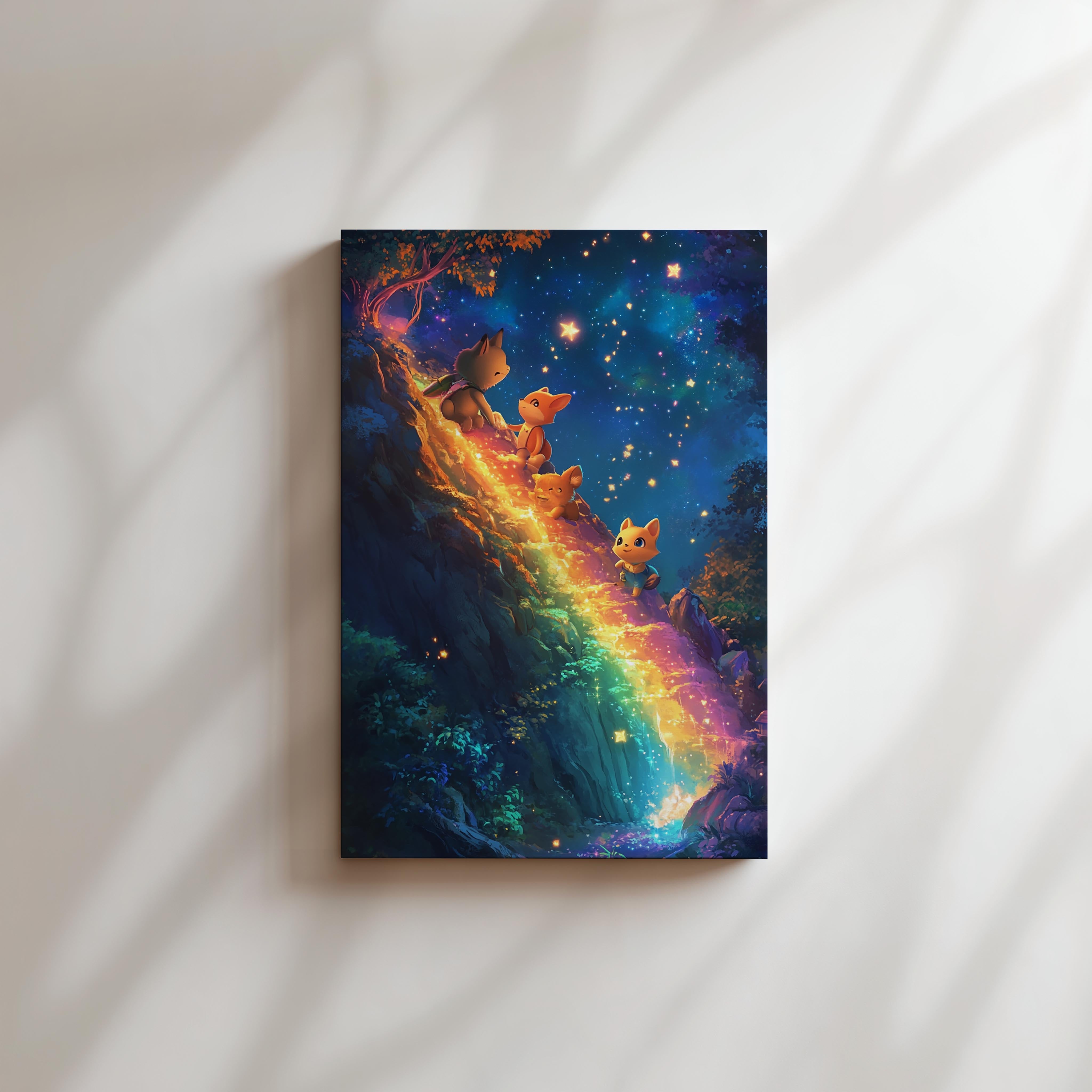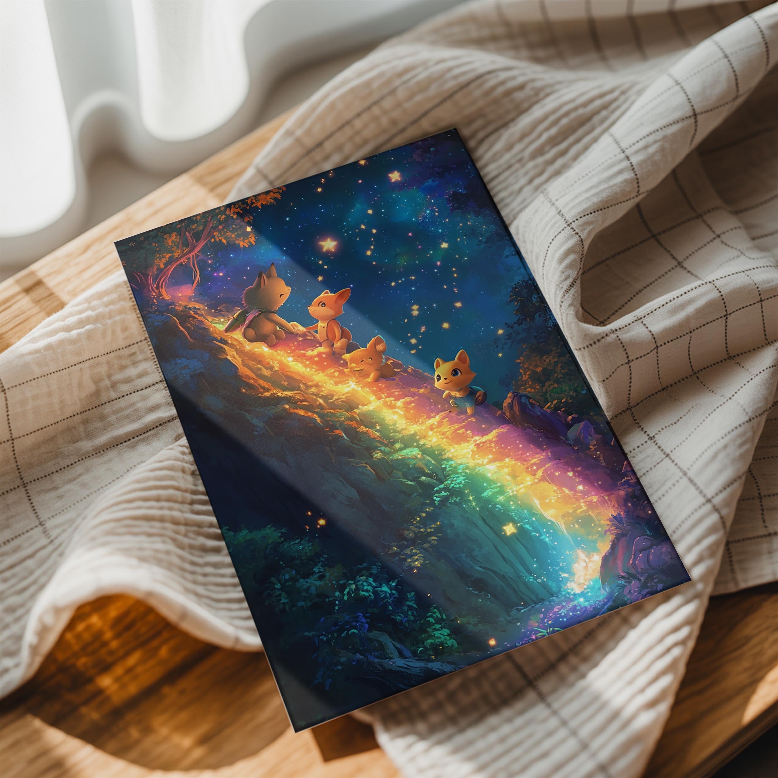 This captivating artwork depicts a group of adorable cats climbing a radiant rainbow trail that lights up the surrounding forest. The combination of deep greens and glowing rainbow hues creates a magical and enchanting ambiance. Perfect for cat lovers or those seeking a piece that radiates charm and fantasy, this illustration invites viewers to explore the beauty of dreams and imagination.