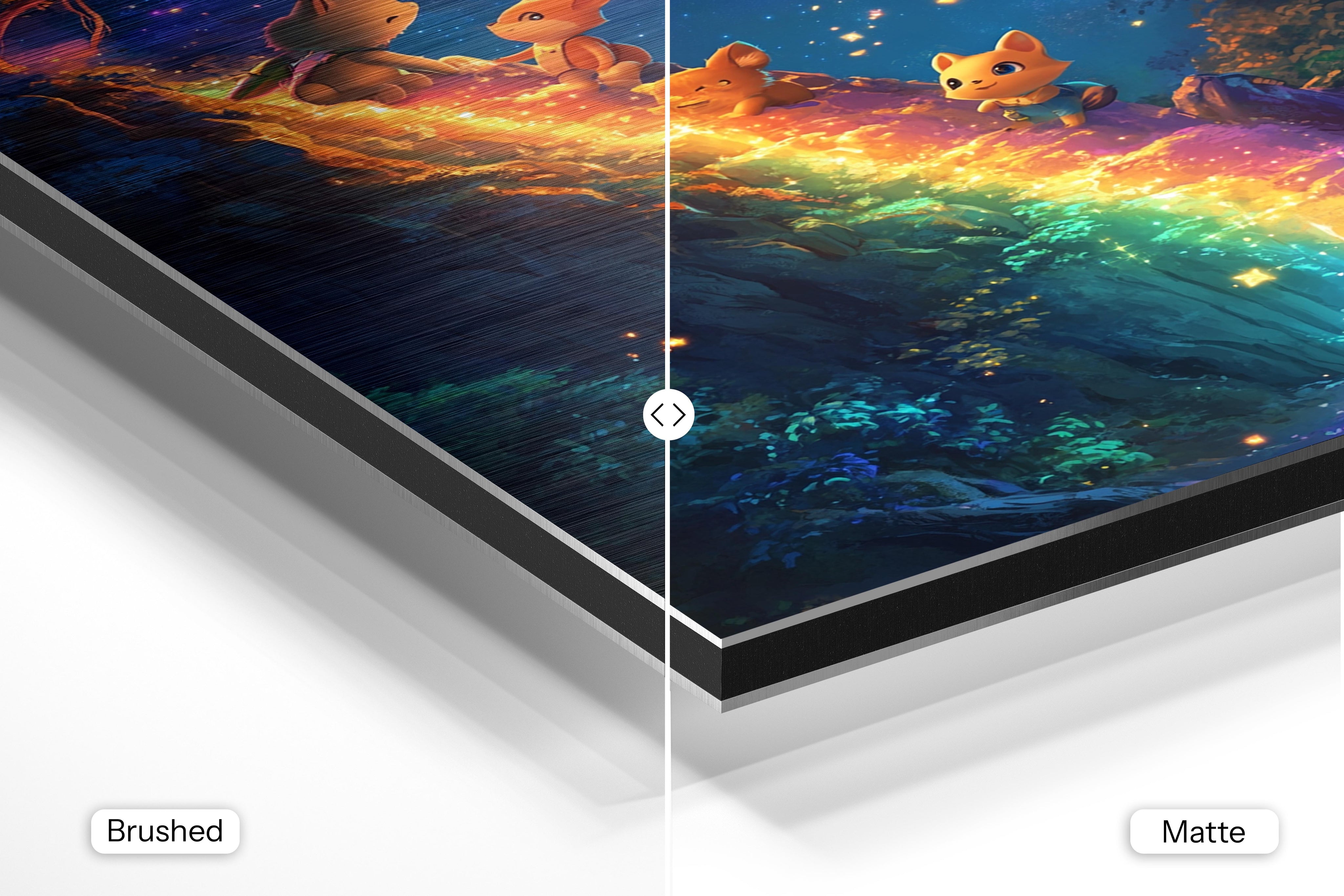 - Brushed Aluminum, on the other hand, features a raw metallic texture with visible brush strokes. Whites and highlights in your image let the silver surface show through, adding a dramatic, shimmering effect. Ideal for black-and-white images, minimalist designs, or abstract art, it creates a bold, industrial vibe with a modern edge.