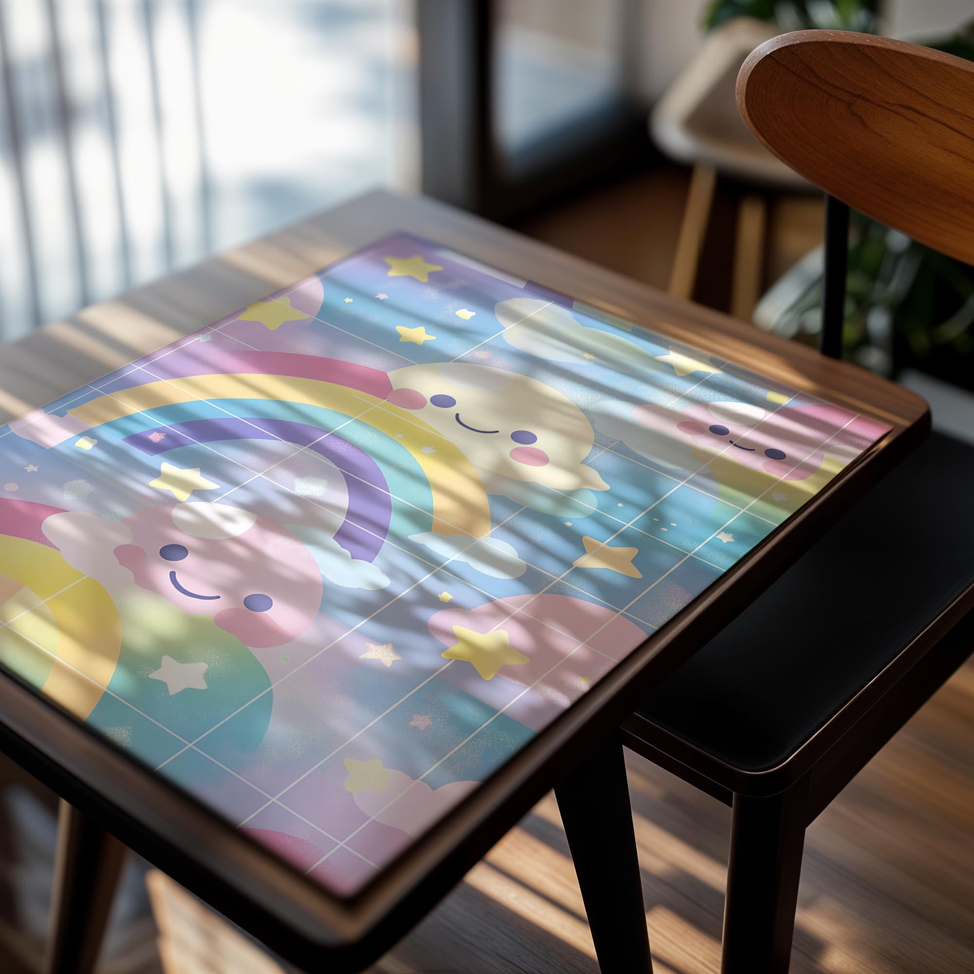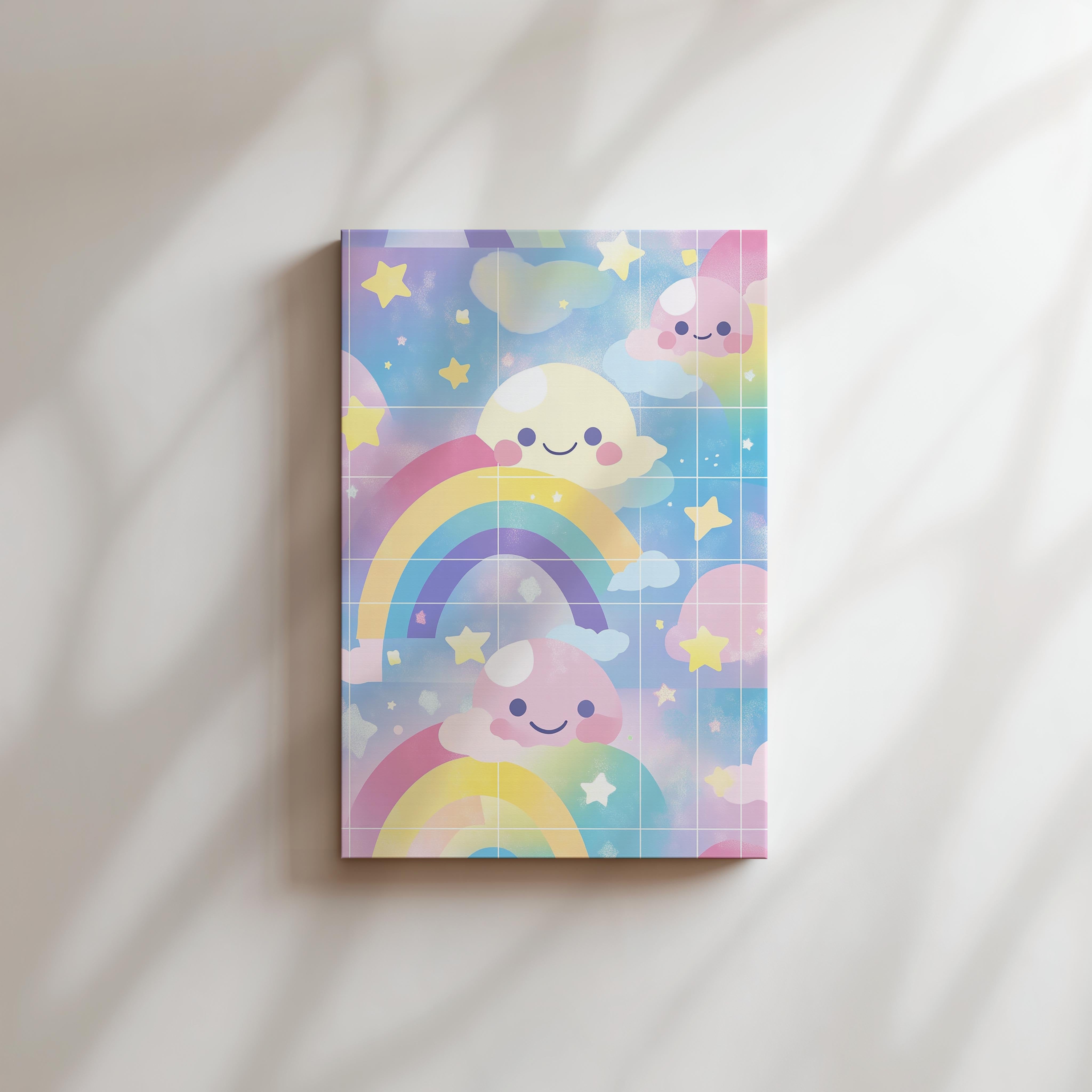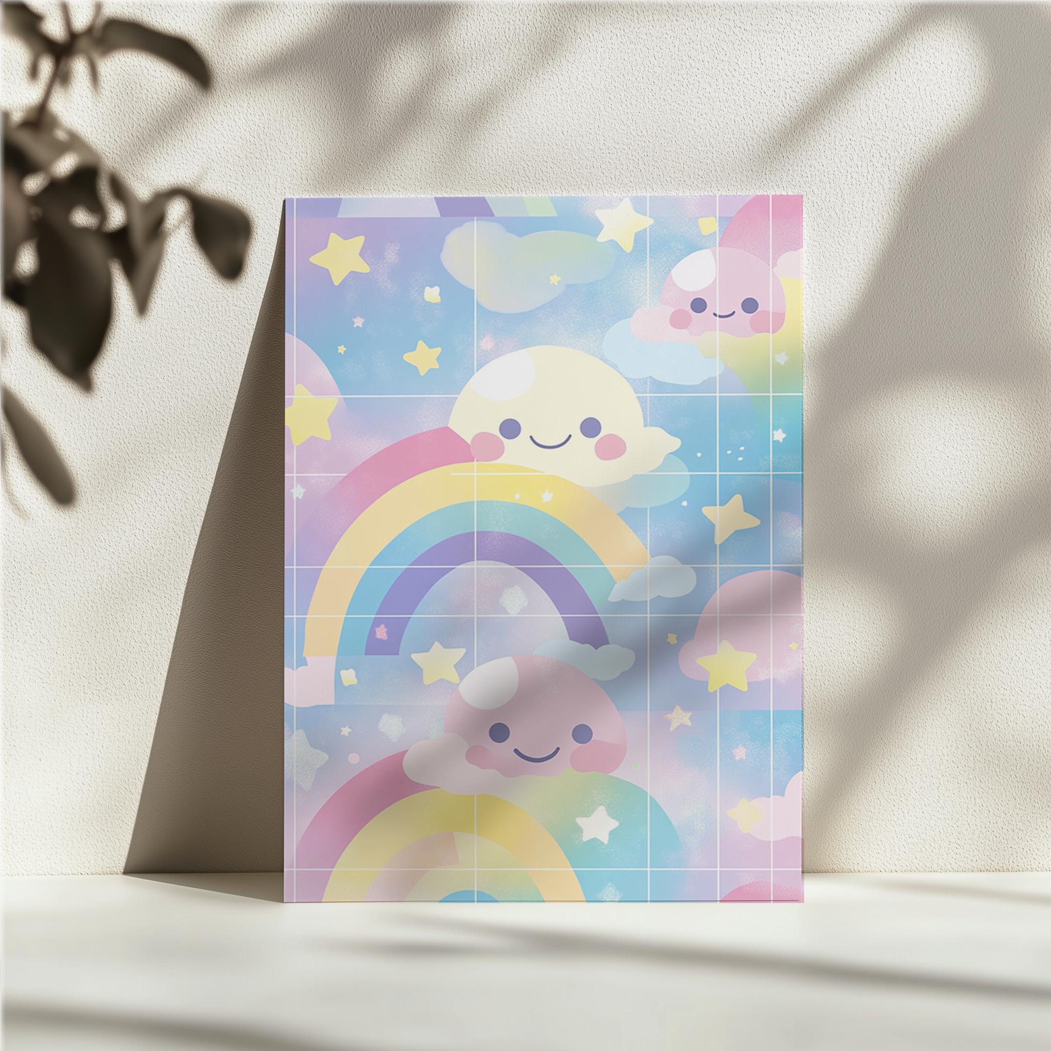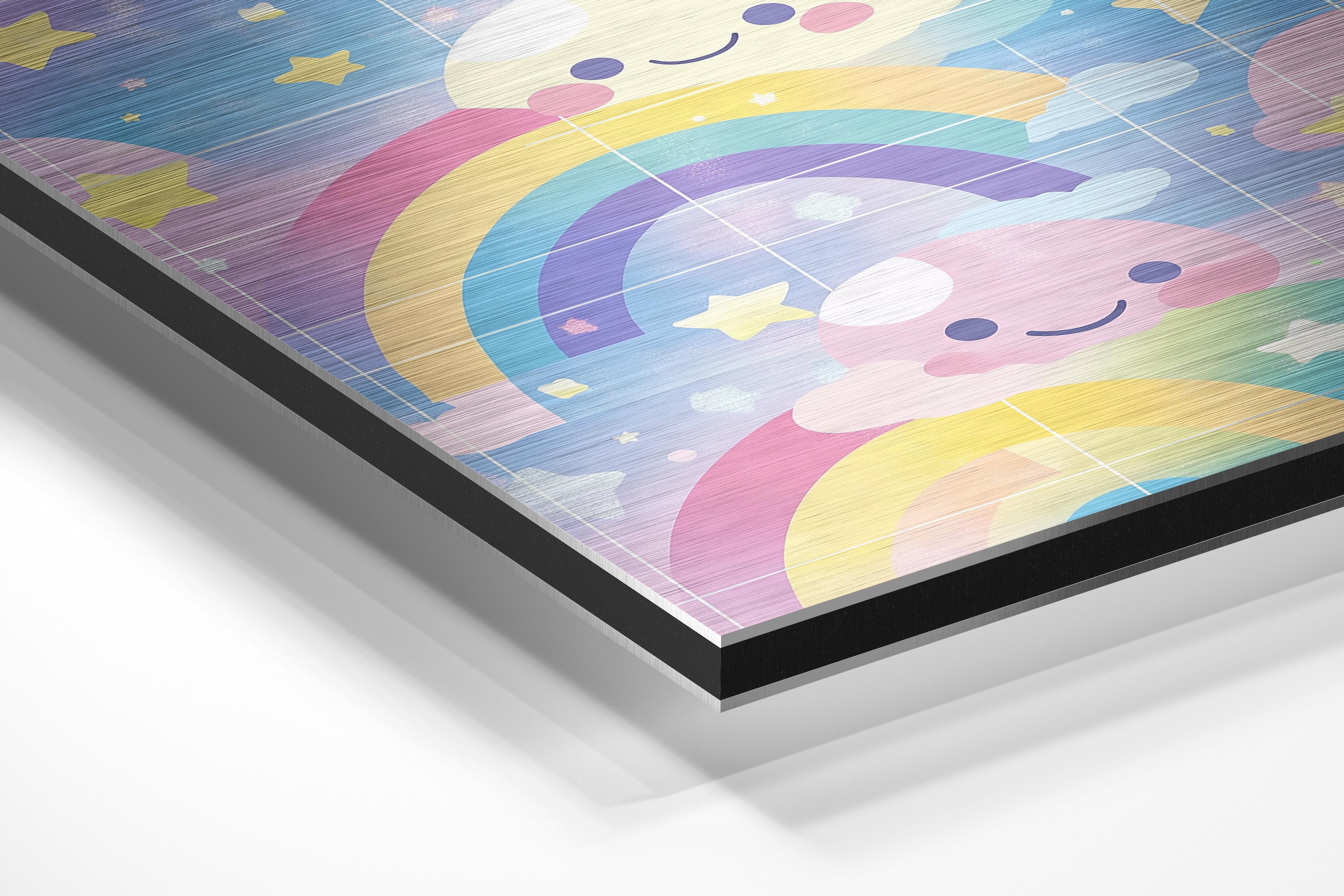 A cheerful illustration showcasing rainbows and smiling clouds, adorned with bright stars and soft pastel hues. The playful and happy theme makes this artwork perfect for children’s rooms, nurseries, or play areas. Its whimsical charm and vibrant colors inspire joy and positivity, making it a delightful addition to spaces where fun and imagination are celebrated. This piece brings a sunny and uplifting atmosphere to any environment.
