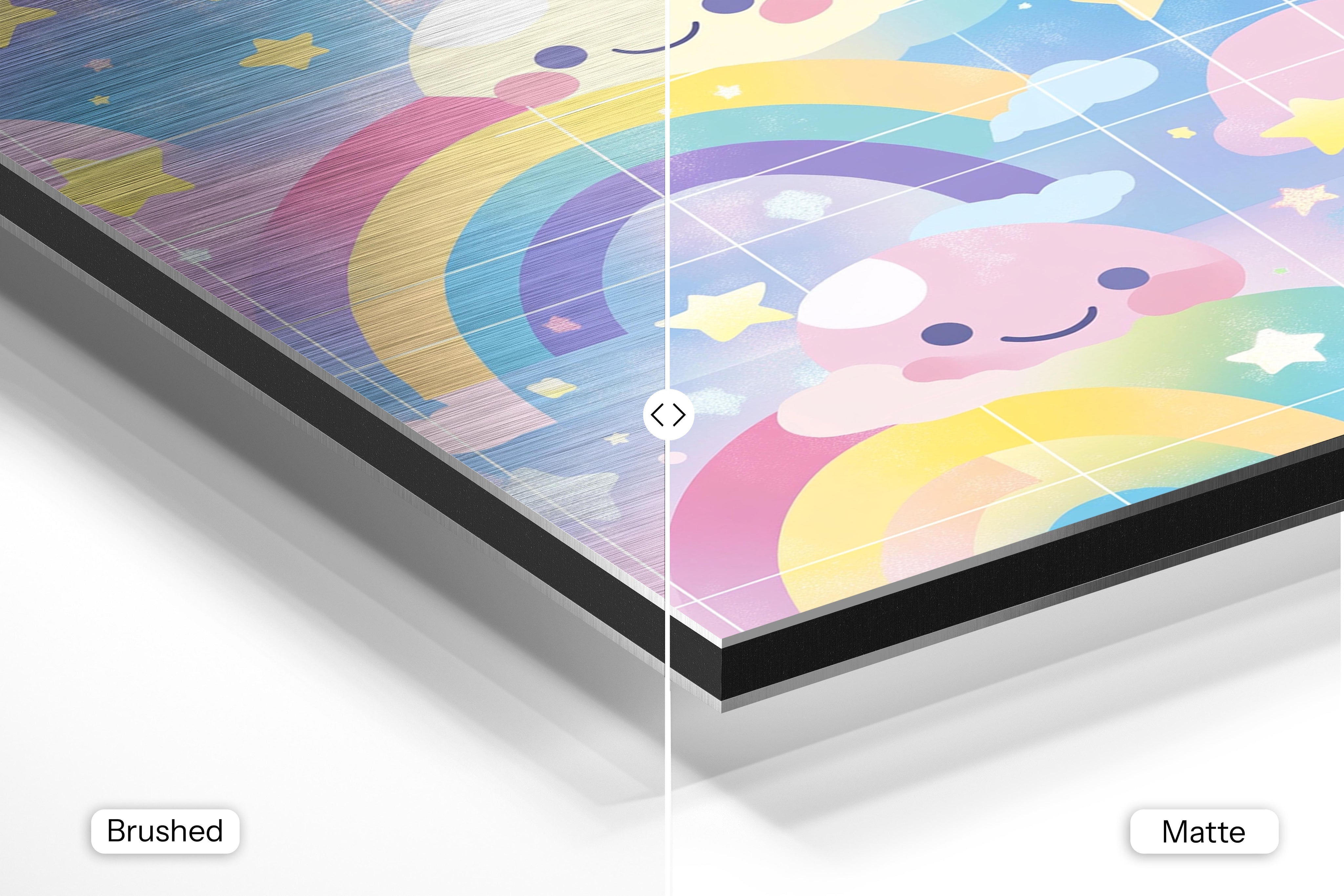 - Matte Aluminum offers a smooth, bright white surface that delivers crisp details and vibrant, true-to-life colors. With its non-reflective finish and subtle silky sheen, it’s perfect for photography, portraits, and colorful artwork—bringing a clean, polished look to any interior.