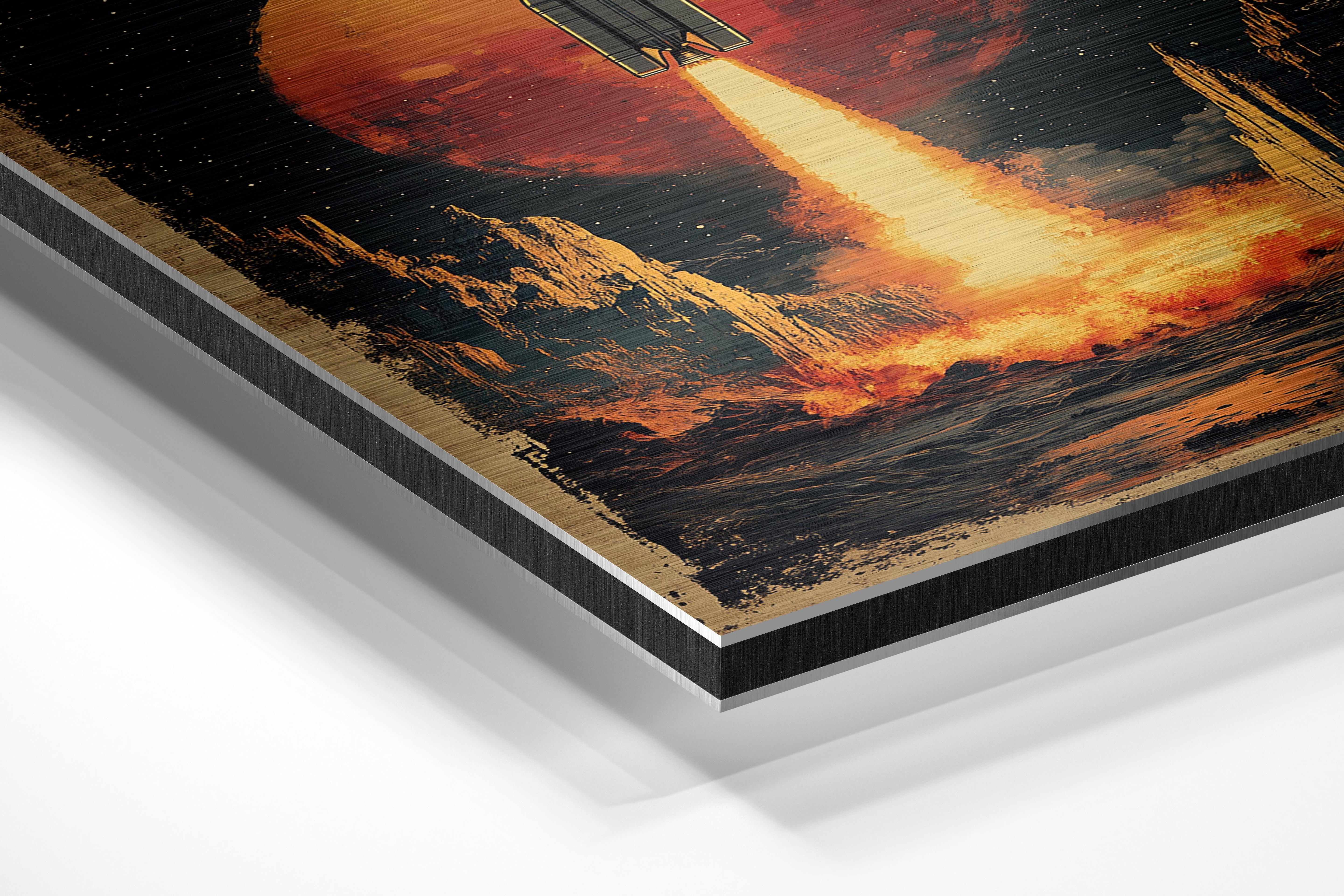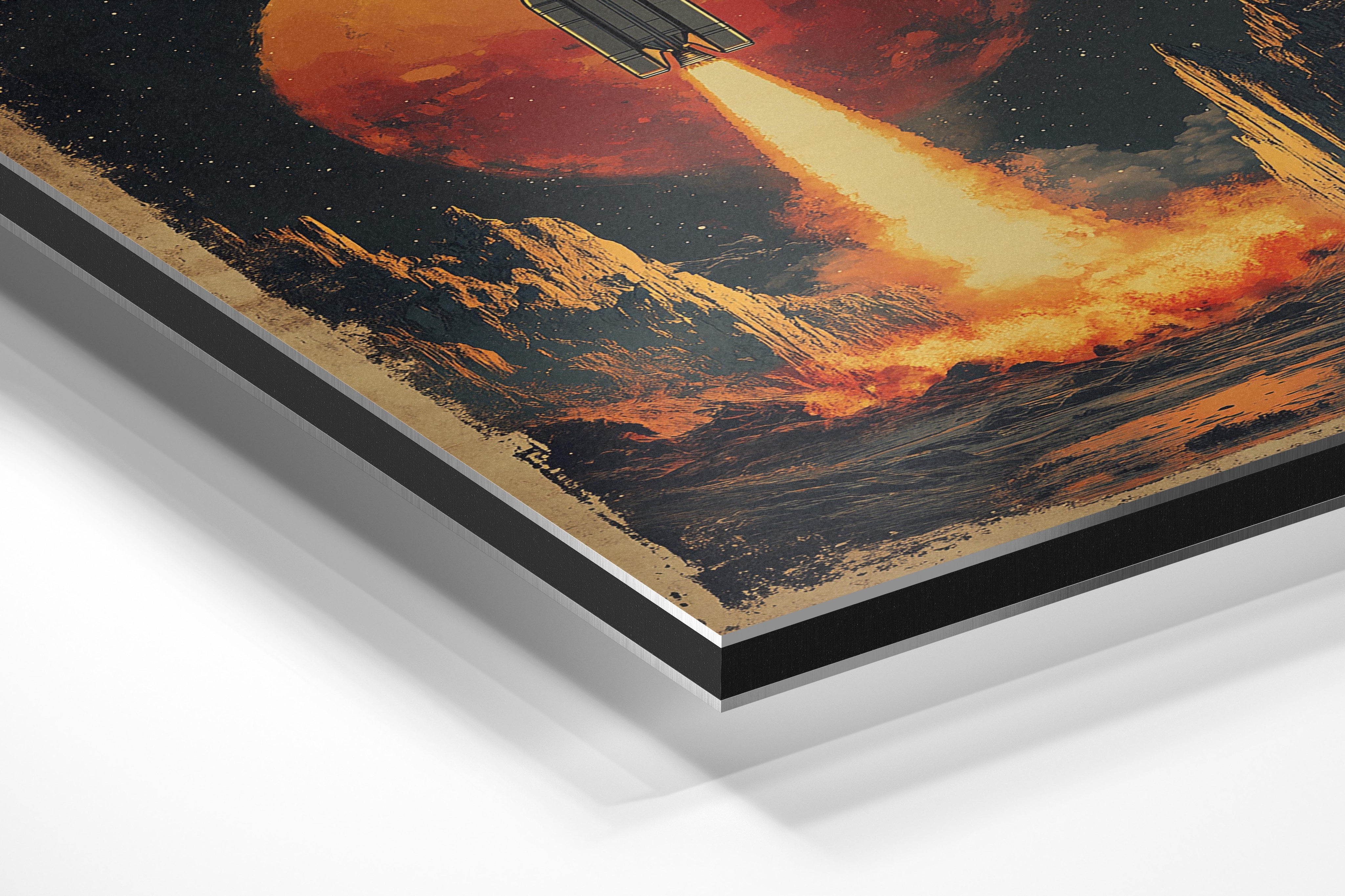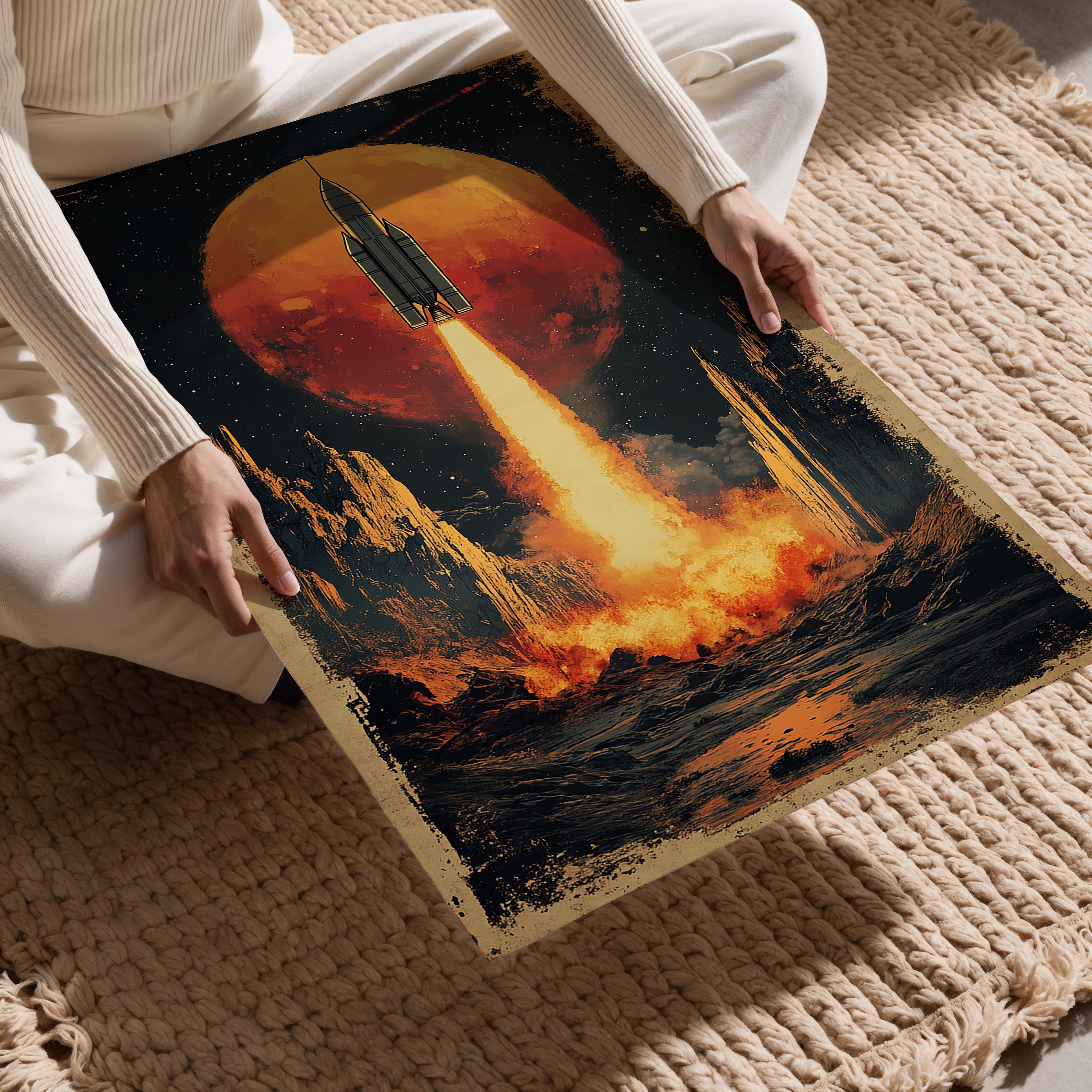 Featuring a rocket launch with the glowing red moon in the backdrop, this artwork conveys power and mystery. The stark contrast between the fiery rocket propulsion and the lunar surface creates a dramatic visual. It appeals to space enthusiasts, dreamers, and modern art lovers. Perfect for display in offices, galleries, or study spaces, its combination of natural and technological elements invites exploration of the unknown. Its bold, warm hues add depth and vibrancy to any room.