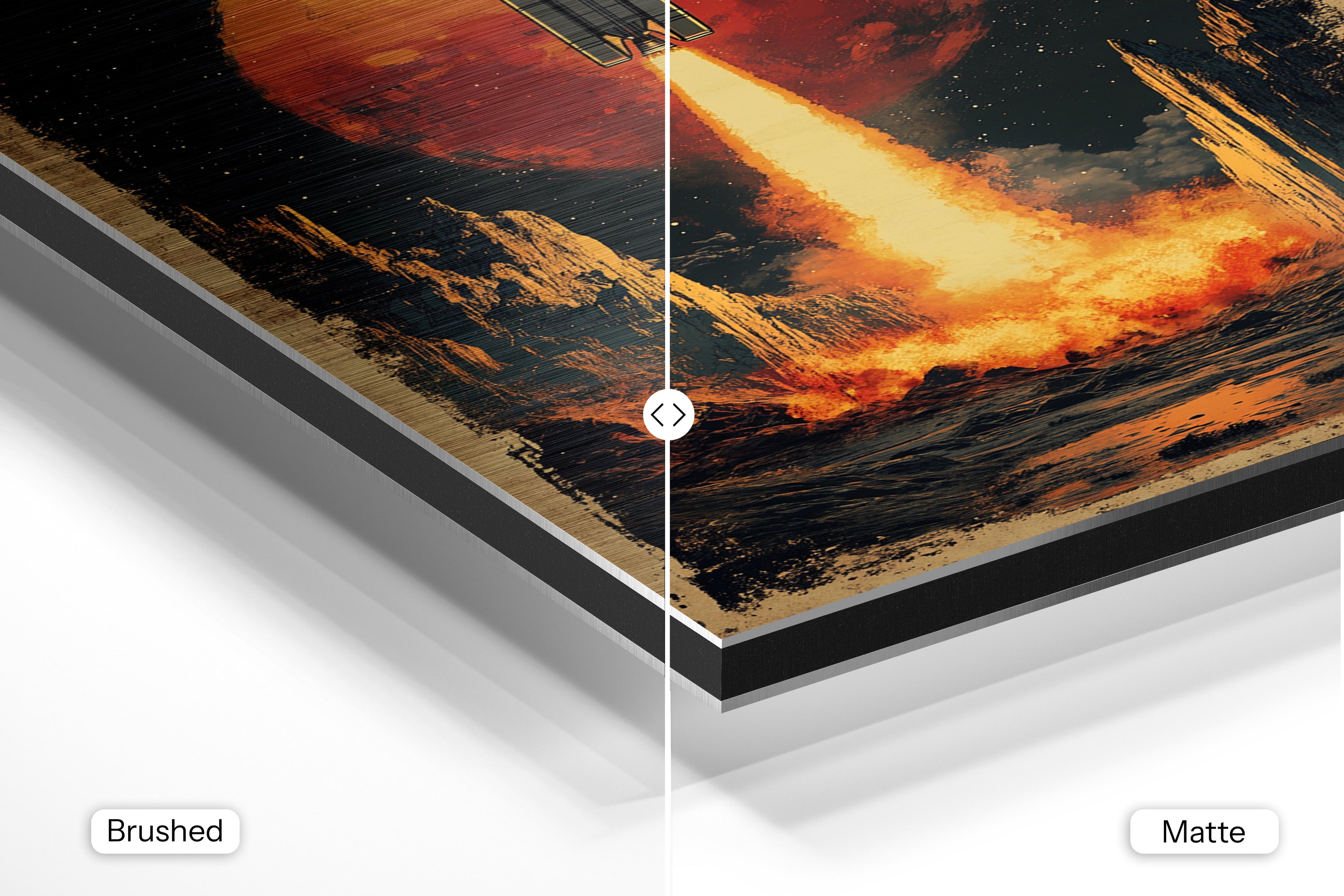 - Brushed Aluminum, on the other hand, features a raw metallic texture with visible brush strokes. Whites and highlights in your image let the silver surface show through, adding a dramatic, shimmering effect. Ideal for black-and-white images, minimalist designs, or abstract art, it creates a bold, industrial vibe with a modern edge.