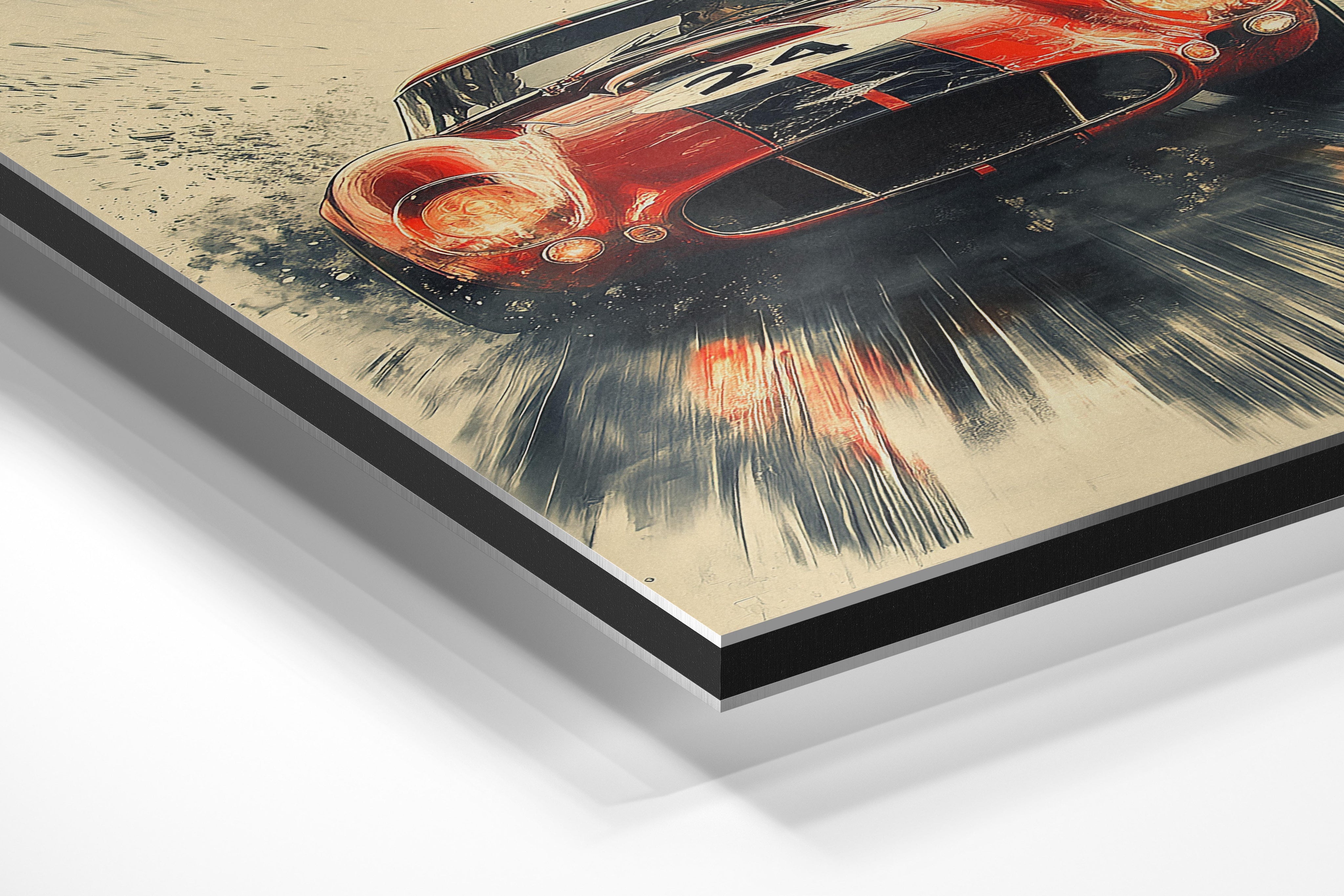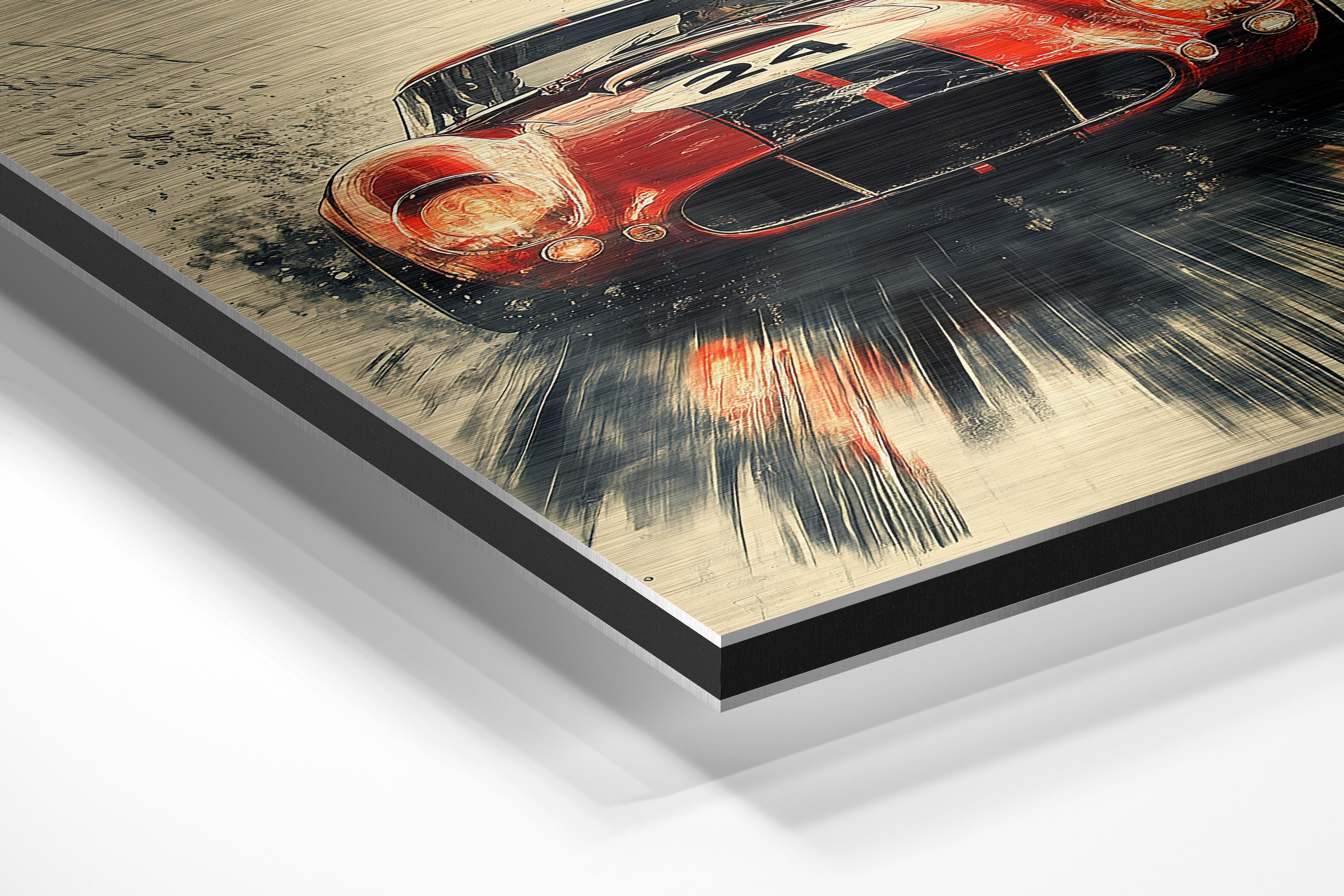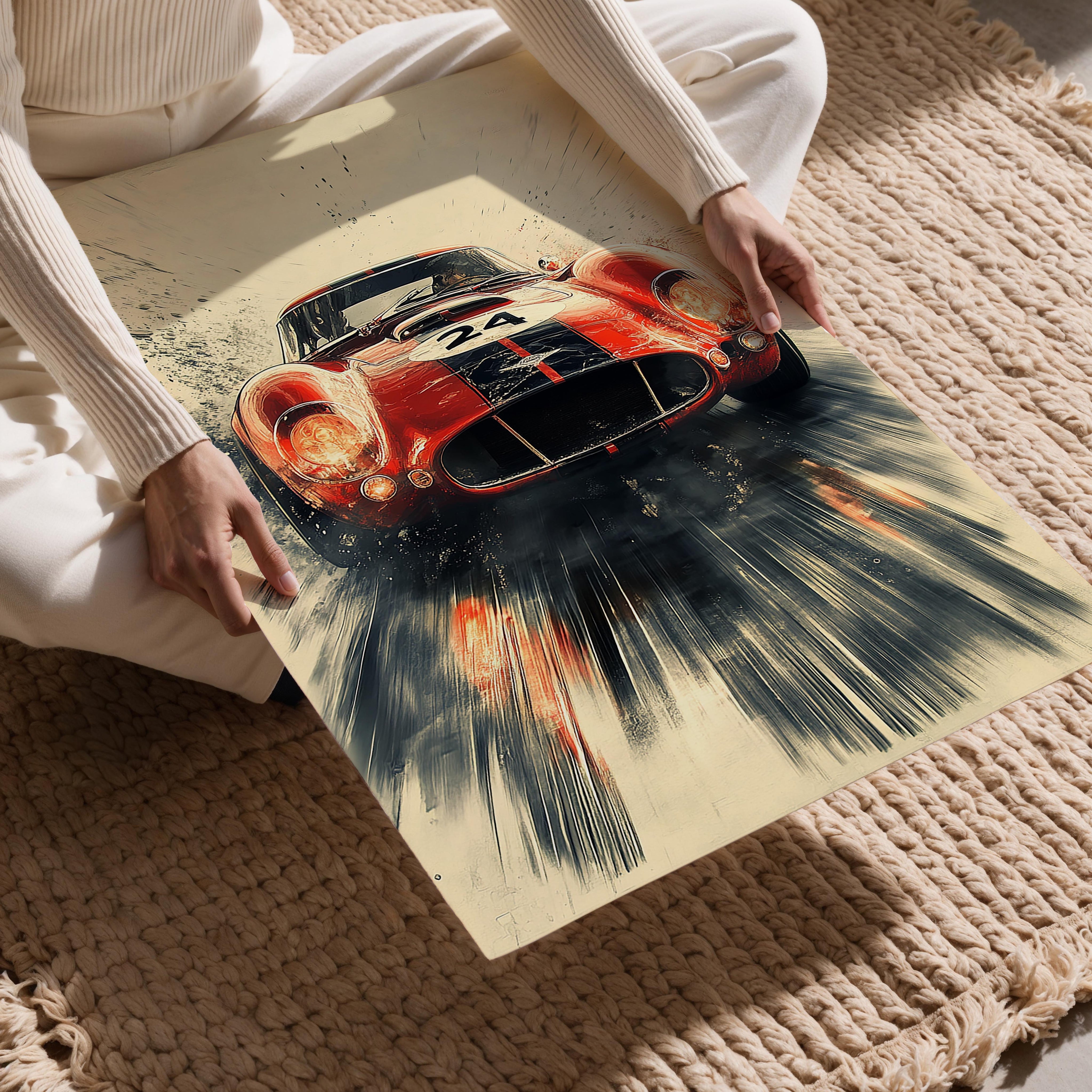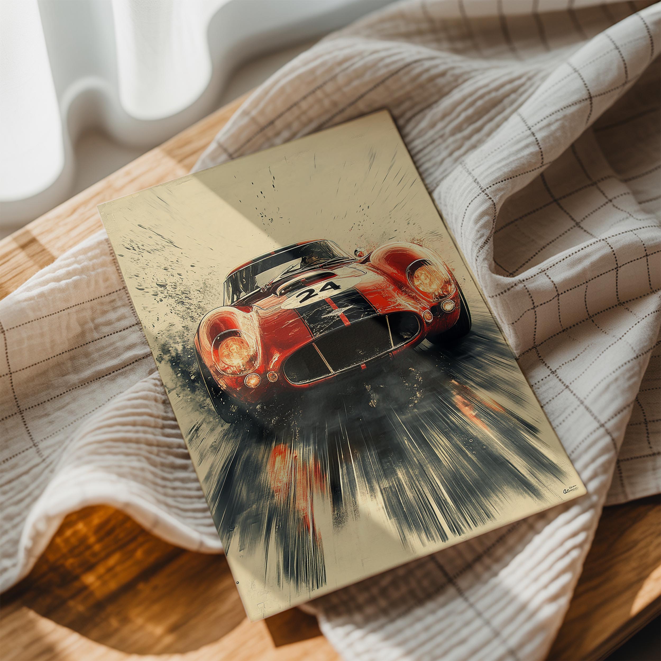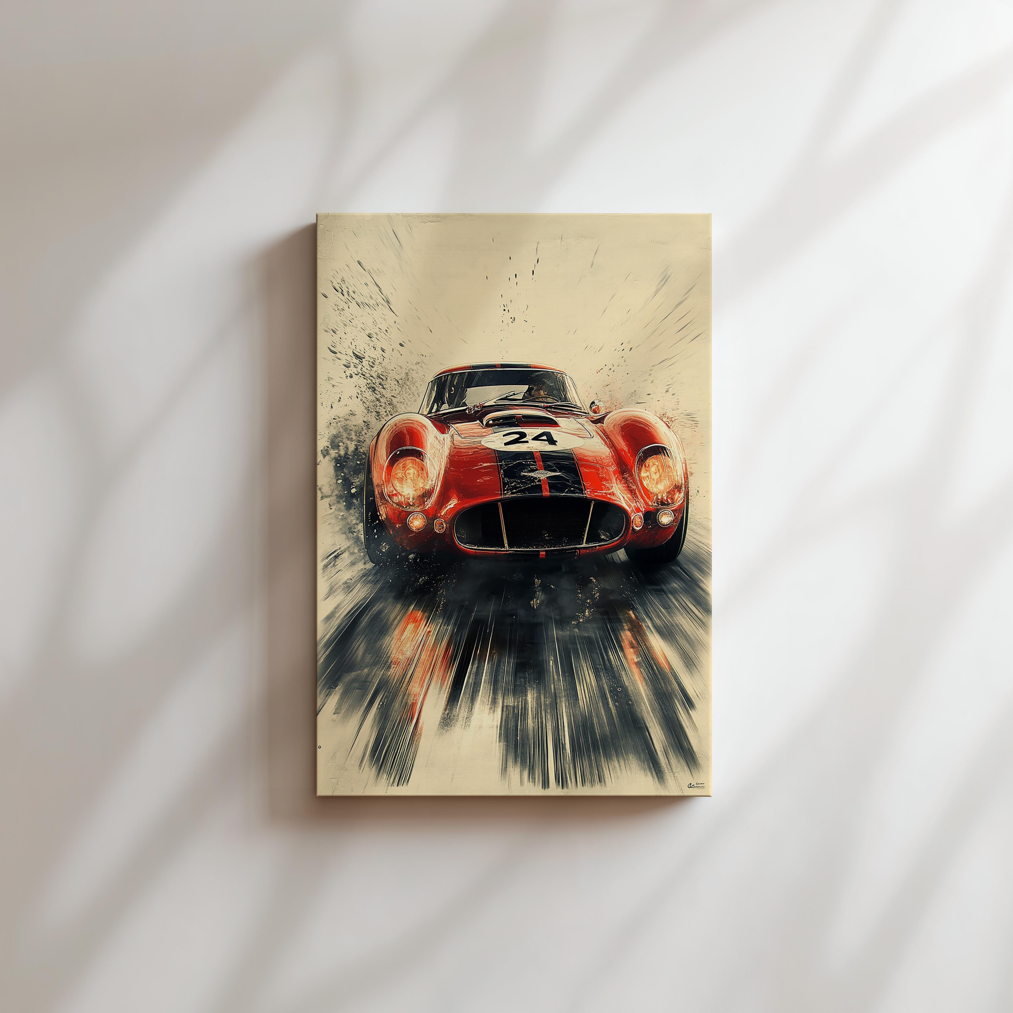 This action-packed illustration showcases a Ferrari-inspired red racing car surging forward with unrelenting power. The front view emphasizes its aggressive stance and aerodynamic design, while the blurred motion effect amplifies its speed. The vibrant red paint and bold racing number add a competitive spirit to the piece, making it perfect for auto enthusiasts or collectors. This piece would be a showstopper in a sports car showroom, a race-themed café, or a private collection of motorsport memorabilia.