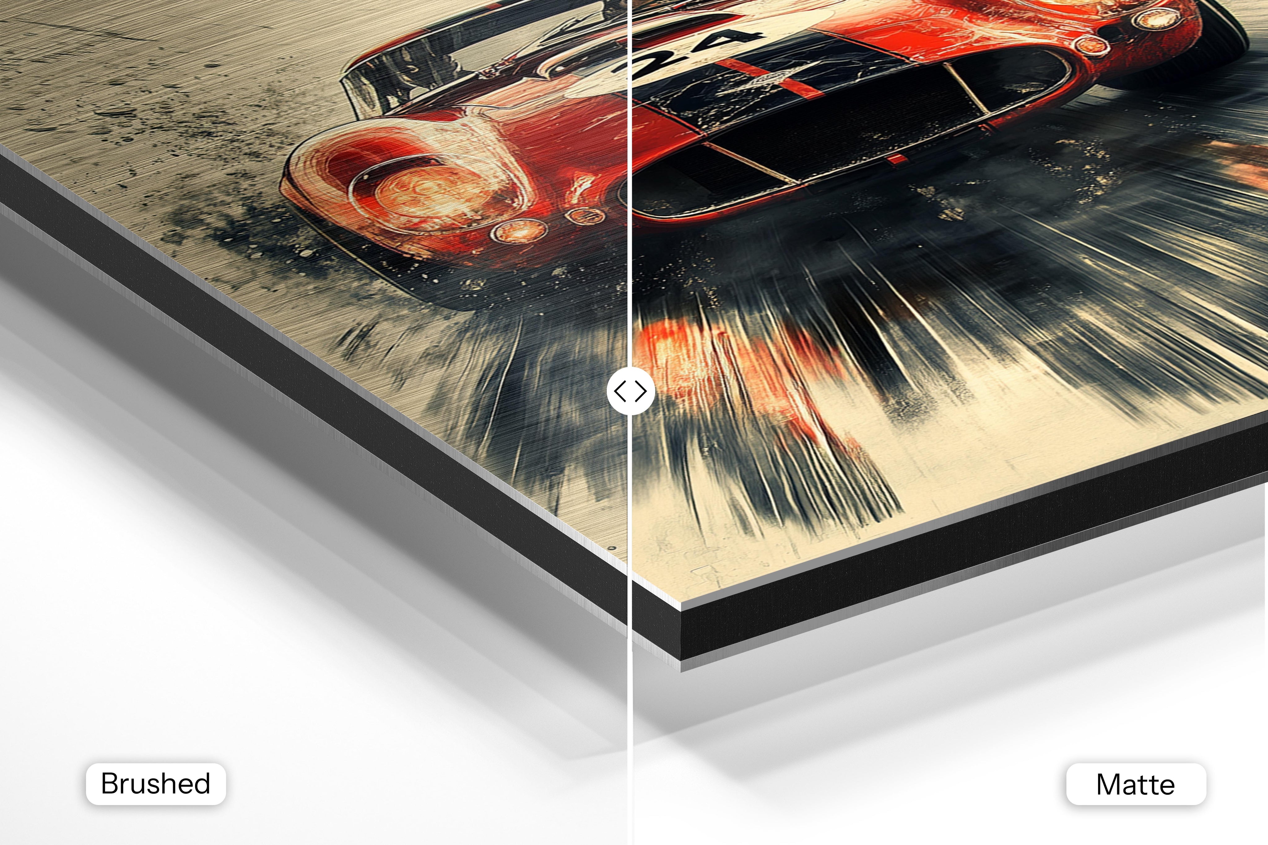 - Brushed Aluminum, on the other hand, features a raw metallic texture with visible brush strokes. Whites and highlights in your image let the silver surface show through, adding a dramatic, shimmering effect. Ideal for black-and-white images, minimalist designs, or abstract art, it creates a bold, industrial vibe with a modern edge.