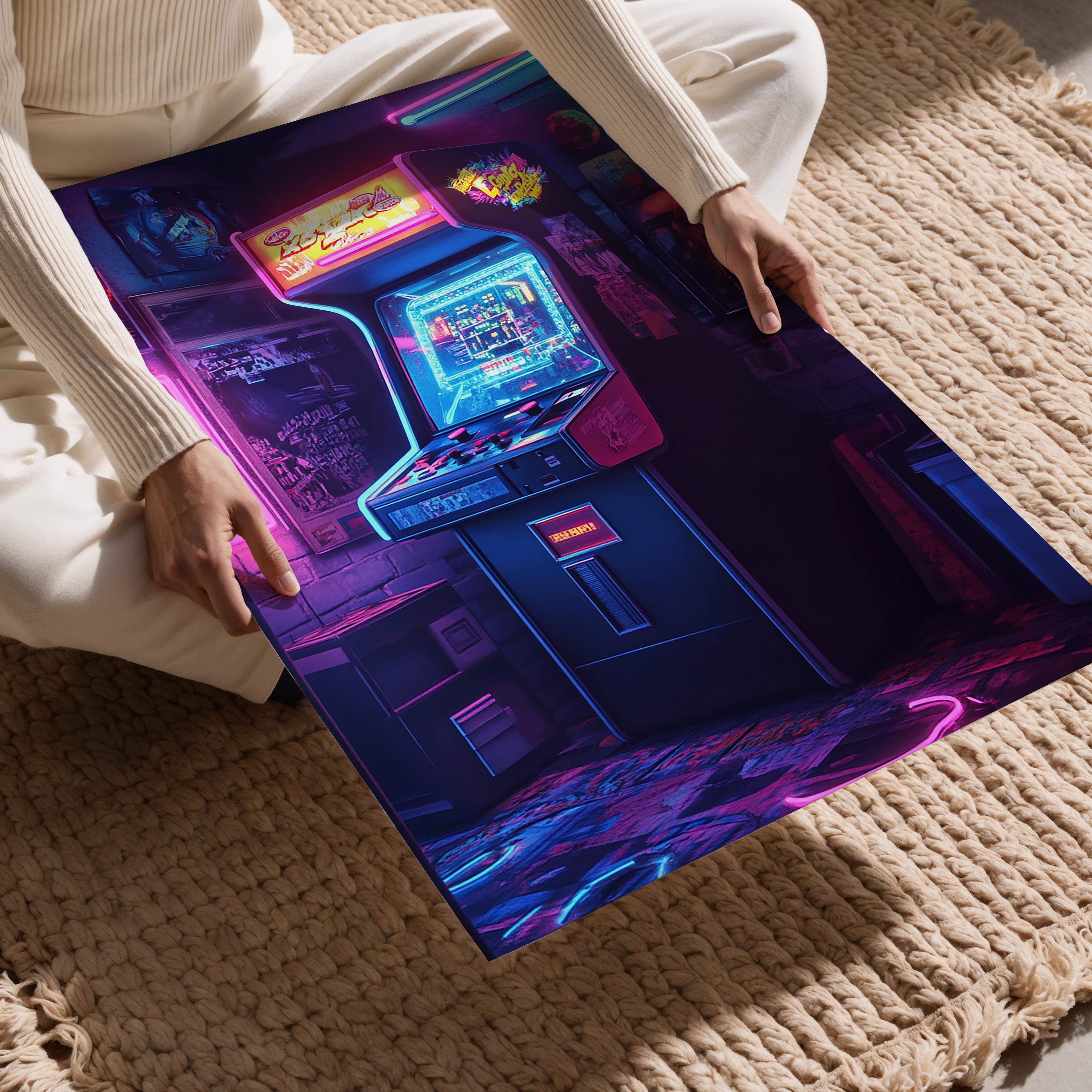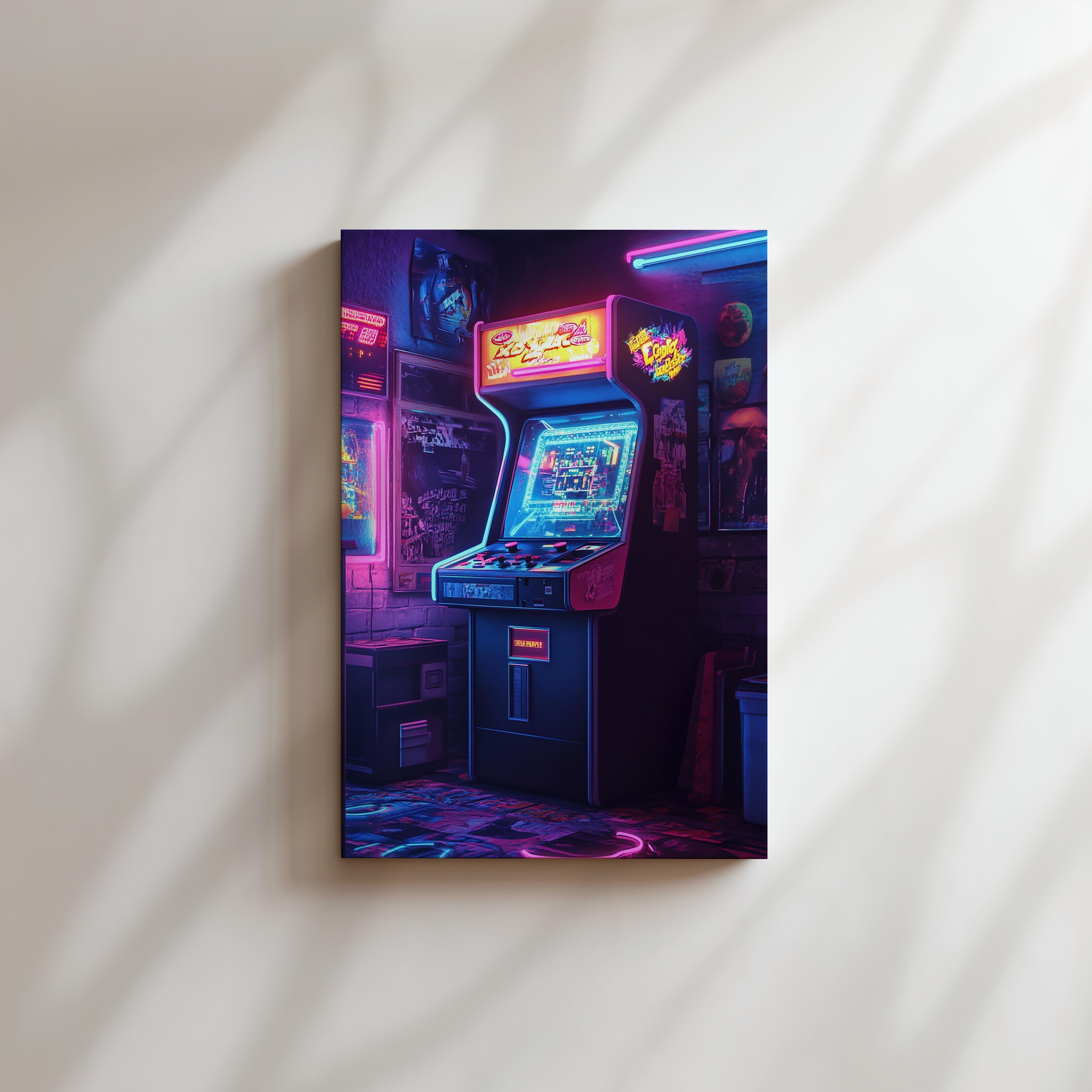 This nostalgic artwork captures the essence of a retro arcade setup, complete with glowing neon lights and vintage gaming ambiance. The detailed portrayal of the arcade machine, with its intricate lights and reflections, transports viewers back to the 80s and 90s gaming culture. Perfect for game rooms or entertainment areas, this piece is sure to spark conversations and evoke fond memories of classic gaming eras. Its vibrant colors and intricate details make it a centerpiece for any room celebrating retro culture.