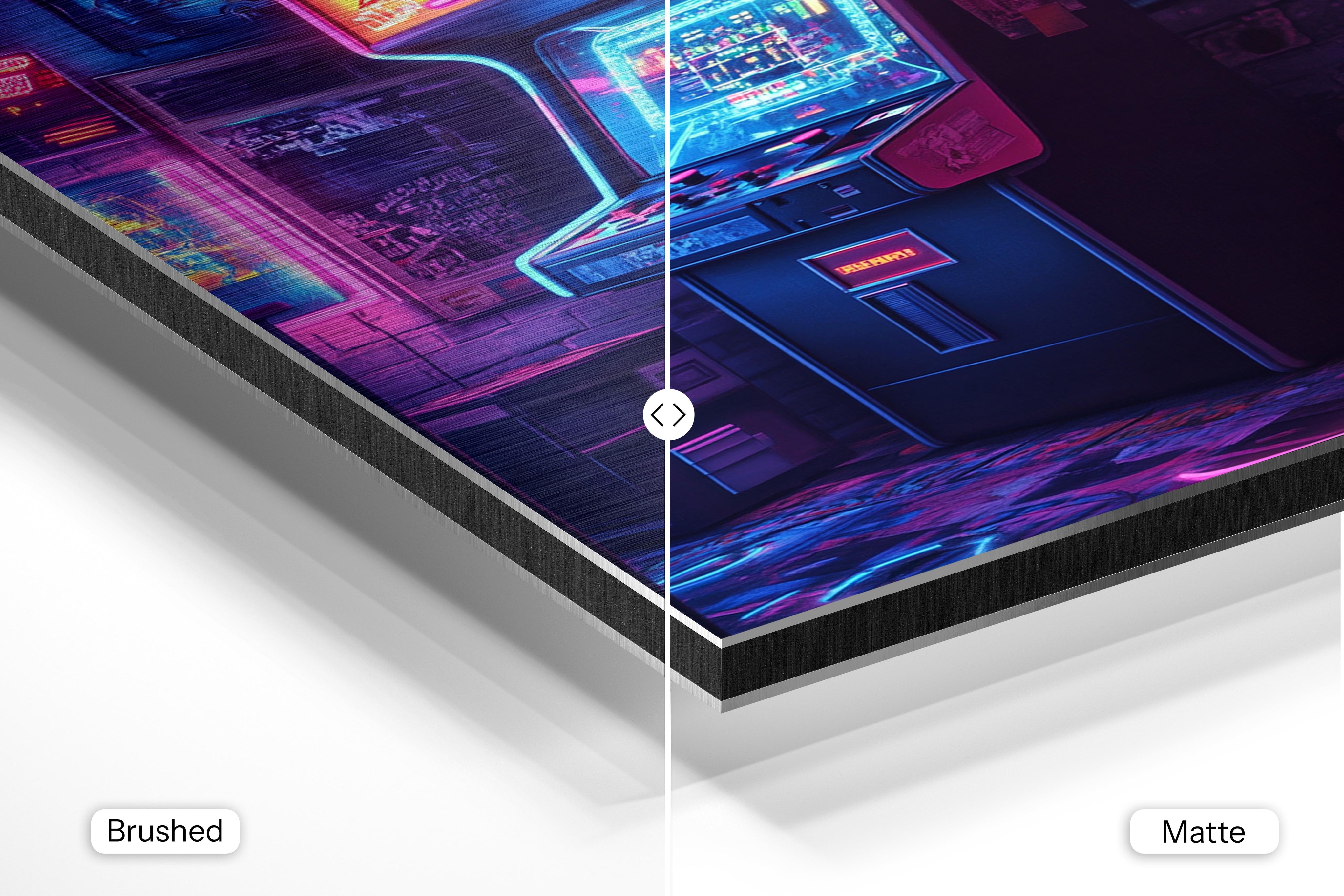 - Brushed Aluminum, on the other hand, features a raw metallic texture with visible brush strokes. Whites and highlights in your image let the silver surface show through, adding a dramatic, shimmering effect. Ideal for black-and-white images, minimalist designs, or abstract art, it creates a bold, industrial vibe with a modern edge.