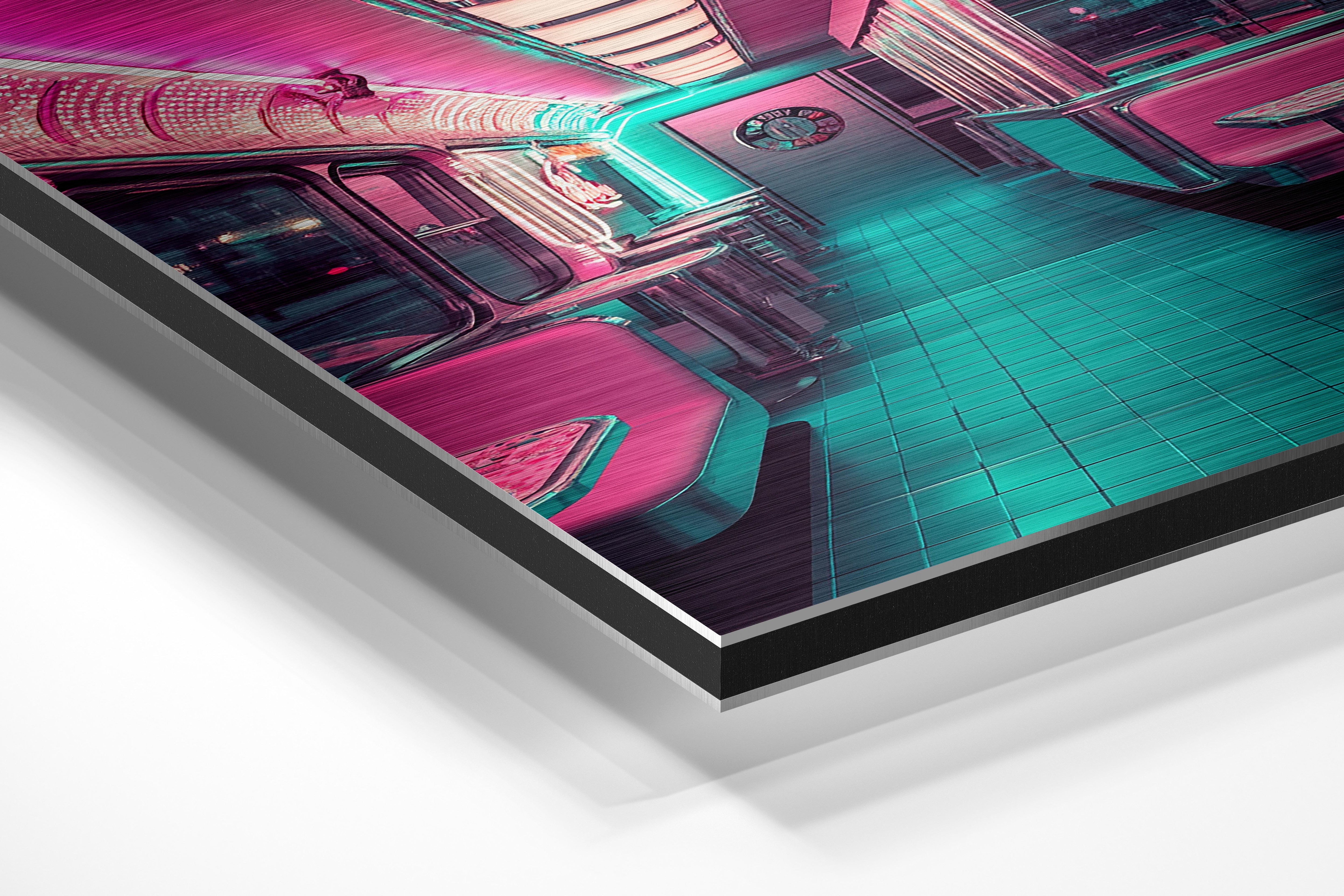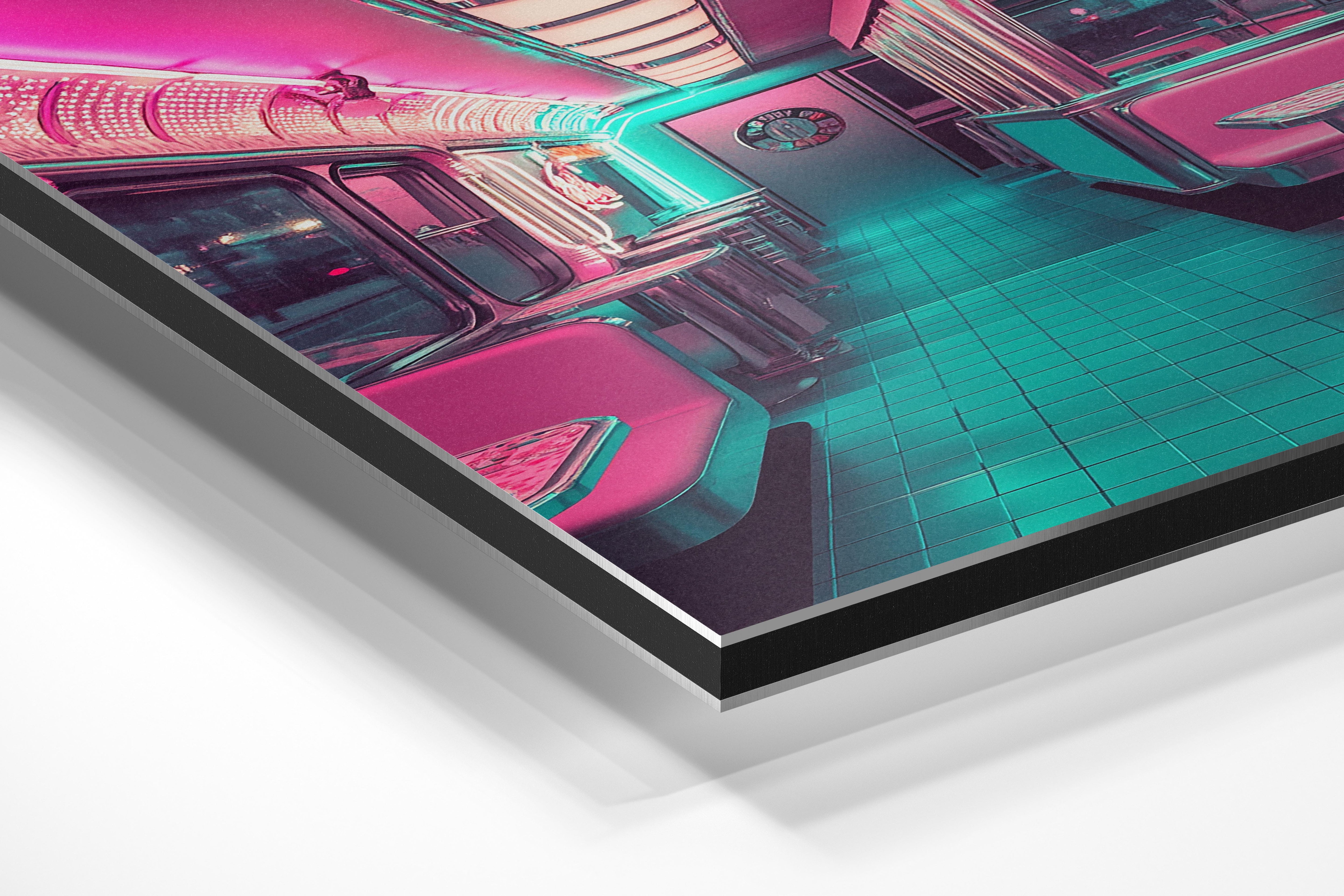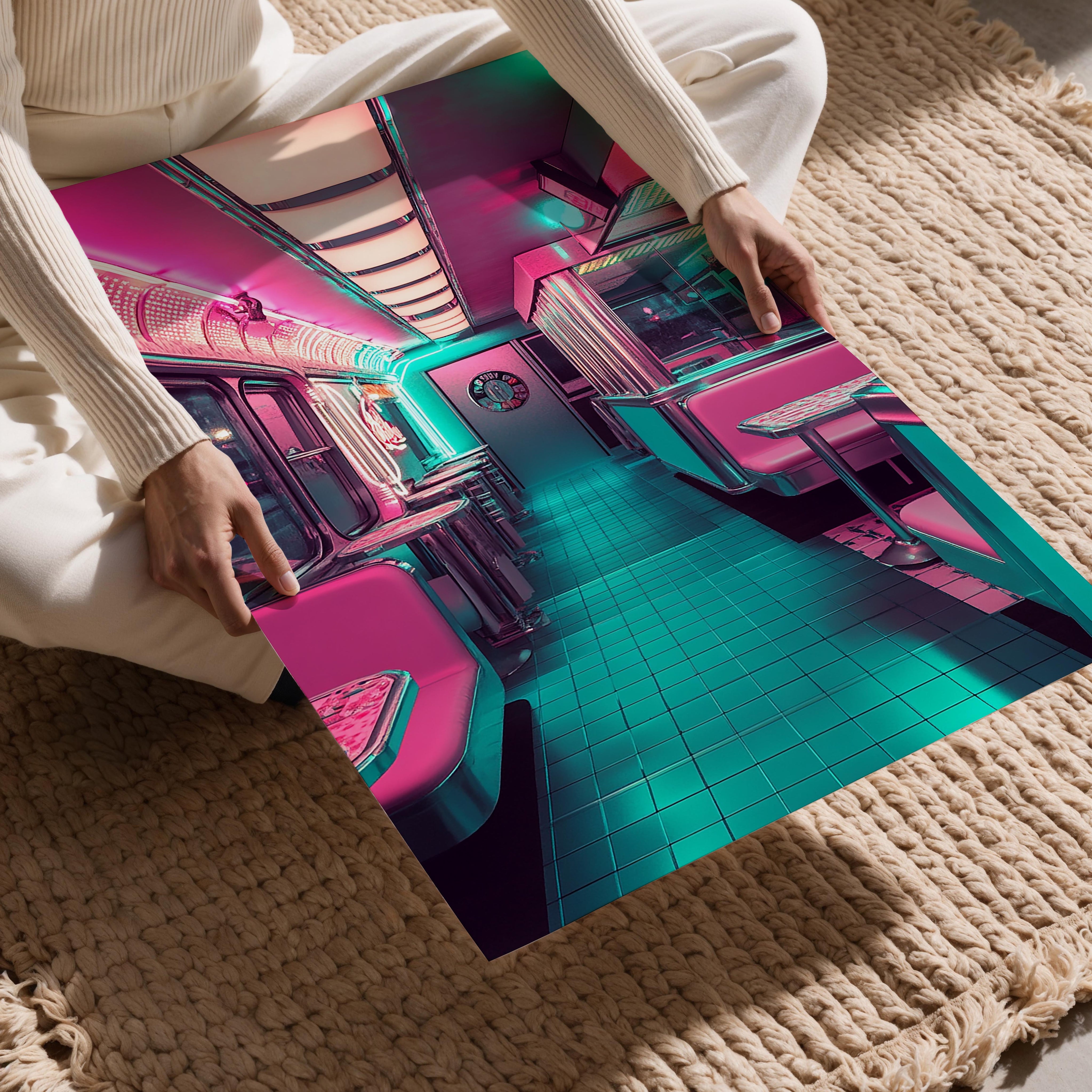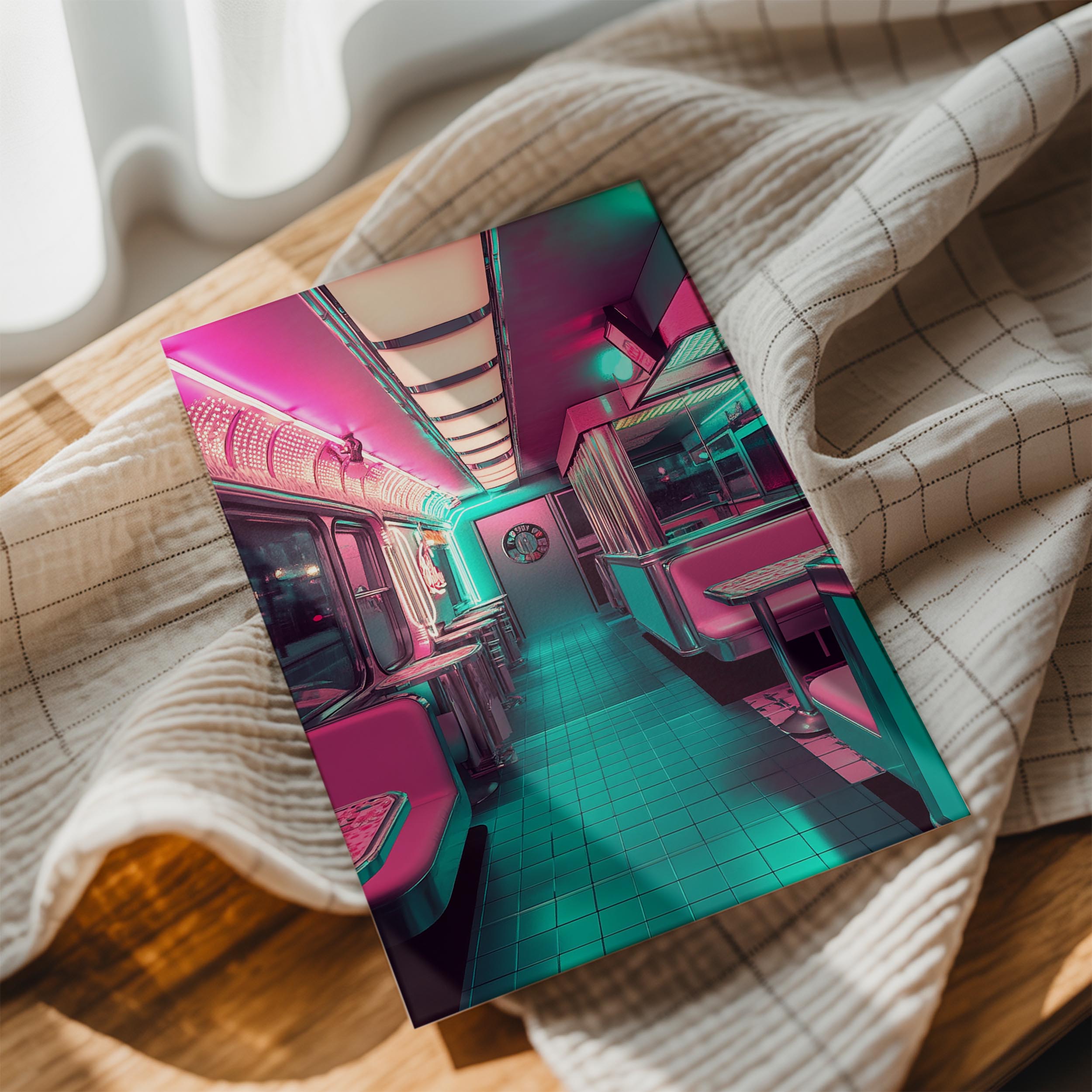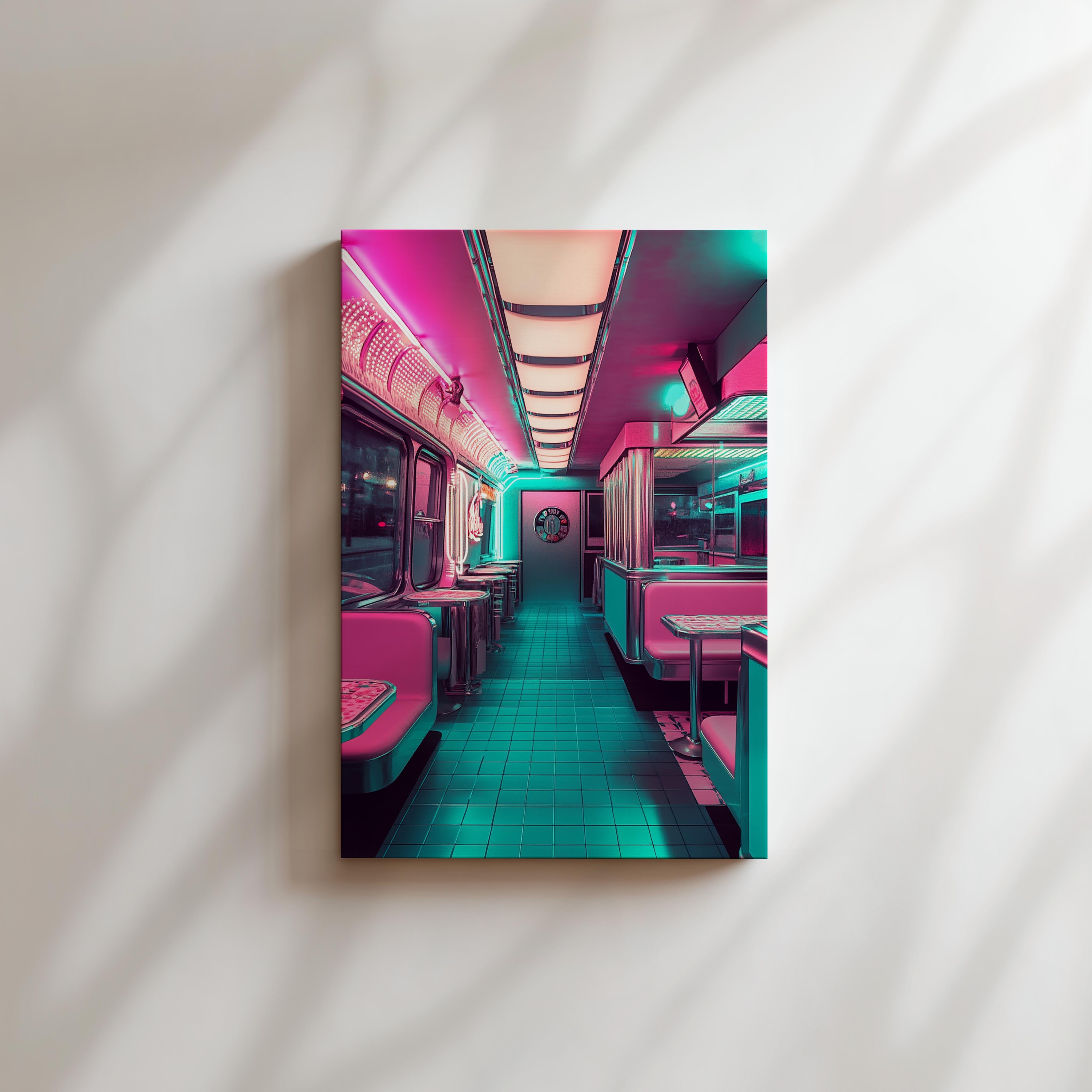 An evocative image of a retro diner interior bathed in neon lighting, capturing the essence of mid-20th-century Americana. The polished chrome and teal tiles contrast with the warm glow of neon signs, creating a nostalgic yet vibrant mood. Perfect for kitchens, dining areas, or themed spaces, this artwork brings a touch of vintage charm while remaining undeniably stylish. It invites viewers to step into a bygone era of classic diners and shared memories.