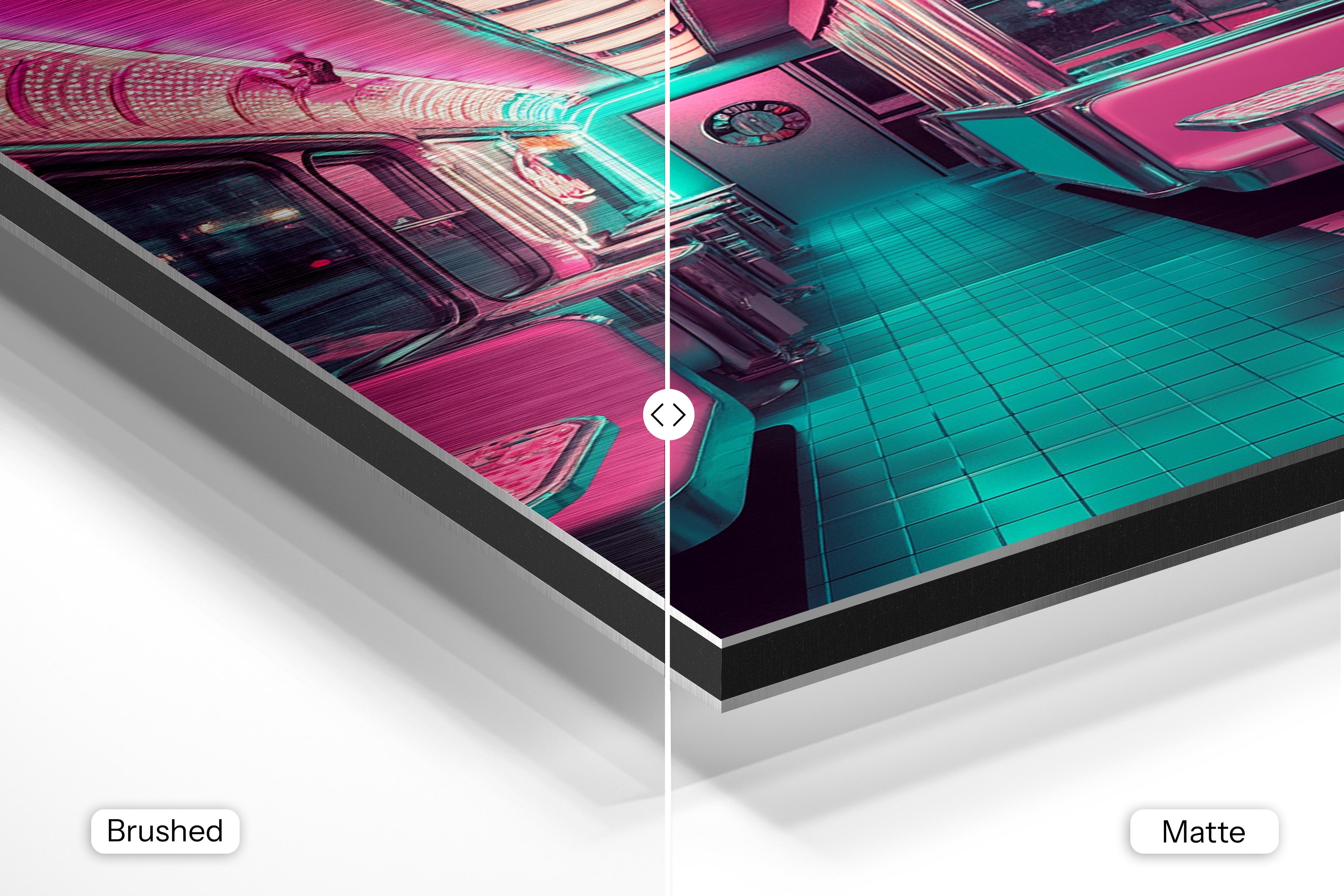 - Brushed Aluminum, on the other hand, features a raw metallic texture with visible brush strokes. Whites and highlights in your image let the silver surface show through, adding a dramatic, shimmering effect. Ideal for black-and-white images, minimalist designs, or abstract art, it creates a bold, industrial vibe with a modern edge.