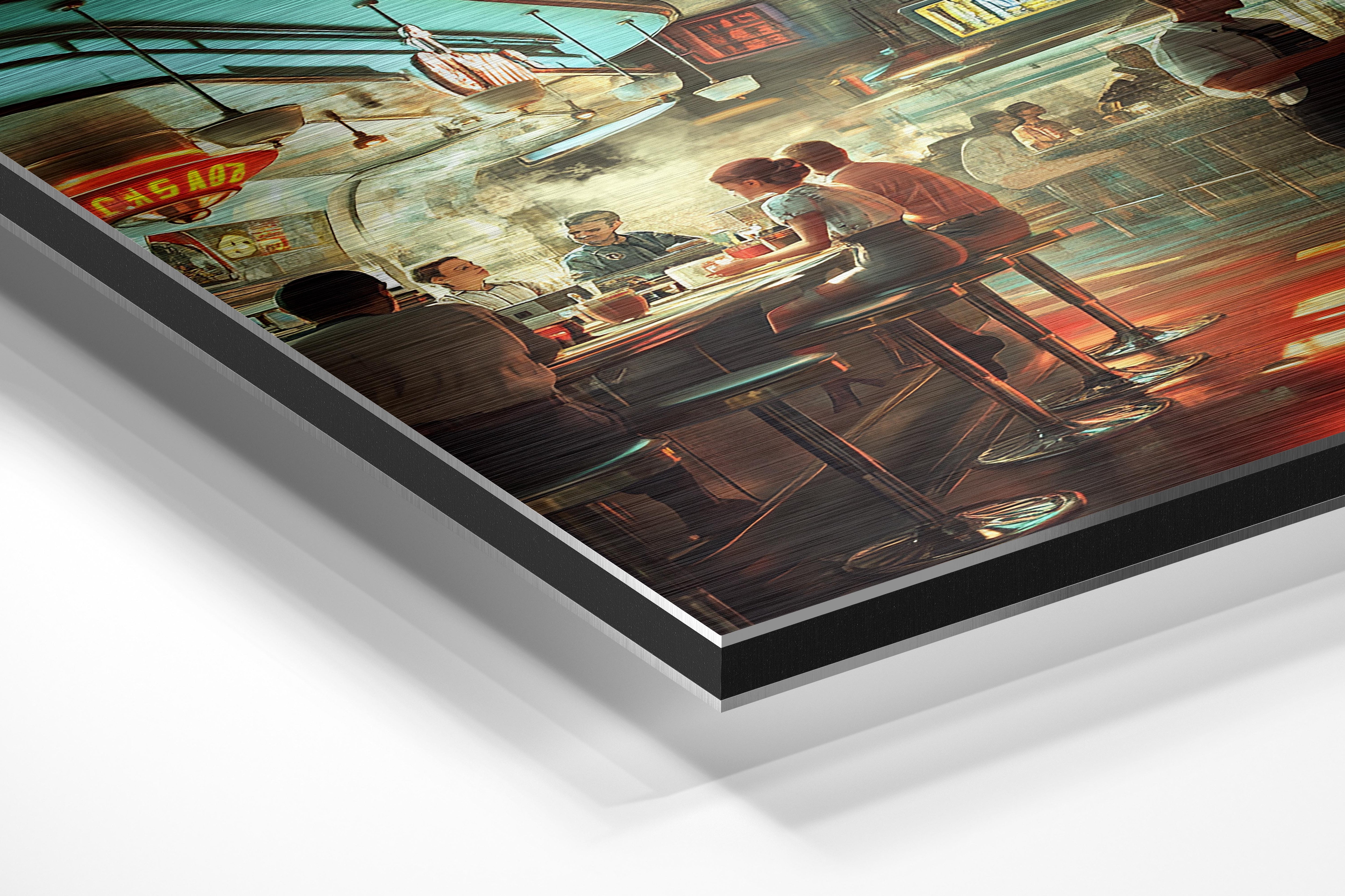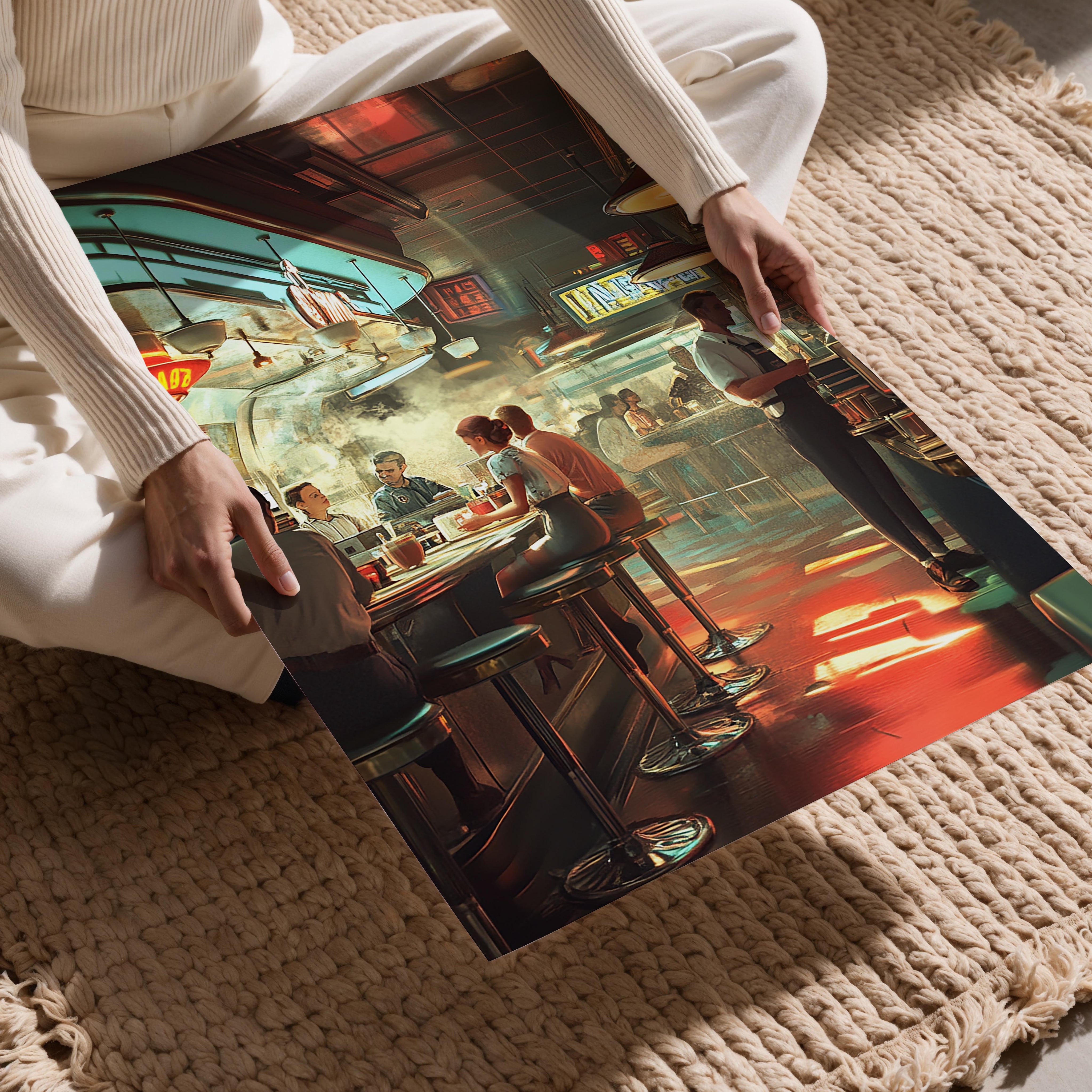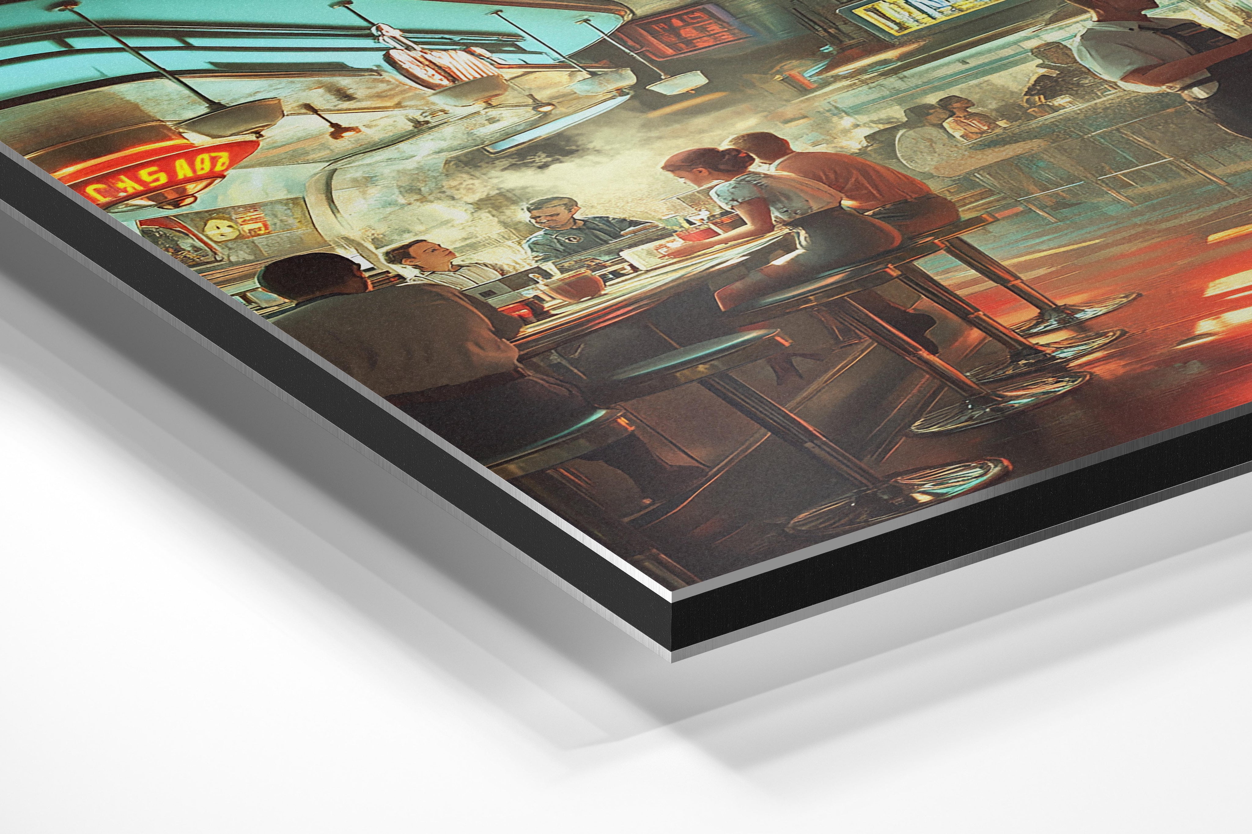 A beautifully detailed depiction of a bustling retro diner filled with warm light and vibrant colors. The nostalgic ambiance is captured through vintage decor, friendly patrons, and a sense of camaraderie. This artwork is ideal for creating a cozy, inviting atmosphere in kitchens, cafes, or spaces that celebrate Americana.