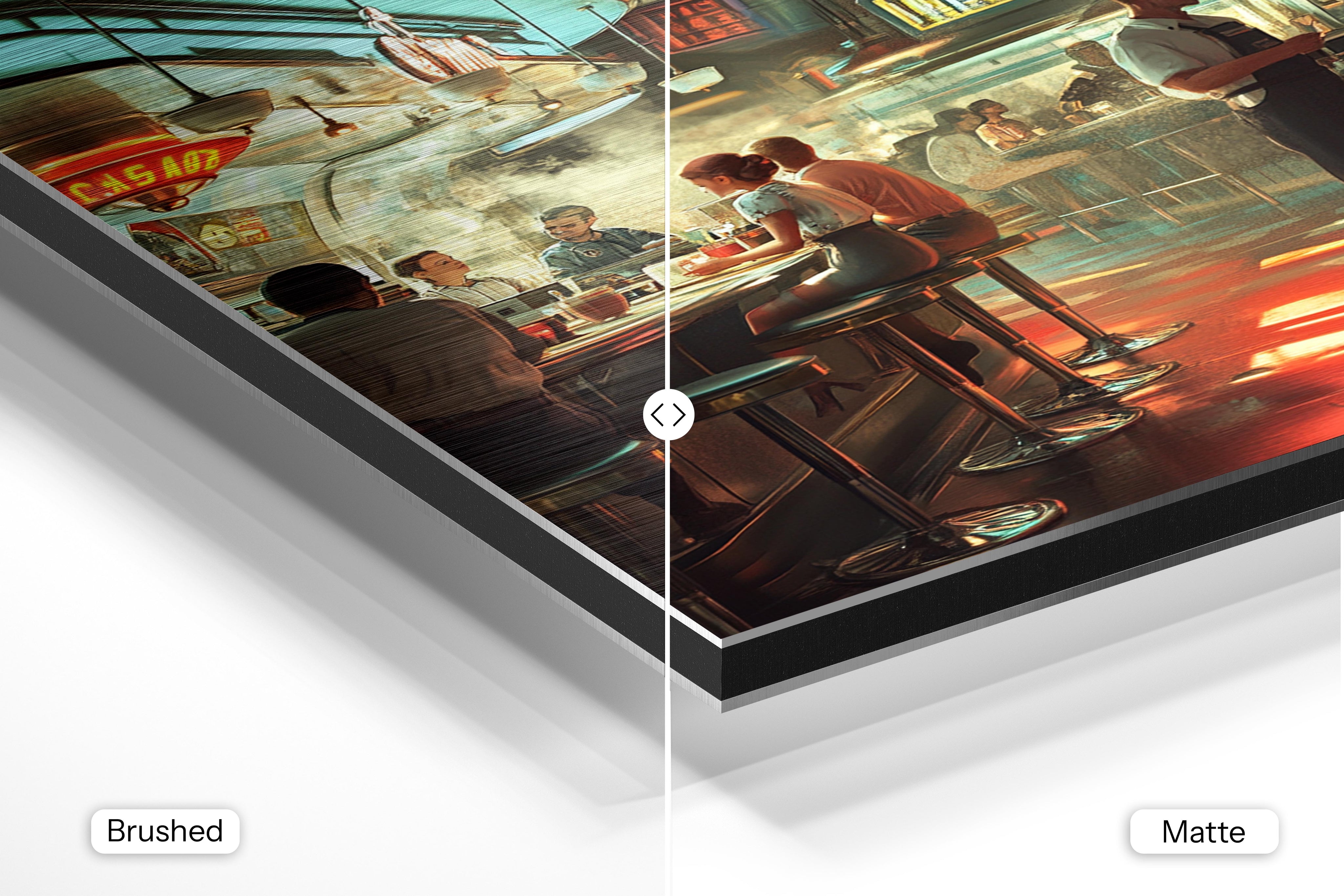 - Brushed Aluminum, on the other hand, features a raw metallic texture with visible brush strokes. Whites and highlights in your image let the silver surface show through, adding a dramatic, shimmering effect. Ideal for black-and-white images, minimalist designs, or abstract art, it creates a bold, industrial vibe with a modern edge.