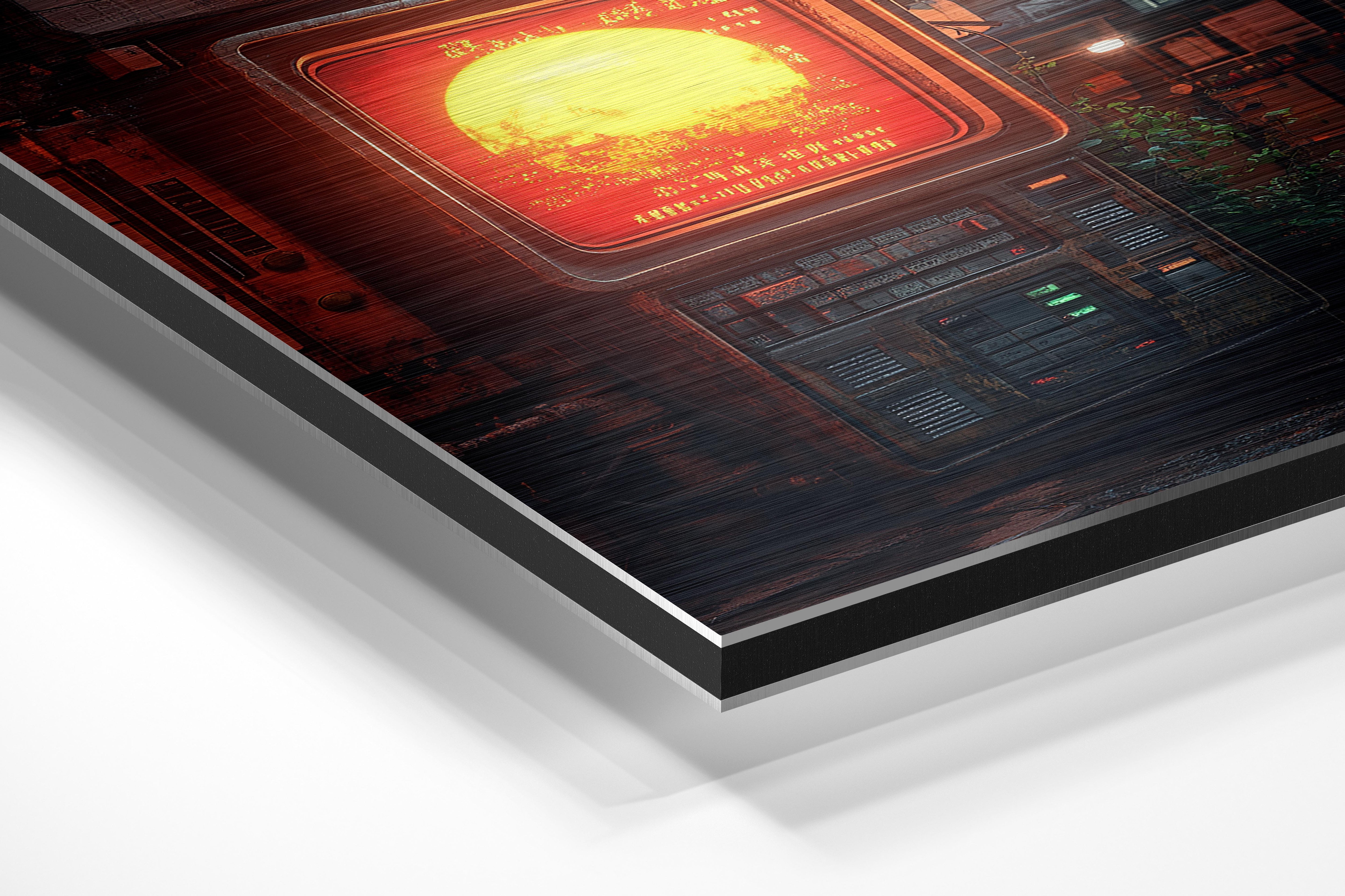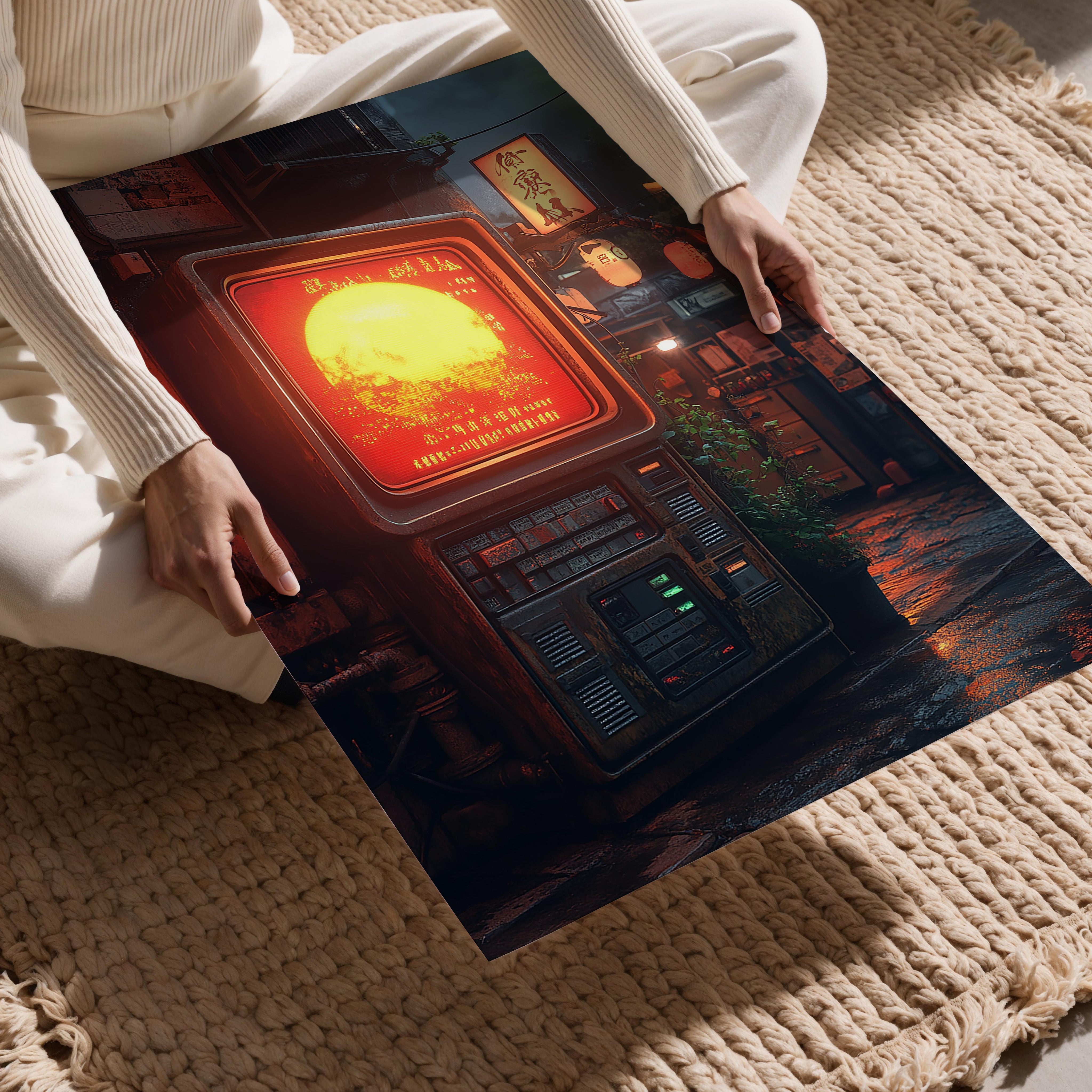 A vintage television displaying a vivid sunset, set in a nostalgic urban alleyway. The warm tones and retro-futuristic vibes make this artwork an engaging addition to lounges or entertainment spaces with a touch of retro flair.